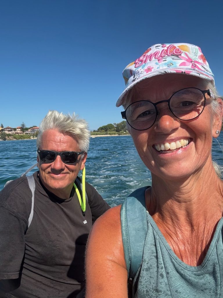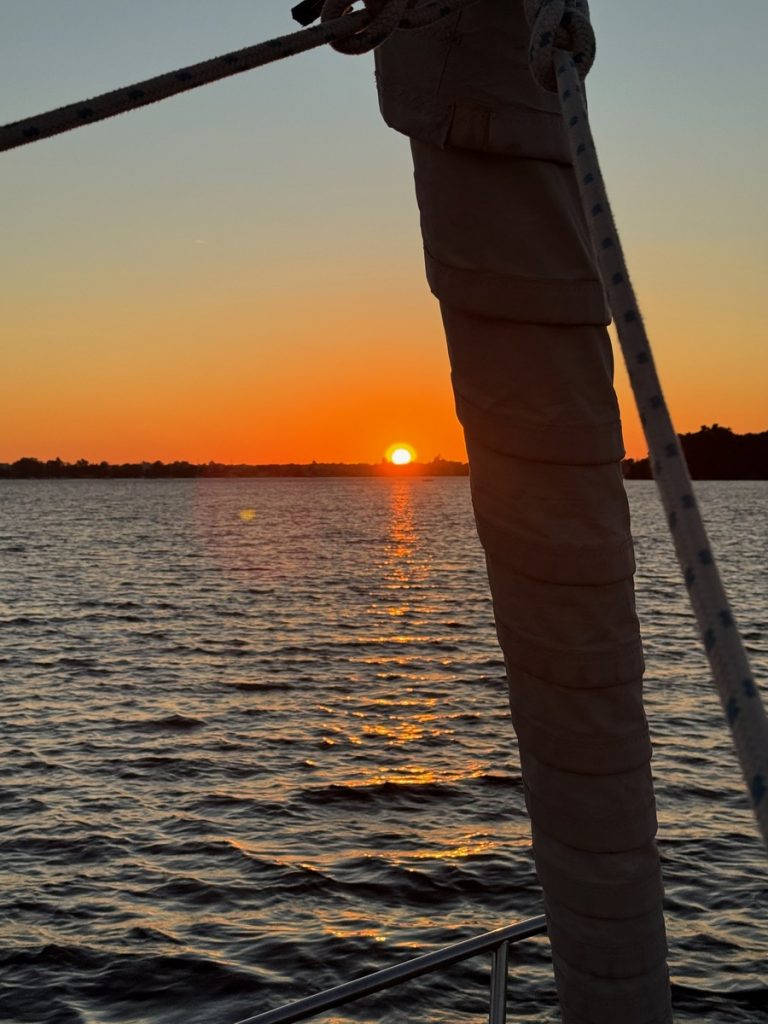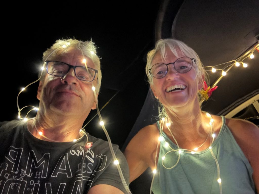 Abends haben wir uns zu einem Videowein mit der Möve-Crew verabredet. Die Möve liegt gerade in Kerteminde Dänemark und so wird es ein unterhaltsamer Abend von Cockpit (mit Kuchenbude) zu Cockpit mit Bimini. Dabei ist schön zu sehen, wie schnell es hier bei uns nach dem Sonnenuntergang dunkel wird und wie lange im Norden noch diffuses Licht vorherrscht. Selbst die installierte Lichterkette bringt kaum genug Licht in unser Cockpit, um unsere Gesichter zu beleuchten. Wir hängen uns kurzerhand die Lichterkette um den Hals… Derweil legen die Fischer um uns herum wieder ihre Netze aus – stört uns nicht, wir wollen morgen erst mit dem nachmittäglichen Westwind weitersegeln. Vor dem Schlafengehen, nehmen wir beide noch eine kühle Dusche auf der Badeplattform – welch ein Luxus!