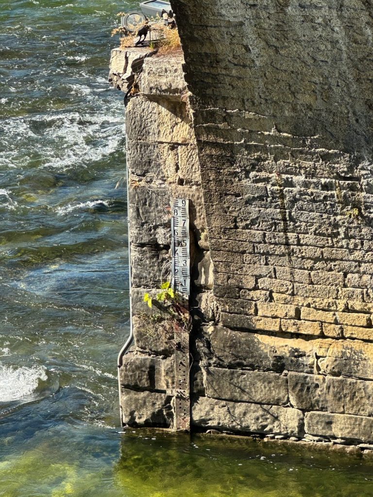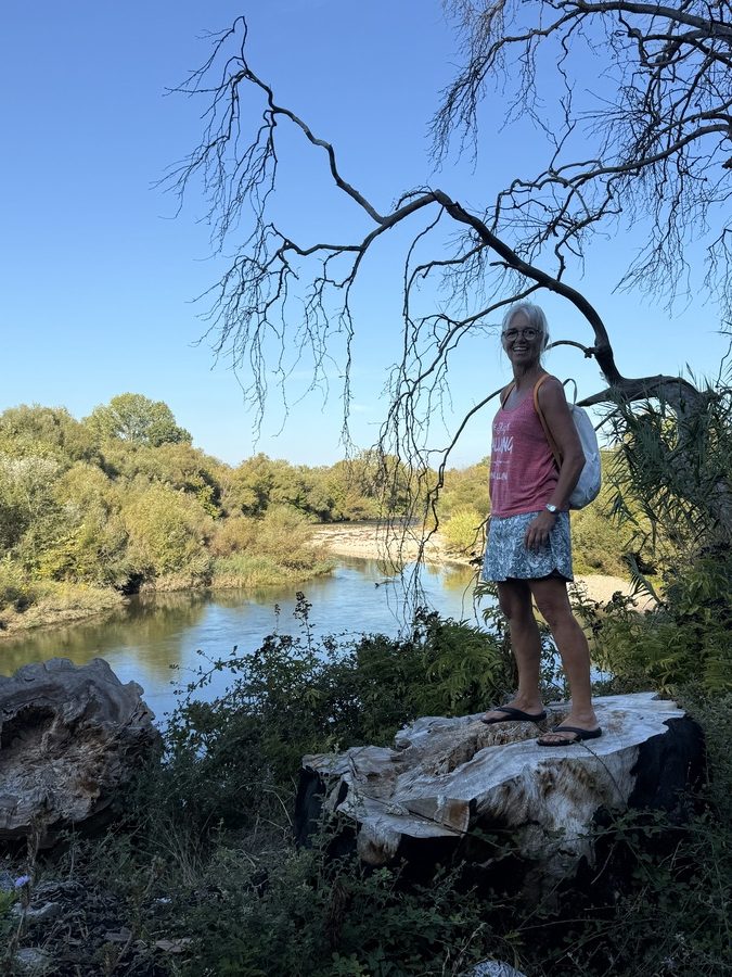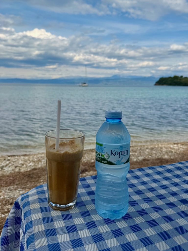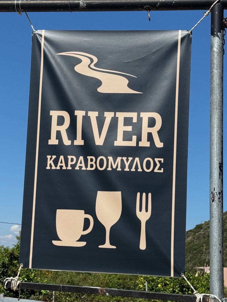 Nach drei Stunden reicht uns der städtische Trubel und wir machen uns auf den Rückweg. Nun fahren wir in praller Sonne, aber zumindest immer leicht abwärts. Nach der Hälfte der Strecke weist ein Schild auf ein Café am Fluss hin. Das klingt nach Schatten, kaltem Getränk und kühler Luft. Als wir ankommen, sieht es sehr verwaist aus. Die Stühle sind hochgestellt, aber eine junge Frau, zwei Kinder und ein Mann sitzen im Schatten der Bäume vor dem Haus. Auf unsere Frage, ob geöffnet sei, entbrennt eine kleine Diskussion: eigentlich ist geschlossen, aber man mag uns nicht abweisen und bietet uns schließlich Frappé (Eiskaffee) und Wasser an – wunderbar! Wir suchen uns ein Plätzchen im Schatten am Fluss und schauen den Fischen in der Strömung zu. Schnell sind hier die Strapazen der Radtour vergessen. Auch hier gestaltet sich die Kommunikation schwierig, mit englisch kommen wir nicht weiter und so behelfen wir uns mit Händen und Füßen und können erklären, dass wir aus Deutschland kommen und mit dem Boot reisen. Beides hinterlässt staunende Gesichter. Am Ende zahlen wir für zwei Flaschen Wasser und zwei Frappés 5€. Über das Trinkgeld von zwei Euro freut sich die junge Griechin wie ein Kind unter dem Weihnachtsbaum.