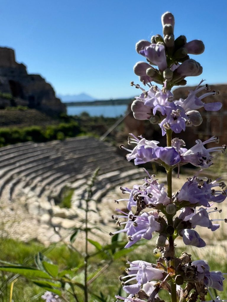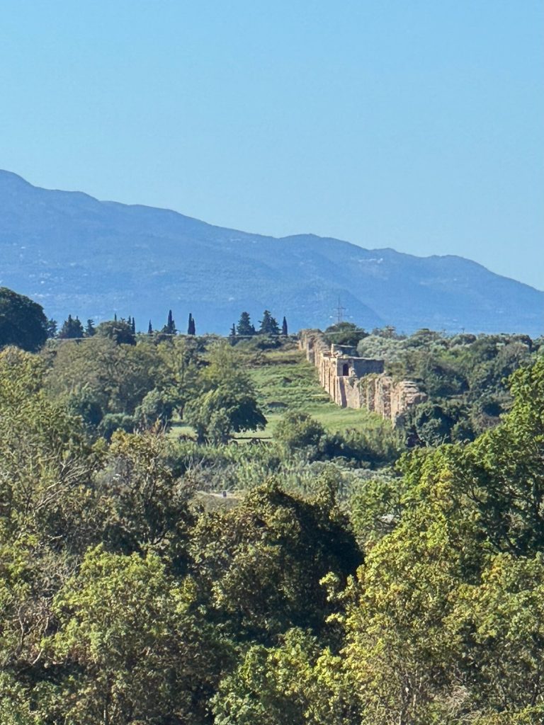 Nach dem Morgenkaffee brechen wir mit dem Dinghi auf zum Landgang. In fußläufiger Entfernung gibt es die Ausgrabungen des antiken Nikopolis (=Siegesstadt) zu besichtigen. Die Stadt wurde 31 v.Chr. durch Octavian, den späteren Kaiser Augustus gegründet, nachdem er bei der vor der Küste stattfindenden Seeschlacht gegen Marcus Antonius und Kleopatra im Machtkampf um die Nachfolge Julius Caesars gesiegt hatte. Der Stadt wurden politische und finanzielle Privilegien eingeräumt und ihre Lage an der Mazoma-Lagune stattet sie zudem mit einem geschützten Naturhafen aus. Über ein ca. 50 Kilometer langes Aqäudukt wurde die Stadt, die in ihrer Blütezeit bis zu 320.000 Einwohner gezählt haben soll, mit Frischwasser aus dem Arachthos-Fluss versorgt. Octavian verfügte zudem, das „Actia“ genannte Festspiele alle vier Jahre hier stattfinden sollten. Diese waren von ihrem Umfang mit den olympischen Spielen vergleichbar, beinhalteten aber zusätzlich musikalische und schauspielerische Wettspiele. Für uns ist heute fußläufig nur das dafür genutzte Amphitheater erreichbar. Wir erreichen es kurz vor Beginn der Öffnungszeit um 10:00 Uhr. Wir haben im letzten Jahr schon einige spektakulärere Theater besichtigt, aber hier fesselt uns die Geschichte. Und die Bauweise, die nicht komplett auf der Rückseite von einem Berghang gestützt wird. Hier wurden aufwendige Befestigungsmauern errichtet, um die Zuschauerhänge zu stützen. Zudem gab es einen großen Baldachin, der die Gäste vor der Sonne schützte. Die weiteren Ausgrabungsstätten liegen einen mindestens zwei Kilometer langen Fußmarsch entlang der recht stark befahrenen Straße nach Preveza. Das wollen wir uns nicht antun.