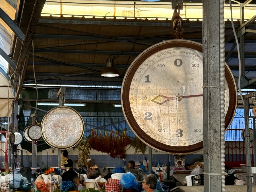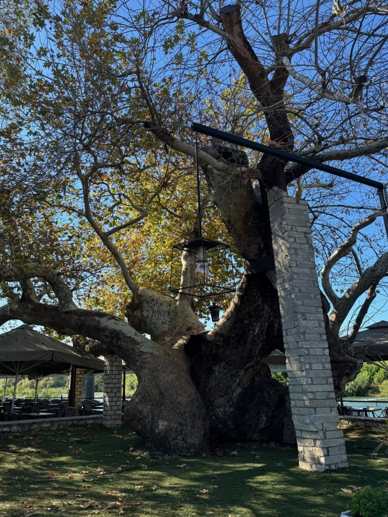 Gleich neben der Brücke findet sich ein Naturdenkmal: die älteste Platane Griechenlands. Sie wird von Eisen und gemauerten Stützen am Auseinanderbrechen gehindert. Unter ihren Ästen stehen die Tische einer Taverne und laden zum Verweilen ein. Für uns ist es aber noch zu früh zur Einkehr. Wir wenden uns der Altstadt zu. Barbara hatte gelesen, dass es eine sehenswerte Markthalle geben soll. Auf dem Weg dorthin kommen wir in der Einkaufszone an einer Kirche neueren Datums vorbei. Da es unterdessen ziemlich warm geworden ist, beschließen wir das kühle Innere anzusehen. Die Wände sind über und über mit Ikonen bemalt und unter dem zentralen Gewölbe hängt ein riesiger Lüster. Laufend kommen Menschen aller Altersgruppen herein, kaufen bei der „Kerzenfrau“ ein paar Kerzen, die sie anzünden. Es gibt viele Griechen, die ihren Glauben in dieser Weise praktizieren.