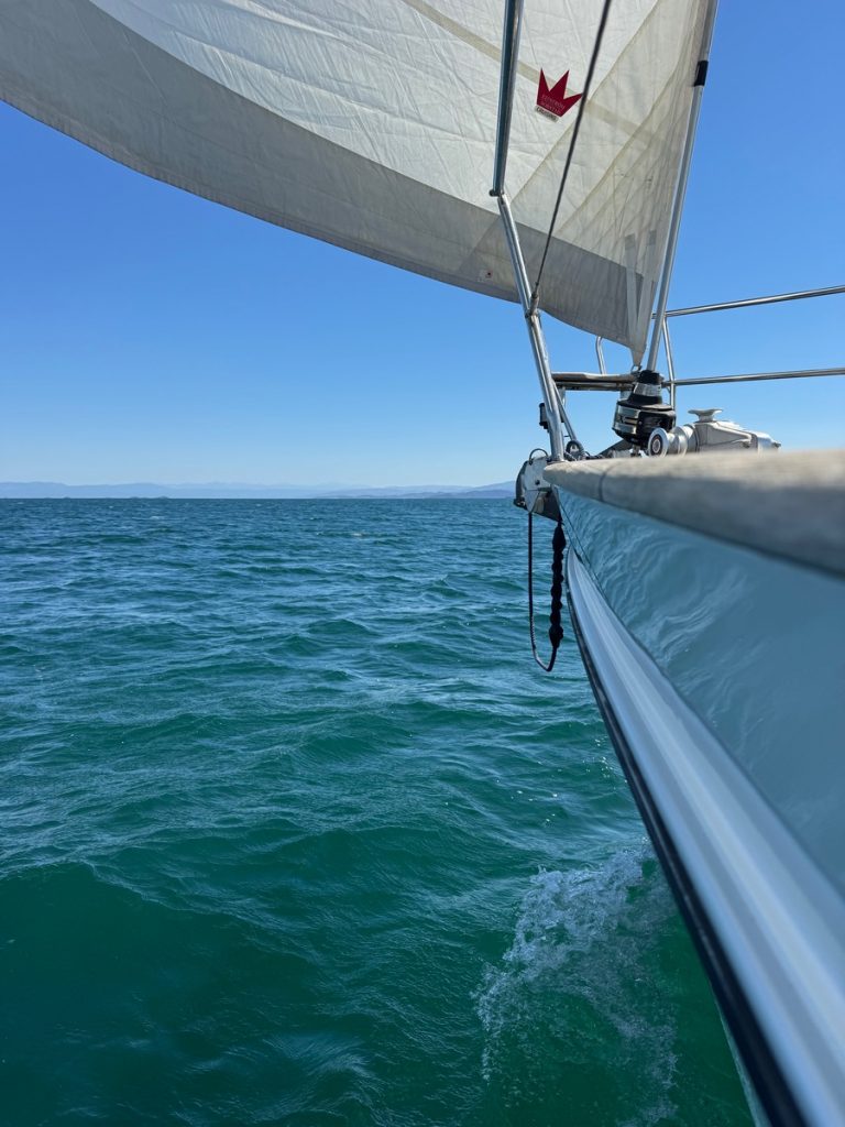 Zum Abschied streckt „unsere“ Schildkröte noch einmal den Kopf und eine Flosse aus dem Wasser – es sieht aus, als würde sie uns zum Abschied winken! Wir rollen noch vor Anker die Genua aus und ziehen so ganz leise in langsamer Fahrt aus der Bucht. Der Wind nimmt beständig zu und so beschleunigt Venga! nur unter Vorsegel bei einem Raumschotkurs schnell auf 5 Knoten. Wir halten derweil konstant Ausschau nach Fischereibojen und Schildkröten. Aber von beidem ist auf der ganzen Tour nichts zu sehen.