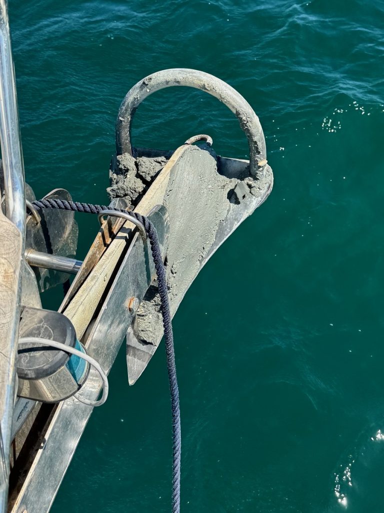 Wir kehren in der Mittagshitze zum Boot zurück, nehmen ein erfrischendes Bad und lichten den Anker, als der westliche Seewind einsetzt. Der Anker ist komplett mit Schlick-Kleie bedeckt – kein Wunder, er hat so wunderbar gehalten!
