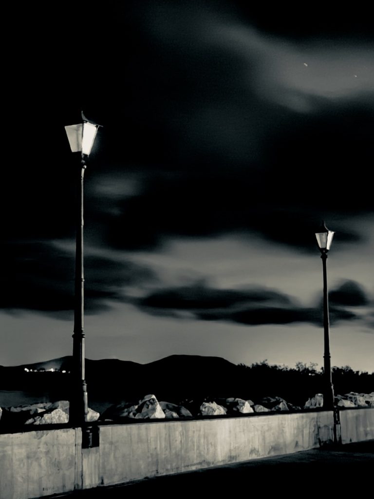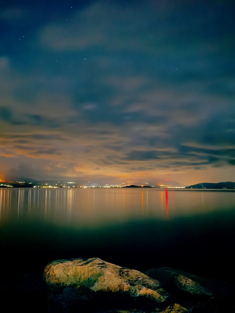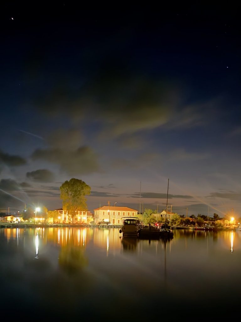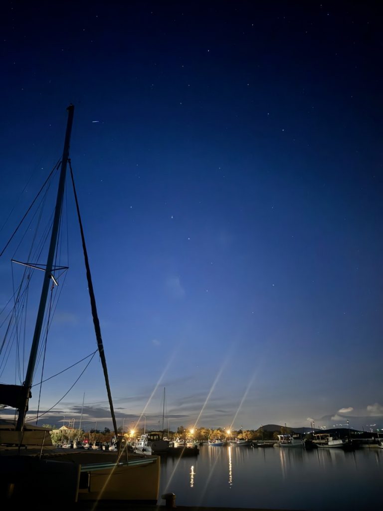 Der Abend überrascht uns mit einer besonderen Atmosphäre im Hafen. Die Lampen sind nicht eingeschaltet, von der anderen Hafenseite schallen die Stimmen der griechischen Fischer herüber, es ist vollkommen windstill und lau. Über uns stehen unzählige Sterne am Himmel. Barbara versucht an Fotos. Die Langzeitbelichtung an Bord ist immer sehr schwer, weil sich das Boot immer bewegt, aber hier auf der Mole ist das anders.
