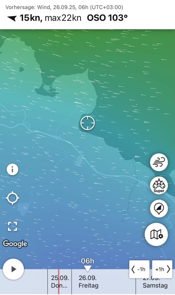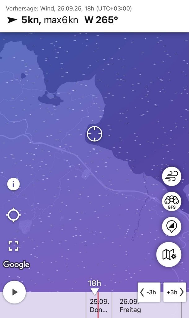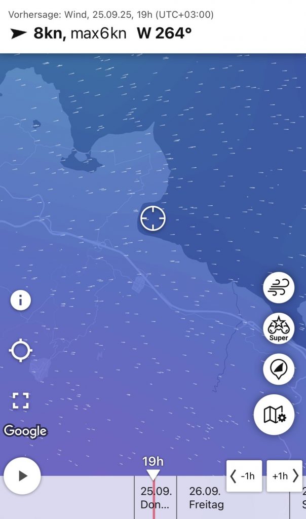 Während Werner kocht, schaut Barbara nochmals in die Wetterapps. Bei Windfinder gibt es mit dem „Forecast“ und dem „Superforecast“ zwei verschiedene Wettermodelle. Letzteres sagt für die Nacht beginnenden Wind aus Osten voraus. Das ist genau die offene Seite unserer Bucht. Der Wind soll danach bis zum Morgen beständig zulegen und in Böen 22 Knoten erreichen. Wir wissen aus dem letzten Jahr, dass unser Anker mit Winddrehungen um 180° nicht gut zurechtkommt. Der Ankeralarm ist sowieso gesetzt. Zur Sicherheit legen wir aber auch warme Kleidung, Stirnlampen und Schwimmwesten bereits, falls wir in aller Herrgottsfrühe durch den Ankeralarm geweckt werden und die Bucht verlassen müssen. Wir hoffen, dass die anderen Wettervorhersagen Recht behalten…