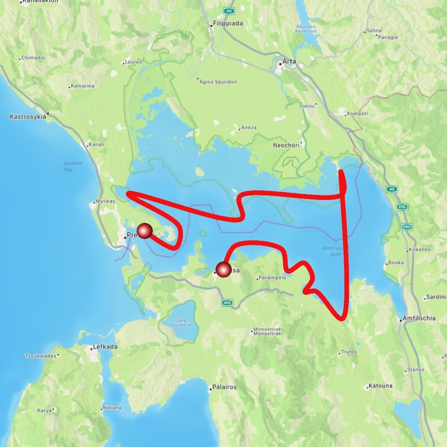 Zurück an Bord wird erstmal gefrühstückt, bevor wir den Anker lichten und unter Segeln ablegen. Der Wind weht wie alle Tage auch heute Nachmittag verlässlich aus Nordwest. Wir segeln auf entspanntem Raumschotkurs und merken kaum, dass der Wind beständig zulegt. Erst als wir die Untiefe vor der Mündung des Arachthos Flusses passiert haben und nach einer Halse nun hoch am Wind Richtung Zielhafen steuern, bemerken wir die Zunahme auf gut 15 Knoten. Allerdings kommen wir schnell in Landabdeckung und das Wasser beruhigt sofort. Wie auf Schienen rauschen wir die letzten Meilen bis zum Ankerplatz. Auch hier greift der Anker im sandig-schlickigen Grund sofort.
