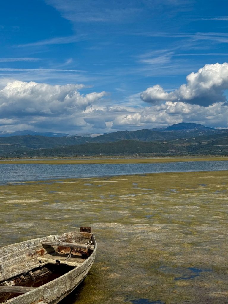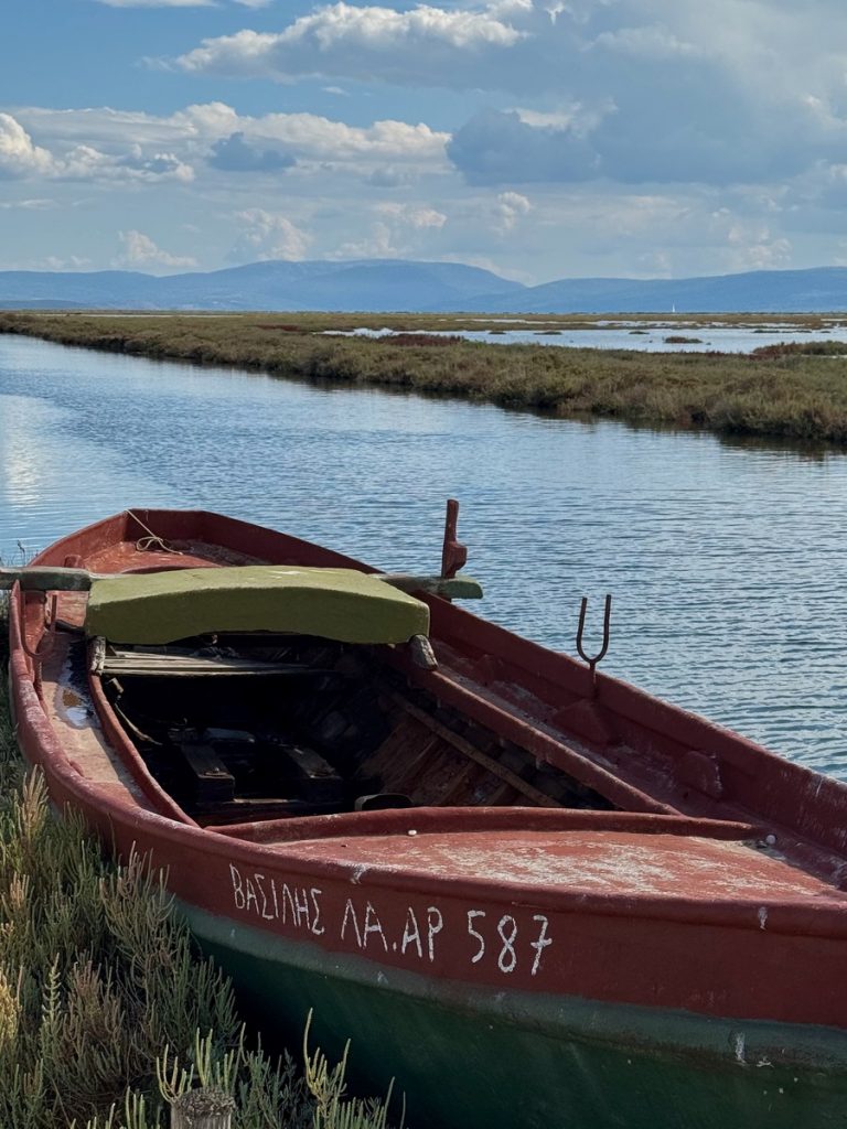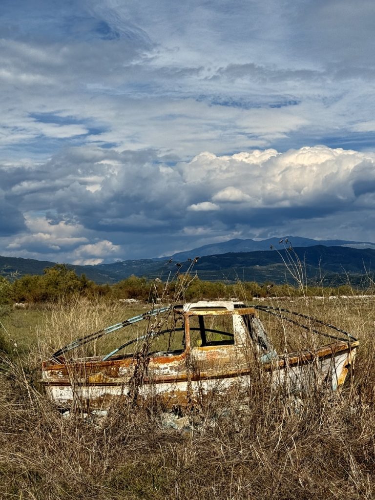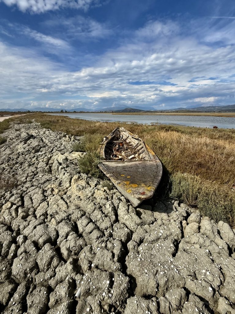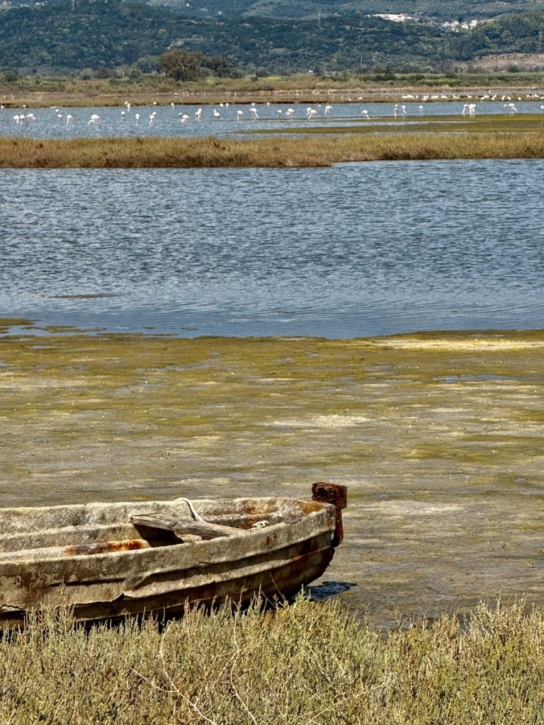 Hier sehen wir eine große Menge an Flamingos, die mit dem Kopf unter Wasser langsam durch die Lagune stolziert. Sie sind scheu und sobald wir uns auf dem Damm nähern, waten sie in einer fast festgelegt wirkenden Formation von uns weg – ohne Hektik und sehr majestätisch. Links des Dammweges sehen wir den jährlichen Aushub aus dem Kanal – graue Kleie, die dafür verantwortlich ist, dass hier der Anker meistens sehr gut hält. Die Fischer müssen die Kanäle der Lagune regelmäßig ausbaggern, damit sie mit den kleinen Fischerbooten befahrbar bleiben. Auch viele aufgegebene Wracks liegen hier, die zum einen für fotogenen Vordergrund sorgen, aber auch ein Zeichen dafür sind, wie viele Fischer aufgegeben haben oder bei einem Wechsel auf ein neueres Boot nicht das Geld haben, das alte „richtig“ zu entsorgen. An mehreren Stellen haben sich die Fischer kleine Plätze eingerichtet, an denen sie gemeinsam Grillen und Fachgespräche führen können. Es ist früher Nachmittag und über der ganzen Szenerie hängt Stille in gleißendem Sonnenlicht. Diese Seite des Ambrakischen Golfes wirkt auf den ersten Blick vielleicht als „Lost Place“, fängt uns aber im gleichen Moment mit seiner einzigartigen Atmosphäre ein und bringt uns zum Staunen.