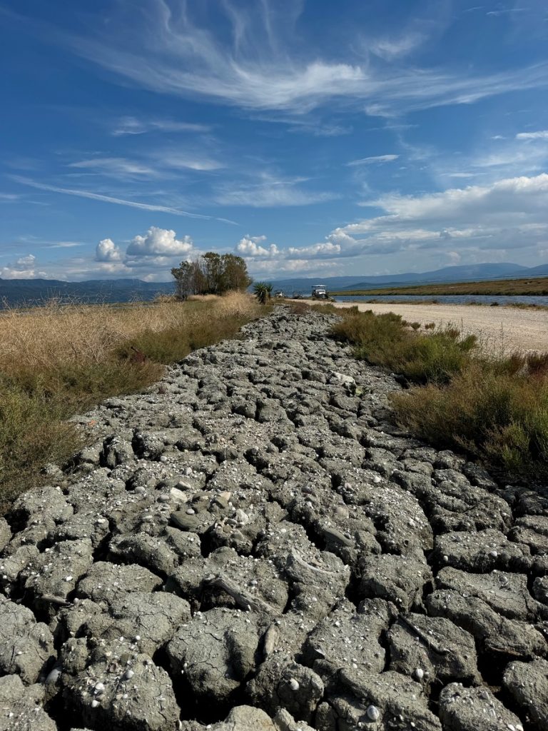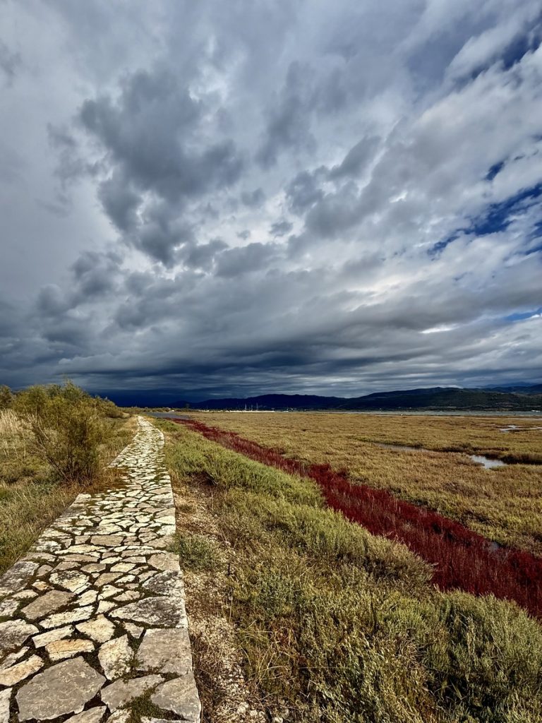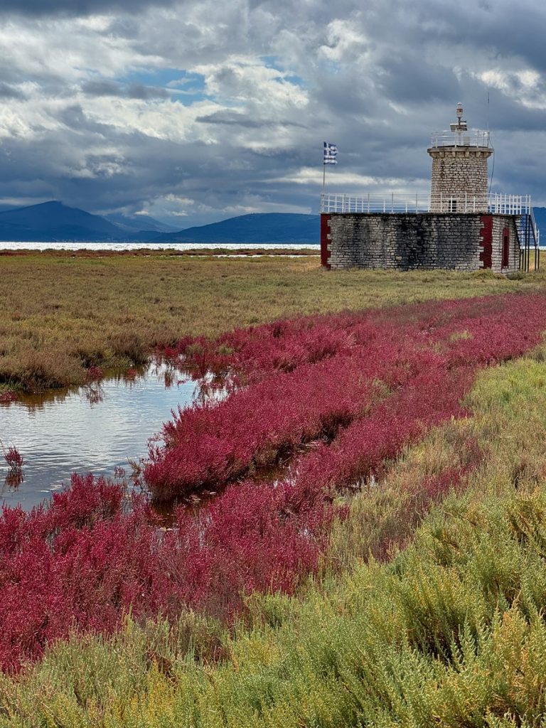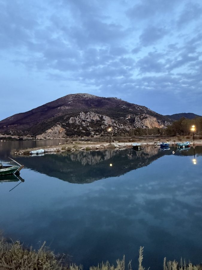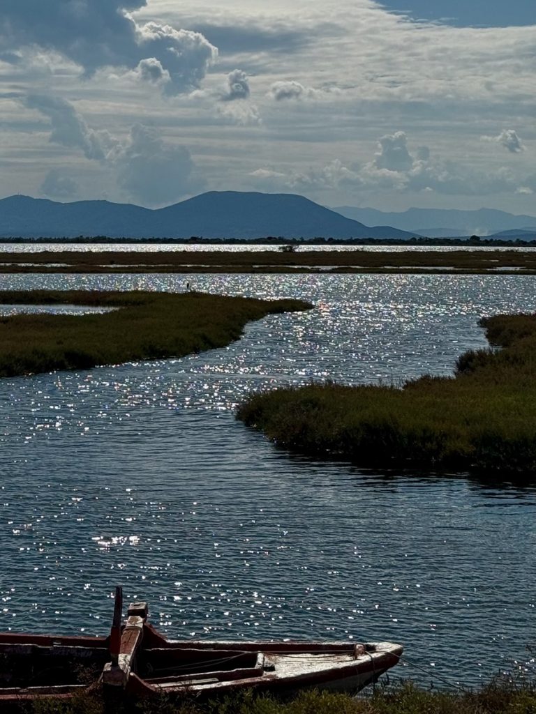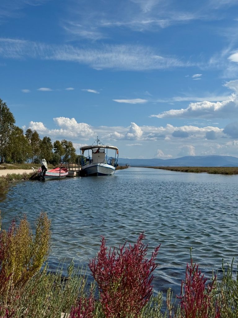 Hier sehen wir eine große Menge an Flamingos, die mit dem Kopf unter Wasser langsam durch die Lagune stolziert. Sie sind scheu und sobald wir uns auf dem Damm nähern, waten sie in einer fast festgelegt wirkenden Formation von uns weg – ohne Hektik und sehr majestätisch. Links des Dammweges sehen wir den jährlichen Aushub aus dem Kanal – graue Kleie, die dafür verantwortlich ist, dass hier der Anker meistens sehr gut hält. Die Fischer müssen die Kanäle der Lagune regelmäßig ausbaggern, damit sie mit den kleinen Fischerbooten befahrbar bleiben. Auch viele aufgegebene Wracks liegen hier, die zum einen für fotogenen Vordergrund sorgen, aber auch ein Zeichen dafür sind, wie viele Fischer aufgegeben haben oder bei einem Wechsel auf ein neueres Boot nicht das Geld haben, das alte „richtig“ zu entsorgen. An mehreren Stellen haben sich die Fischer kleine Plätze eingerichtet, an denen sie gemeinsam Grillen und Fachgespräche führen können. Es ist früher Nachmittag und über der ganzen Szenerie hängt Stille in gleißendem Sonnenlicht. Diese Seite des Ambrakischen Golfes wirkt auf den ersten Blick vielleicht als „Lost Place“, fängt uns aber im gleichen Moment mit seiner einzigartigen Atmosphäre ein und bringt uns zum Staunen.