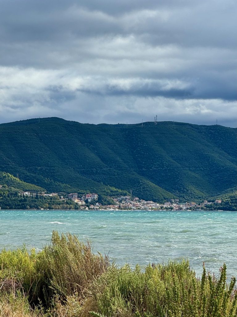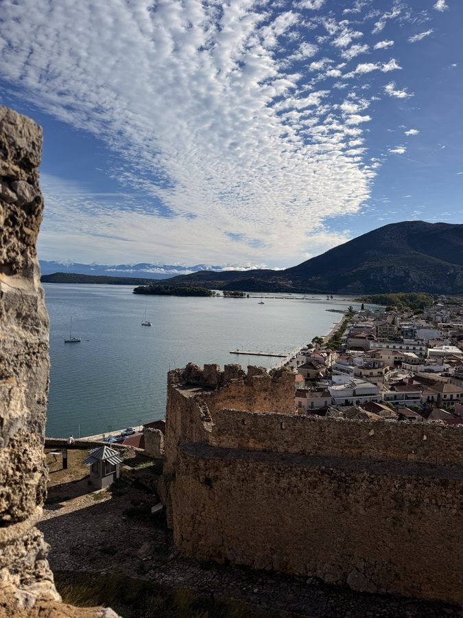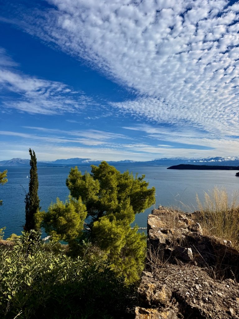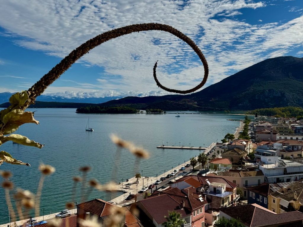 Über Nacht hat jemand Wind und Welle ausgeschaltet und wir erwachen auf einem Ententeich. Unvorstellbar, dass wir hier gestern noch einen halben Meter Welle am Ankerplatz hatten! Wir beschließen vor der Abfahrt noch einen Rundgang durch den Ort samt byzantinischer Festungsanlage zu machen. Mit Interegg-Fördermitteln ist die Festungsanlage zwischen 2014 und 2020 saniert worden. In den letzten Jahren wurde die Festung zudem von überflüssigem Strauchwerk befreit, um das ursprüngliche Aussehen etwas zu verdeutlichen. Wir haben die Anlage für uns allein und lassen uns mit unserem Rundgang Zeit. Es bieten sich immer wieder schöne Ausblicke auf Ort, Hafen und den Ambrakischen Golf. Die letzten Wolken verziehen sich und mit der Sonne kommt auch wieder die Wärme. Auf dem Rückweg zum Boot haben sich die Cafés wieder mit den vormittäglichen griechischen Gästen gefüllt, die bei Kaffee und Wasser den angeregten Austausch von Neuigkeiten pflegen – eine schöne Angewohnheit!