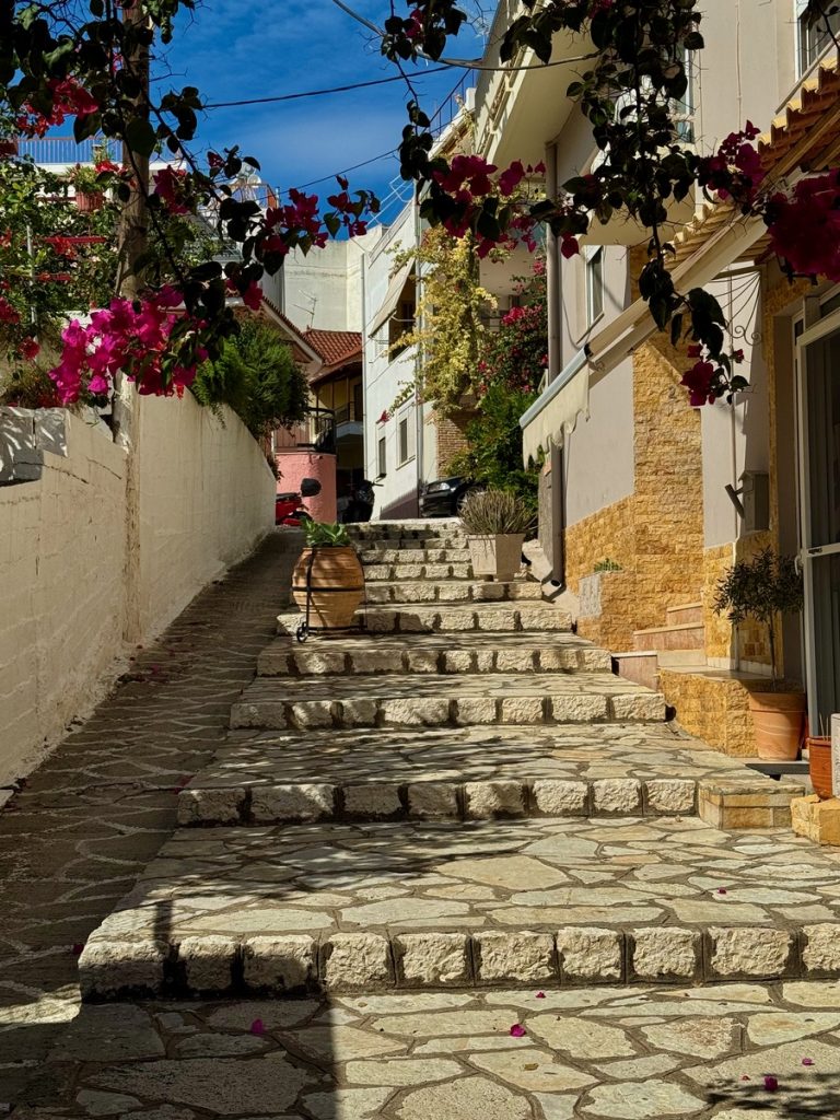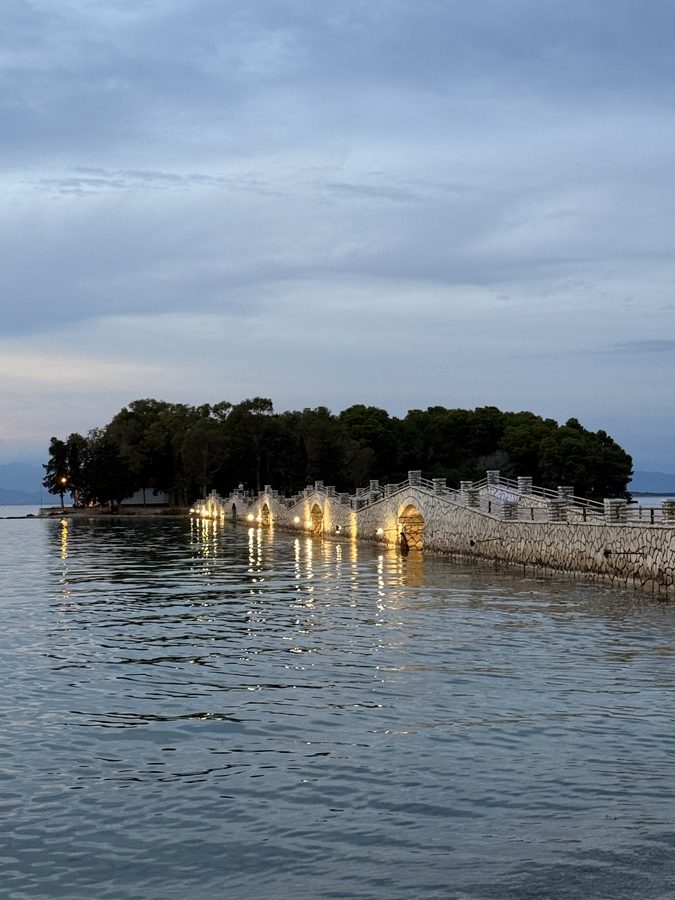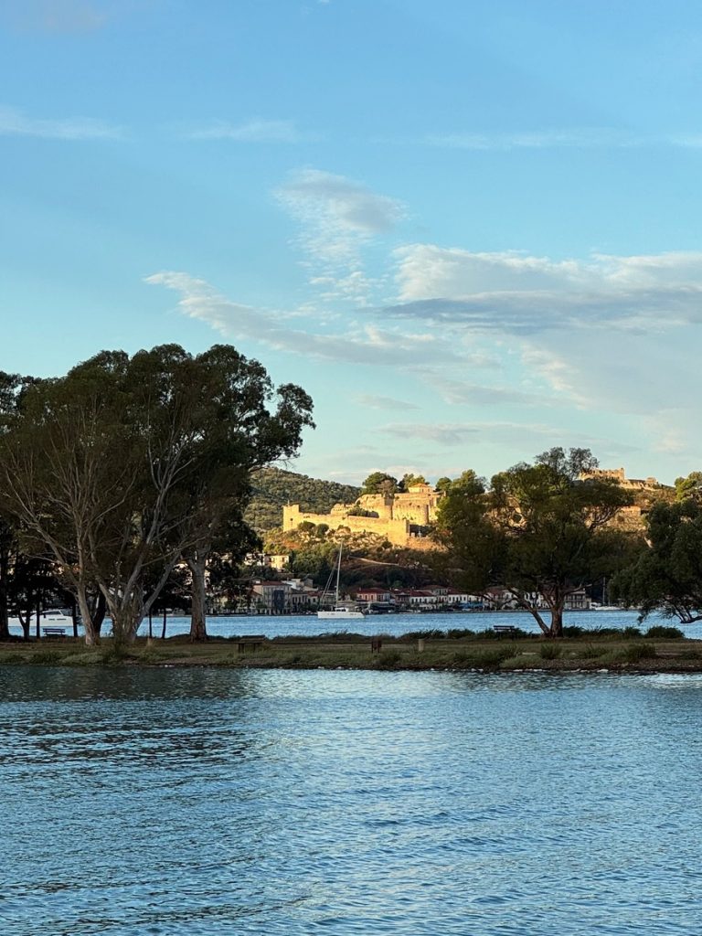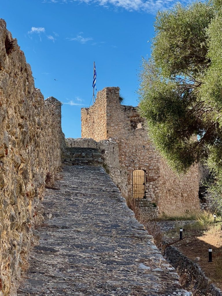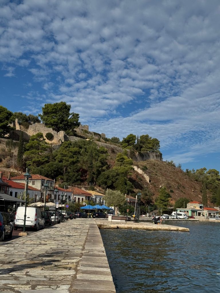 Über Nacht hat jemand Wind und Welle ausgeschaltet und wir erwachen auf einem Ententeich. Unvorstellbar, dass wir hier gestern noch einen halben Meter Welle am Ankerplatz hatten! Wir beschließen vor der Abfahrt noch einen Rundgang durch den Ort samt byzantinischer Festungsanlage zu machen. Mit Interegg-Fördermitteln ist die Festungsanlage zwischen 2014 und 2020 saniert worden. In den letzten Jahren wurde die Festung zudem von überflüssigem Strauchwerk befreit, um das ursprüngliche Aussehen etwas zu verdeutlichen. Wir haben die Anlage für uns allein und lassen uns mit unserem Rundgang Zeit. Es bieten sich immer wieder schöne Ausblicke auf Ort, Hafen und den Ambrakischen Golf. Die letzten Wolken verziehen sich und mit der Sonne kommt auch wieder die Wärme. Auf dem Rückweg zum Boot haben sich die Cafés wieder mit den vormittäglichen griechischen Gästen gefüllt, die bei Kaffee und Wasser den angeregten Austausch von Neuigkeiten pflegen – eine schöne Angewohnheit!