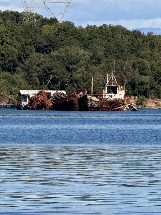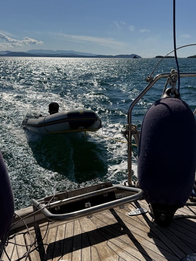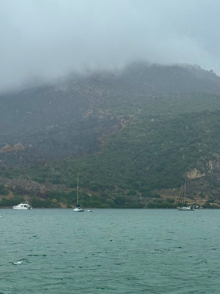 Nach dem Morgenkaffee kümmern wir uns um die heutige Sonntagszeitung – gestern wollten wir den Tag lieber anderweitig genießen… Parallel schauen wir in alle uns verfügbaren Wetterapps. Die Vorhersagen stimmen wenig. Das sonst so zuverlässige Regenradar von WetterOnline prognostiziert, dass die Regenfront an uns vorbei geht – draußen schüttet es aber wie aus Eimern! Nur eines von sieben Wettermodellen sagt starken Wind aus Osten voraus – bei uns sehen wir Böen bis zu 30 Knoten aus Nordosten auf der Windanzeige. Bei Winden aus diese Richtung kommt auch die Welle in die Bucht und es wird ziemlich „bumpy“. Es fühlt sich nicht sehr komfortabel an, wenn sich 80 Meter hinter dem Heck das steinige Ufer befindet. Wir beschließen also den Tag an Bord zu verbringen.