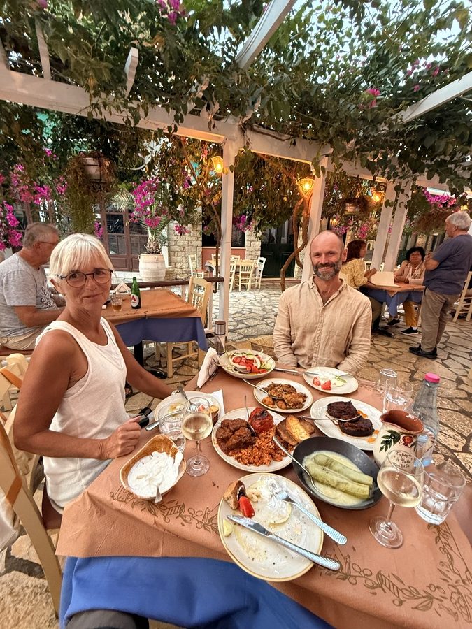 Am Abend geht’s dann nochmals an Land. Wir haben uns bereits auf der Einkaufstour eine Fischtaverne ausgeguckt. Sie war voll besetzt mit Griechen – immer ein gutes Zeichen. Zur deutschen Abendessenzeit finden wir einen schönen Tisch etwas abseits am Strand unter einem Sonnenschirm. Vor uns ankern ebenfalls ein paar Boote, aber diese Bucht ist deutlich größer und offener. Wir bestellen Muscheln, Ambrakische Scampi, Griechischen Salat und Tzatziki und bekommen ein hervorragendes Essen serviert. Den Ouzo zur Verdauung gibt’s an Bord und auch noch ein leckeres Kaltgetränk zur Feier des Tages.