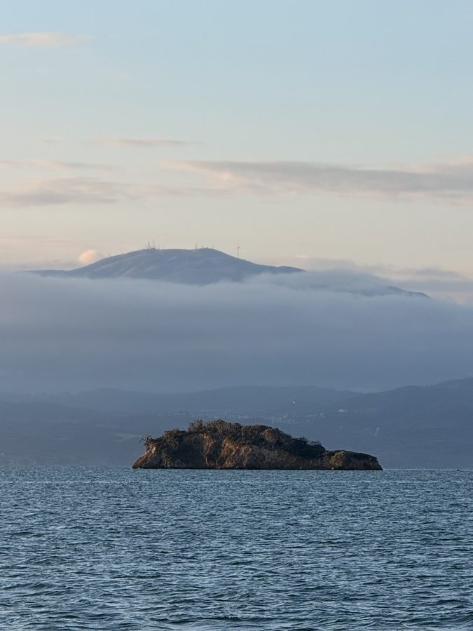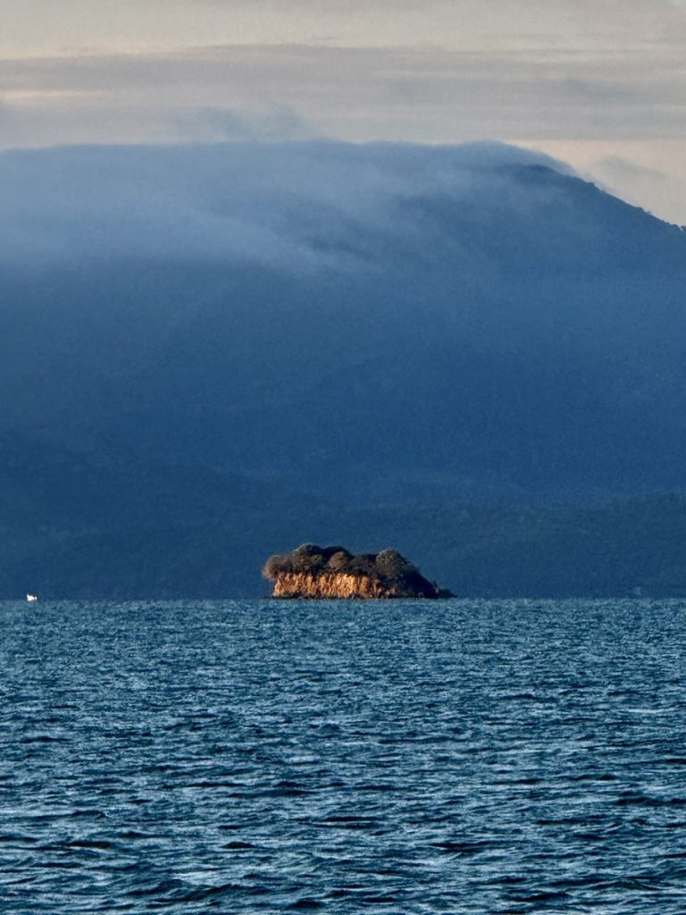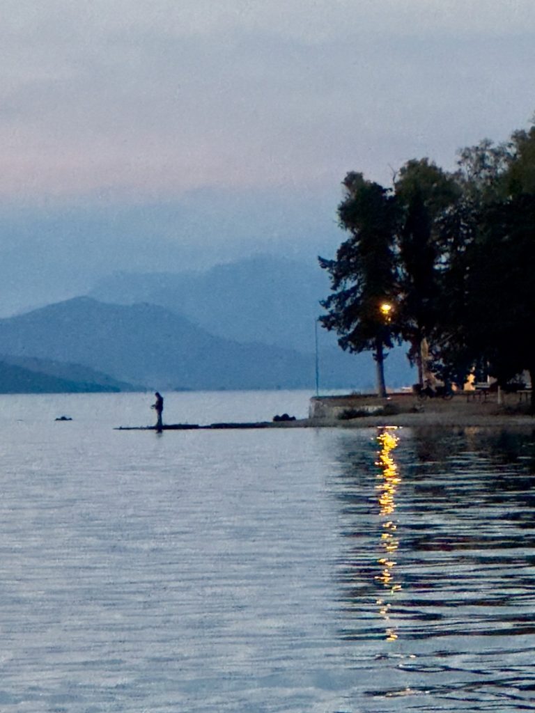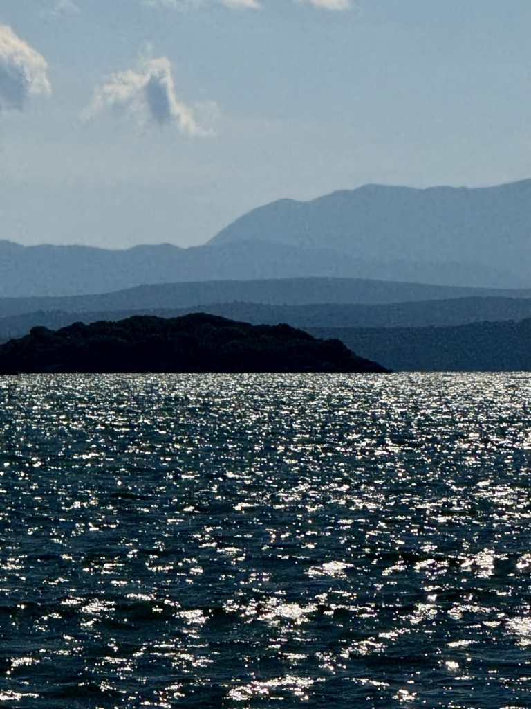 Als am frühen Nachmittag der Seewind aus Westen einsetzt, lichten wir den Anker und segeln gemütlich Richtung Osten zu „unserem“ Ankerplatz auf der Rückseite von Koronisi. Leider schläft der Wind zum Sonnenuntergang noch nicht ein – im Westen bezieht sich der Himmel und es wird frisch. Wir verschieben den Landgang auf Morgen und bestaunen aus dem Cockpit den Blick auf die in der Ferne liegenden verschachtelten Berghänge in ihren verschiedenen Schattierungen in blau-grau.