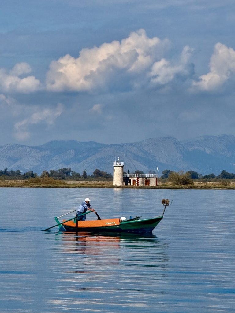 Nach dem Morgenkaffee geht es an Land. Wir spazieren entlang des Küsten- und Lagunenweges und sehen tatsächlich eine Gruppe von Pelikanen. Es gibt am Damm mehrere Durchgänge in die Lagune, die von den ansässigen Fischern so präpariert sind, dass kleine Fische in die Lagune hineinschwimmen können, Größere aber nicht wieder hinaus. Früher geschah dies durch Schilfkonstruktionen, heute durch Kästen mit Metallgeflecht. An einem dieser Durchbrüche beobachten wir einen Griechen, wie er einfach mit einem Kescher Fische für das Mittagessen herausholt – sieht nach einer sehr simplen „Ernte“ Methode aus. Insgesamt gibt es im Ambrakischen Golf ca. 70 Quadratkilometer Lagunenfläche – eine riesige natürliche Fischfarm. Auch hier sind die Fangmengen begrenzt, um das empfindliche ökologische Gleichgewicht nicht zu gefährden und die Zahl der hauptberuflichen Fischer sinkt. Wir sehen überwiegend ältere Griechen in den oft sehr alt wirkenden Fischerbooten. Man bedient sich an allem, was das Umfeld so hergibt und kein Geld kostet: alte Teppiche, um die Netze abzudecken, alte Autoreifen als Fender, alte Kanister als Bojen für die Grundnetze.