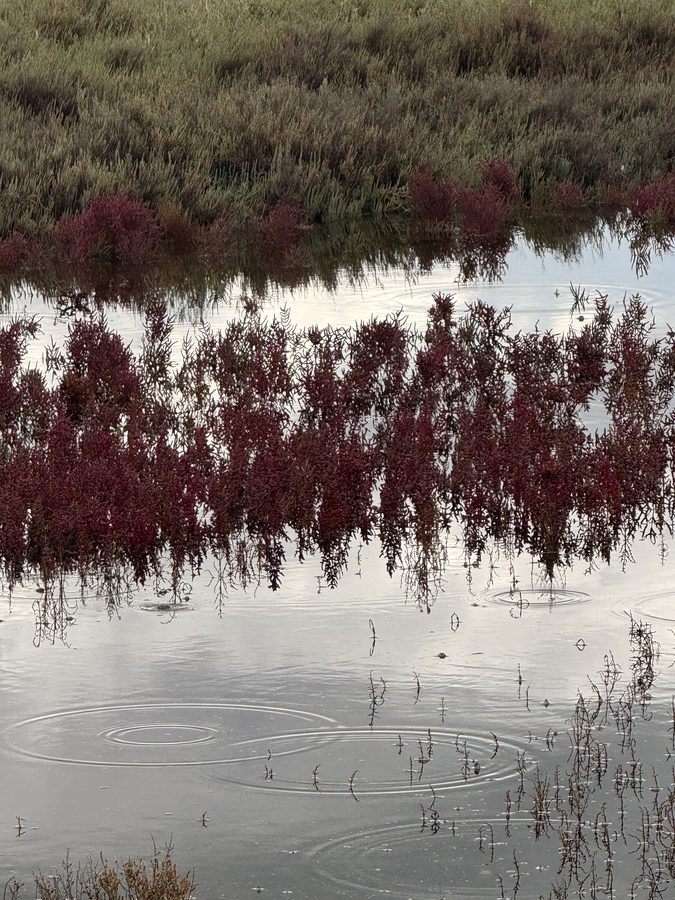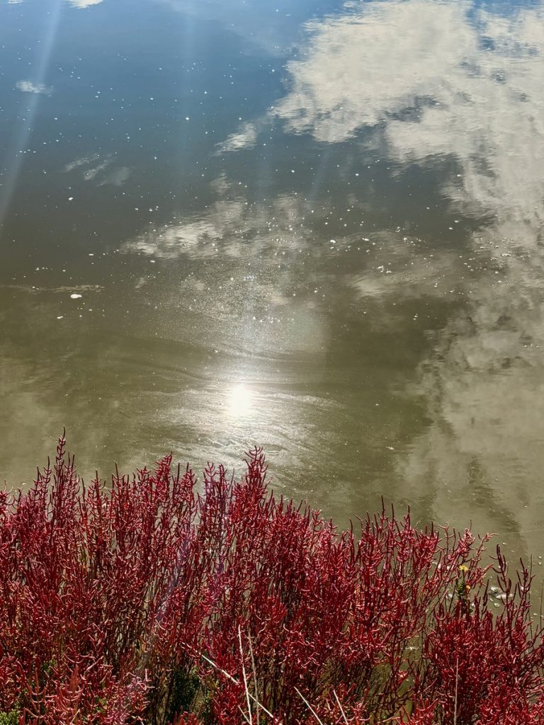 Die Wege durch die Lagunenlandschaft liegen tief und Regen und auflandiger Wind haben für große Pfützen gesorgt. Auch neben dem Weg zum Leuchtturm steht deutlich mehr Wasser, als bei unserem letzten Besuch. Dabei ist es erstaunlich mild. Wir haben angesichts der dicken Wolken lange Hose und Jacke angezogen und entblättern uns beim Laufen Stück für Stück. Der Wind fühlt sich an, wie der Fön aus den Alpen, an den wir uns aus unseren Münchner Jahren noch gut erinnern.