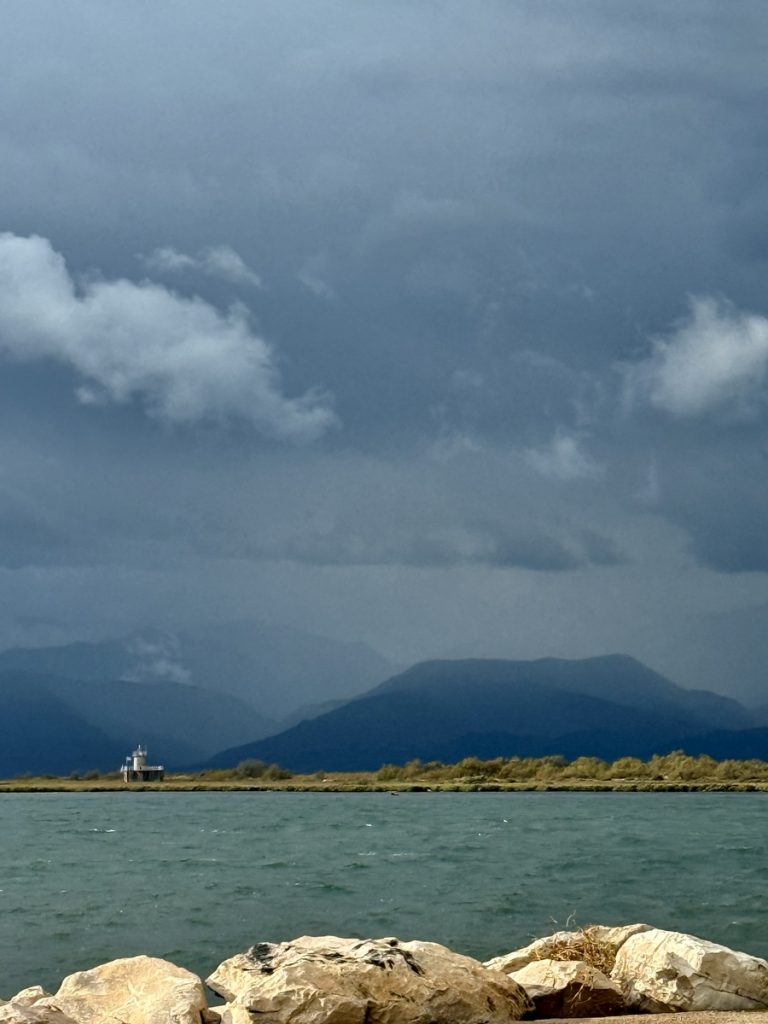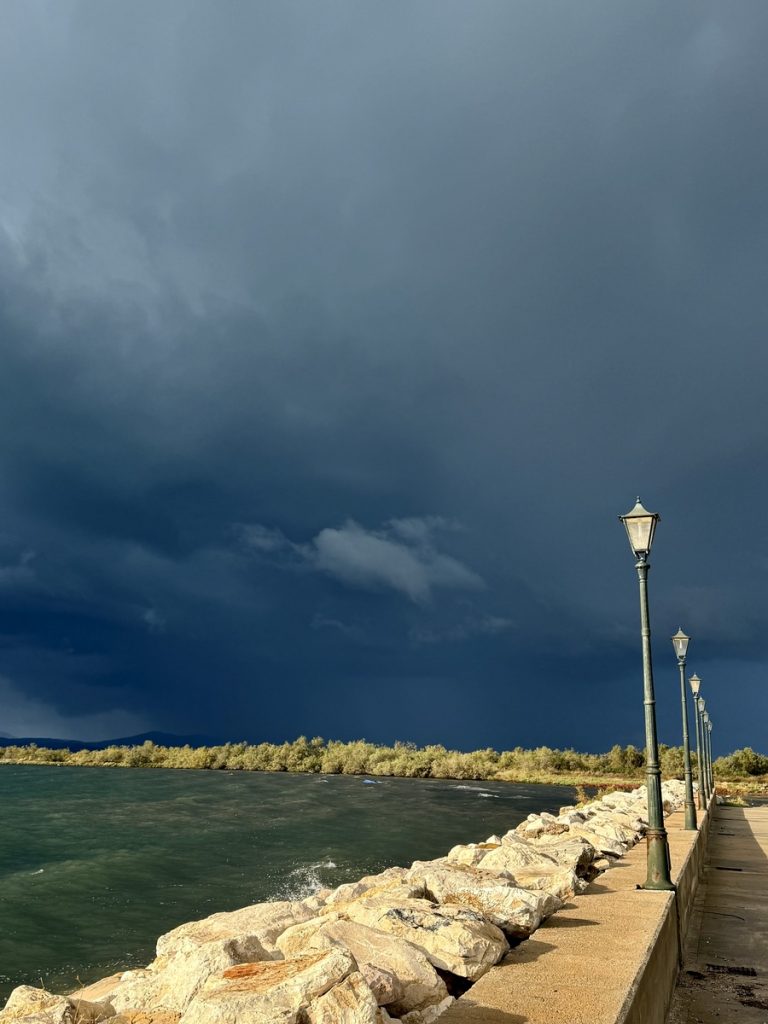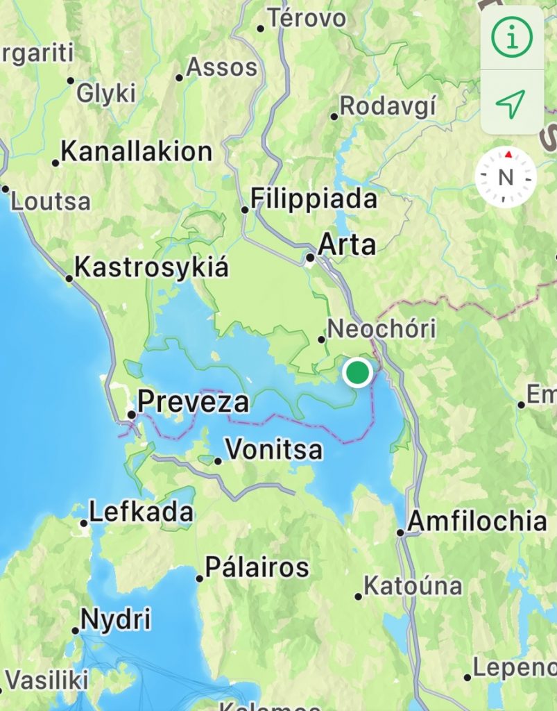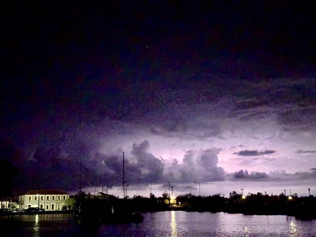 Wir bauen ein Verdeck über der Luke der Heckkabine auf und kontrollieren, ob alle Fenster richtig verschlossen sind. In der Ferne vernehmen wir leichtes Donnergrummeln und sehen immer wieder Wetterleuchten. Ein Blick in die Blitz-App zeigt, was auf dem offenen Meer vor Preveza los ist. Uns erreichen die Gewitter nicht. Sie ziehen nördlich oder deutlich südlich vorbei. Nachts frischt der Wind auf und bläst aus Südost, wieder eine nicht prognostizierte Richtung. Wir hatten eigentlich mit Nordwest gerechnet. So passt es uns aber viel besser, denn nun liegen wir hinter der Mole noch geschützter und keine noch so kleine Welle plätschert unter unserem Heck.