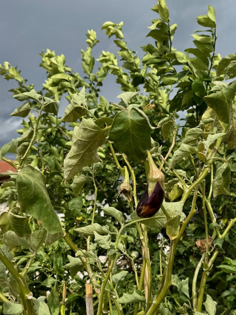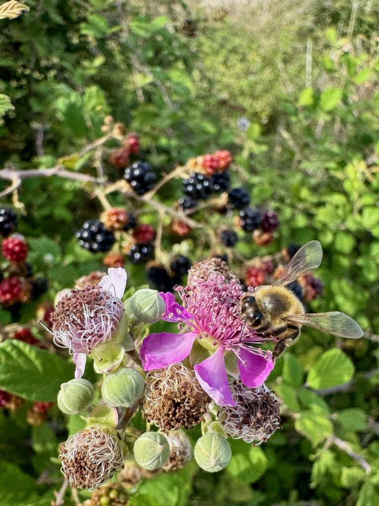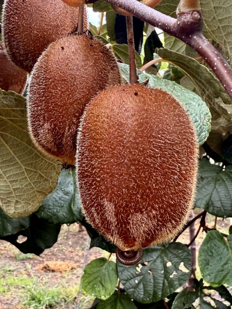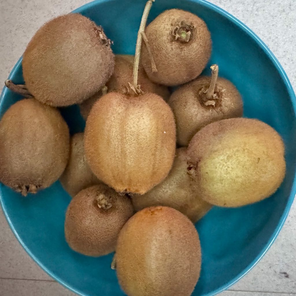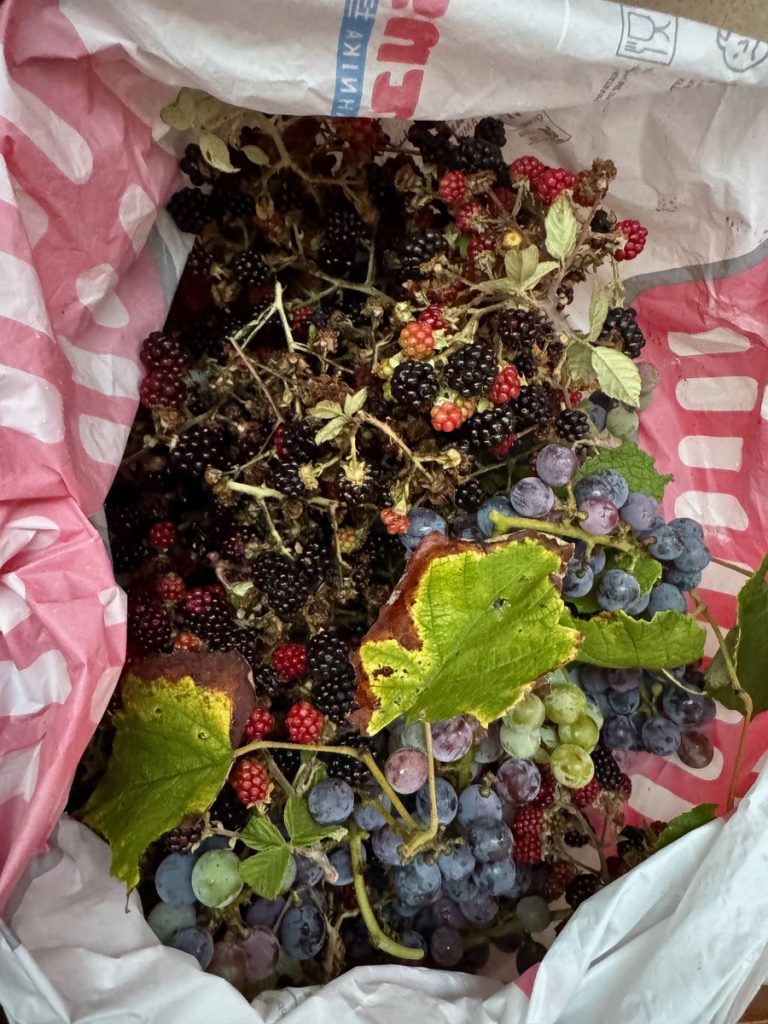 Auf dem Rückweg macht Barbara halt für die Ernte. Neben Brombeeren und Weintrauben nehmen wir auch ein paar Kiwis mit, die über den Zaun hängen. Sie erweisen sich leider später als ungenießbar, weil noch nicht reif…