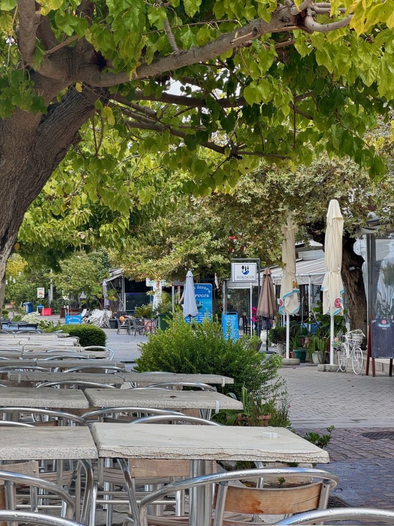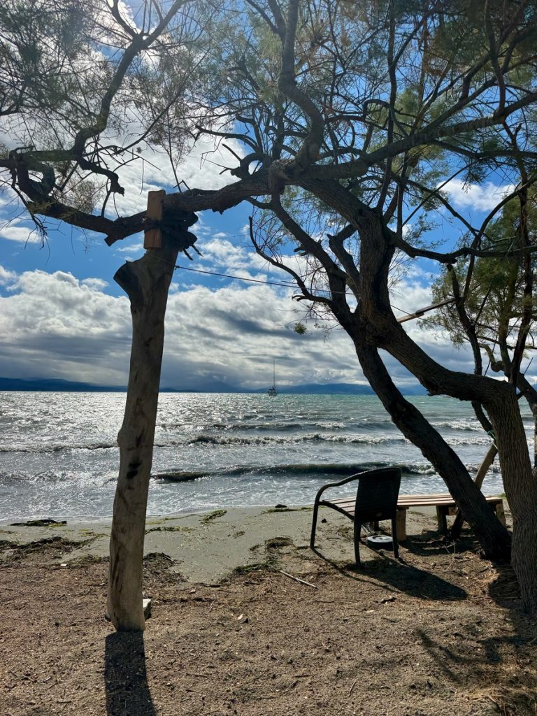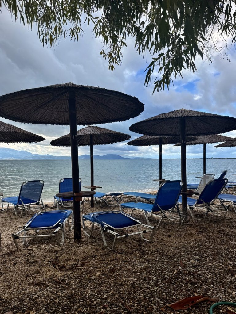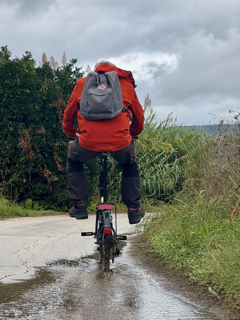 Gegen Mittag zeigt sich eine Regenpause von mindestens 1,5 Stunden – unsere Chance. Wir besteigen die Räder, heute ausgerüstet mit Regenklamotten. Überall haben sich große Pfützen gebildet, die man entweder für Fotos mit Spiegelungen nutzen kann, oder zum Herumspritzen. Es geht durch Plantagen mit Orangen-, Kiwi- und Olivenpflanzungen. Entlang der Straßenränder wachsen Unmengen an Brombeeren. Vereinzelt treffen wir auch auf Weinreben, Granatapfel-, Feigen und Nussbäume. Der kleine Ort Menidi empfängt uns recht verschlafen. Auf der für den Verkehr gesperrten Uferstraße reihen sich verlassene Tavernen und Cafés aneinander. Nur vereinzelt sitzen ein paar Griechen bei Kaffee und Wasser. Wir finden eine Bäckerei, in der wir Blätterteigtaschen für unser Picknick am Wasser und ein „Schwarzbrot“ kaufen. Die Bäckerin empfängt uns mit ein paar Brocken Deutsch! Ein paar Meter weiter gibt es eine Fleischerei, in der wir feinstes Rinderhack für unser Abendessen bekommen. Während unseres Picknicks am Wasser kommt sogar die Sonne heraus – alles wirkt wie frisch gewaschen.