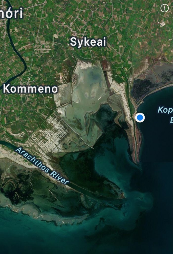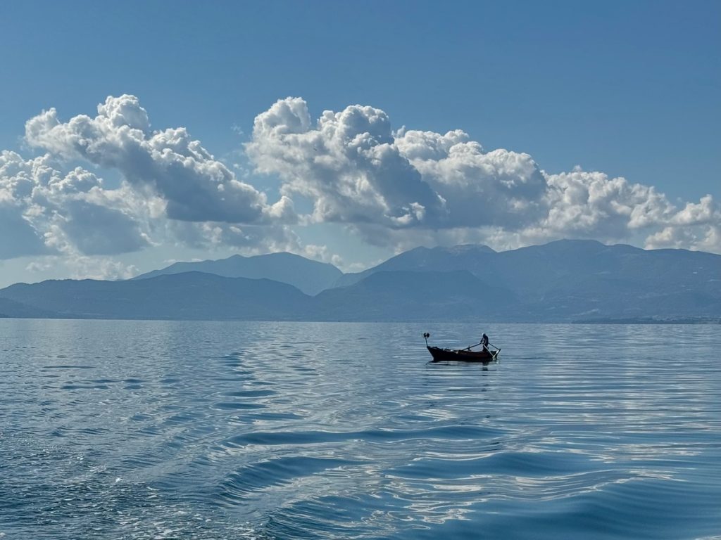 Wir halten uns nicht zu lange auf, denn wir wollen weiter nach Kopraina. Dort gibt es nicht viele Liegeplätze im Hafen und wir hätten gern einen, um das für heute Nacht und morgen angekündigte Unwetter entspannt abwettern zu können. Frühes Erscheinen ist da möglicherweise entscheidend. So haben wir zwar noch keinen Segelwind und müssen unter Motor laufen, aber das ist es uns wert. Unterwegs treffen wir auf viele offene kleine Fischerboote, von denen aus die Fischer „klassisch“ angeln. Teilweise sitzen sie dabei in der prallen Sonne, teilweise sind die Boote mit kleinen Dächern oder Sonnenschirmen bestückt. Die Boote treiben auf dem spiegelglatten Wasser und werden von der herrschenden Strömung leicht nach Osten versetzt. Hin und wieder wird mit Hilfe von knatterndem Außenborder oder stillen Rudereinsatz die Position korrigiert, denn Allen gemeinsam ist, dass sie sich an der Mündung des Arachthos Flusses treiben lassen. Hier hat sich eine weit in den Golf reichende Sandbank aus dem vom Fluss mitgeführten Sediment gebildet. Am Ende der Sandbank fällt der Meeresboden steil ab – offensichtlich eine Stelle, an der viel Fisch vorkommt.