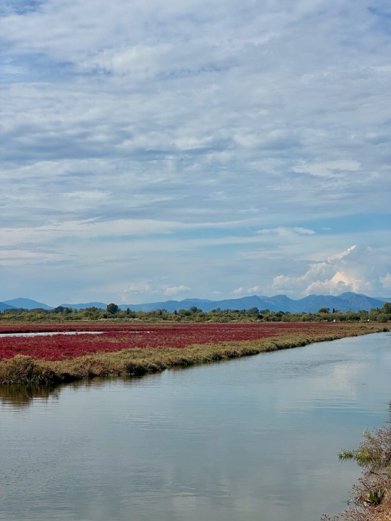 Schon aus der Ferne zählen wir durch das Fernglas mindestens 4 Masten im Hafen – sind wir schon zu spät? Als wir uns dem Hafen nähern, erkennen wir, dass an der Außenmole zwei Katamarane und ein Boot mit zwei Masten liegen. Zum Glück haben sie sich so eng gelegt, dass auch wir noch an die Pier passen – wunderbar! Wir genießen erstmal ein Frühstück im Cockpit und packen dann die Fahrräder aus. Heute wollen wir die Lagune erkunden. Dazu geht es in einem weiten Bogen bis auf die Spitze eines Damms, der einen der Entwässerungskanäle flankiert. Die einfache Wegstrecke beträgt zehn Kilometer, obgleich unser Ziel nur ca. drei Kilometer Luftlinie vom Hafen entfernt liegt.