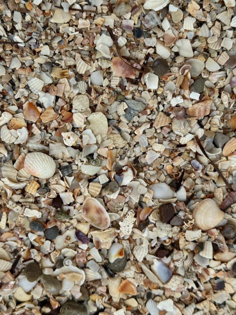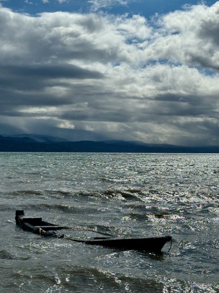 Im Laufe des Vormittags reißt der Himmel immer mal wieder auf, wobei um uns herum weiterhin dicke graue Wolken hängen. Der Wind weht mal mehr, mal weniger aus Südost. Wir erledigen erstmal ein paar Büroarbeiten und schreiben am Bericht, bevor wir uns in einer Regenpause aufmachen zu einem Spaziergang entlang des Ufers. Vor dem Hafen ankerten heute Nacht drei Boote, zwei haben aufgrund der unruhigen Lage bereits die Flucht ergriffen. Das dritte hat mehr Kette gesteckt und tanzt ordentlich in den Wellen. Wir sind so froh, einen Hafenplatz ergattert zu haben – dort vor Anker ist es sehr ungemütlich!