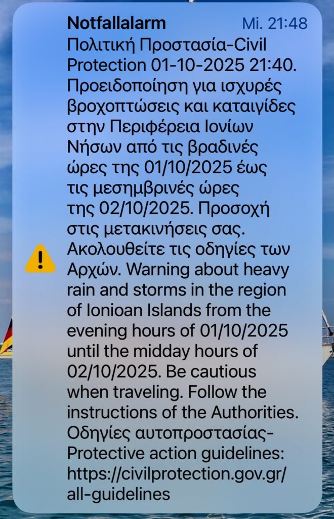 Zurück am Hafen, gönnen wir uns ein Kaltgetränk in der Hafen-Taverne: Barbara bestellt Frappé, Werner Bier. Nur zu letzterem werden kalte frittierte Sardinen und Pommes gereicht. Im Westen steigt bereits die Wolkenformation des angekündigten Tiefs in die Höhe. Die Sonne verschwindet vor Sonnenuntergang dahinter. Wir sitzen dennoch lange draußen und amüsieren uns köstlich über den vielleicht 4 Jahre alten Sohn unserer Bootsnachbarn, der nahezu ununterbrochen wichtige Gespräche mit Papa und Mama führt. Wir erkennen die Sprache nicht und erfahren erst später, dass es sich um tchechisch handelt. Nach dem Abendessen erreicht uns der erste Nieselregen und wenig später die griechische Wetterwarnung vor Gewitter und Starkregen.