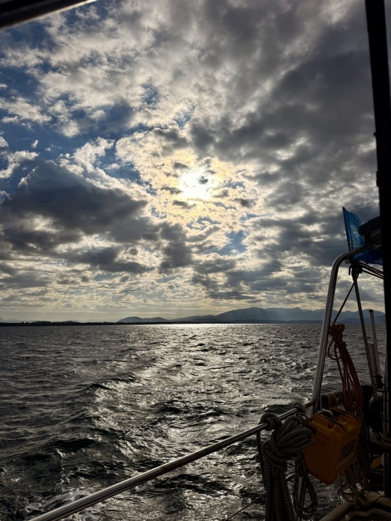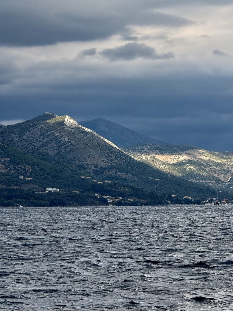 Die Nacht war super ruhig und wir wachen ausgeschlafen auf. Nach dem Morgenkaffee verstauen wir den Außenborder wieder am Heckkorb und ziehen das Dinghi erstmals an den Davids hoch. Heute wollen wir segeln und es sieht zumindest zeitweise nach einem schönen Halbwindkurs aus. Um halb neun und damit für unsere Verhältnisse sehr früh, lichten wir den Anker und laufen zusammen mit einer ganzen Armada von Charterbooten aus dem Ambrakischen Golf aus. Wir gehören zu den ganz wenigen Booten, die am Ende des Fahrwassers Richtung Norden abbiegen. Fast alle anderen wollen nach Süden durch den Lefkadakanal. Dort öffnet die Brücke um 10:00 Uhr. Nachdem das Fahrwasser hinter uns liegt, setzen wir Groß und Genua. Die Sonne scheint zwischen den Wolken hindurch und wir werfen einen vorerst letzten Blick auf die nun schon so vertrauten Bergrücken am Ambrakischen Golf.