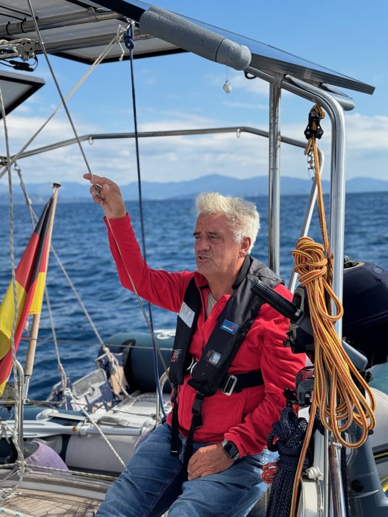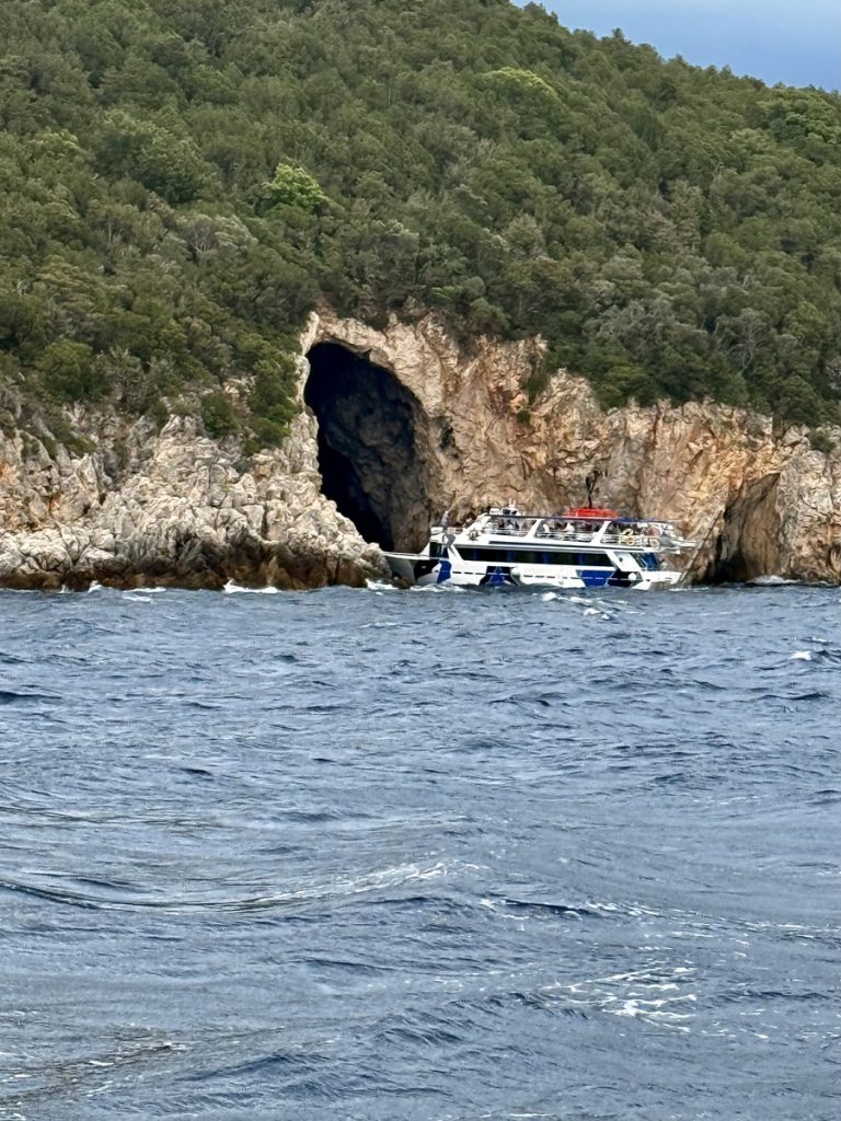 Das Wasser hat hier eine fantastische Farbe: ein tiefes strahlendes azurblau – so ganz anders als das eher braun wirkende Wasser der Ostsee! Der Wind weht mit 8-14 Knoten aus ONO und wir haben einen entspannten 60° Kurs. Später dreht der Wind immer östlicher, bevor er ganz einschläft und wir nach 3 wunderbaren Segelstunden die Maschine starten müssen. Nach 1,5 Stunden setzt dann eine leichte Brise aus Süd ein und wir können mit achterlichem Wind erneut segeln. Unser Ziel ist eine kleine Bucht im Syvota Archipel. Als wir uns der Inselgruppe nähern, fahren wir einen Aufschießer um die Segel zu bergen und realisieren erst da so richtig, wie stark der Wind mittlerweile bläst. Um in die Bucht zu kommen, müssen wir bei auflandigem Wind und Welle ziemlich dicht an die schroffen Felsen heranfahren und dann in die Bucht einbiegen. Das fühlt sich irgendwie nicht gut an. Insbesondere Barbara hat Bauchschmerzen nachdem uns ja im letzten Jahr die Maschine einmal wegen Dieselpest ausgefallen ist. Auf dem offenen Meer war das kein Problem, da hatten wir Platz für Manöver. Hier hätte das sehr viel krassere Folgen. Da wir immer darauf hören, wenn bei einem das Bauchgefühl nicht mitspielt, fahren wir eine zweite Bucht an. Diese ist allerdings schon belegt und ein weiteres Boot dreht seine Runden auf der Suche nach einem guten Ankerplatz. Das Problem heute ist, dass der Wind aktuell kräftig aus Süd bis Südost weht, für die Nacht aber eine Winddrehung auf Nordwest angekündigt ist. Es ist gar nicht so leicht eine Bucht zu finden, die für beide Windrichtungen zum Ankern geeignet ist.