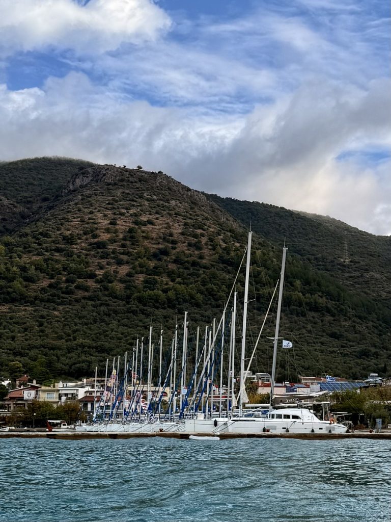 Die ganze Aufregung war gestern umsonst. Der Wind hat über Nacht kaum gedreht und ist gegen Morgen ganz eingeschlafen. Auch von den prognostizierten Regenwolken ist nichts zu sehen. Auf der einen Seite freut uns das, belastet andererseits auch unser Vertrauen in die Wettervorhersagen. Wir nutzen die ruhige Phase für einen kurzen Landgang und sehen uns den Hafen an. Gestern strömte es noch in die Bucht. Einige Boote legten sich ebenfalls vor Anker, aber viele gingen auch in den Hafen. Nun sehen wir, dass an der Pier eine Flottille von „Sailing Holidays“ liegt. Das ist eine Charterfirma, die sich auf englische Gäste spezialisiert hat. Das besondere daran ist, dass die Flottille aus eher kleinen Booten für zweier Crews besteht und die Gruppe immer von mindestens einem Begleitboot flankiert wird. Darauf befindet sich „Personal“, dass beim Anlegen hilft, Tipps für die Proviantierung vor Ort und die Wahl der abendlichen Taverne gibt und auch kleine Ausflüge organisiert. Als wir am Hafen entlangspazieren, sitzen gerade alle Crews gemeinsam in einer Taverne beim Frühstück und werden nebenbei für den Tag „gebrieft“. Auch auf der anderen Hafenseite liegen mehrere Charterboote eines Anbieters, allerdings sind das eher Katamarane, die mit 8 bis 10 Personen voll besetzt sind. Für uns würde der Hafen hier pro Nacht um die 60€ kosten. Uns gefällt es vor Anker deutlich besser.