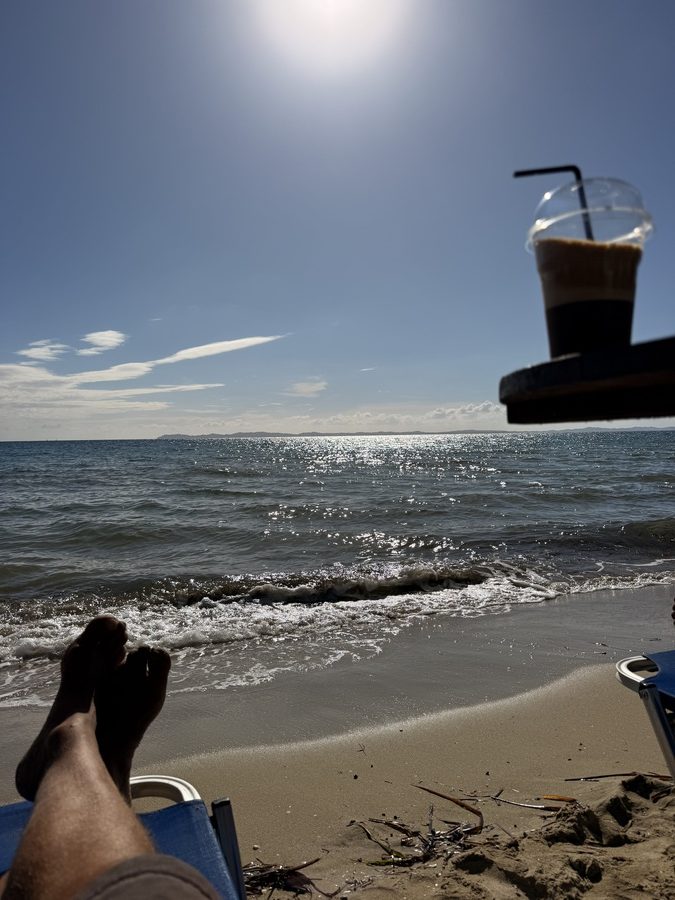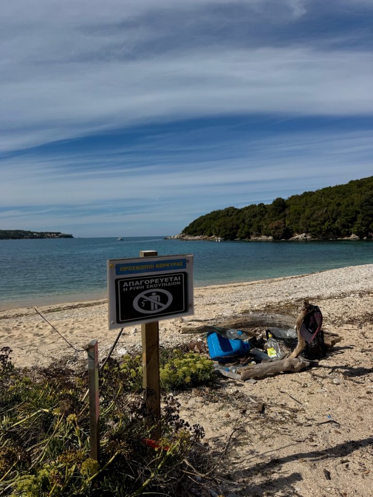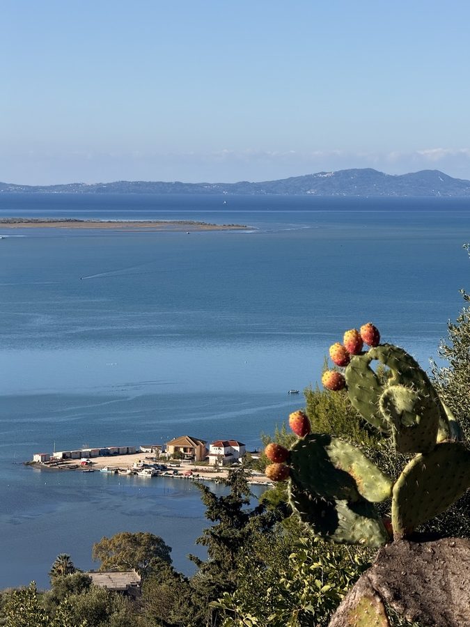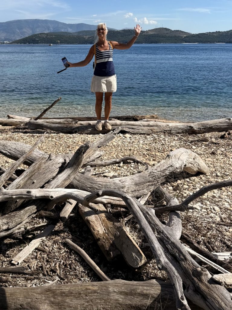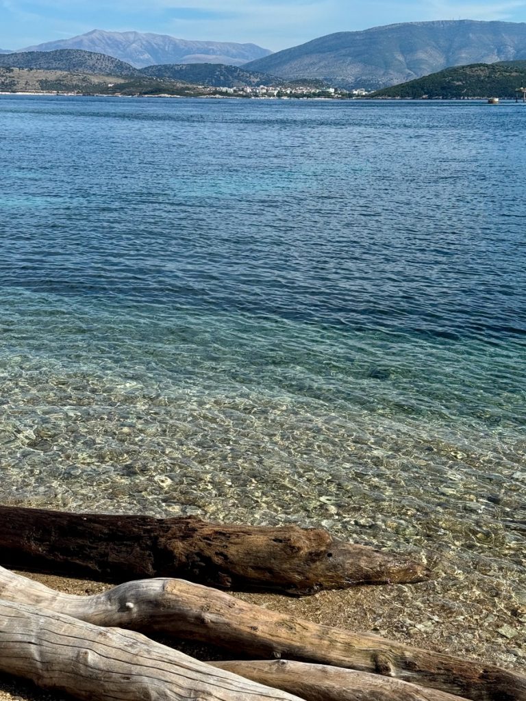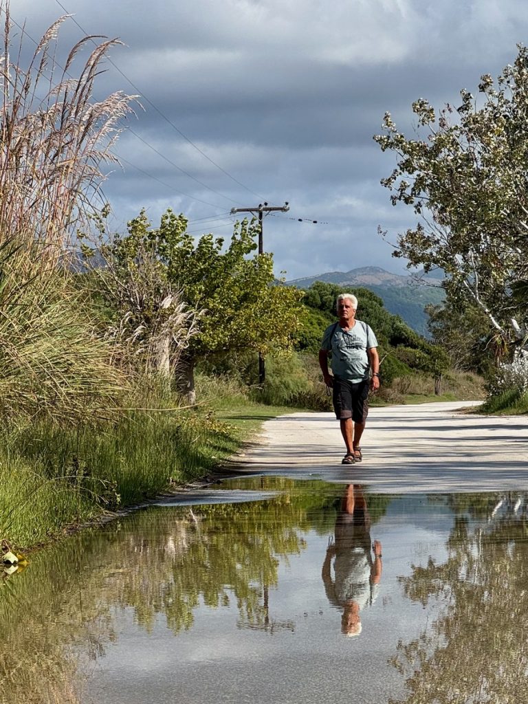 Nach dem Frühstück machen wir das Dinghi klar und gehen an Land. Der Anlandeplatz ist nicht optimal gewählt. Zwar kann man das Dinghi an einem Felsen gut festmachen und es ist ein kleiner Kiesstrand zum ein- und aussteigen, aber von dort zum Fußweg an Land zu kommen, bedarf etwas „Kraxelei“ durchs Unterholz. Am Fußweg angekommen, starten wir die Komoot-App, um mit ihrer Hilfe bei der Rückkehr den Abstieg zum Dinghi wiederzufinden. Nun führt uns eine Wanderung über mehrere Kilometer erst entlang eines kleinen Damms und dann entlang eines langen Sandstrandes. Wir nehmen die Sandalen in die Hand und laufen mit den Füßen im Wasser – herrlich! Statt der angekündigten Regenschauer begleitet uns die strahlende Sonne. Im Vergleich zum Ambrakischen Golf fällt uns auf, dass es hier touristisch deutlich mehr erschlossen ist. Es gibt entlang des Strandes mehrere Strandbars mit Liegestühlen und Sonnenschirmen, es gibt Wanderwege und es gibt deutlich mehr Segelboote. Das wir auf Korfu sicherlich noch mehr werden. Wir haben nun wirklich keine Saison mehr, aber dafür sind noch viele Charterboote unterwegs.