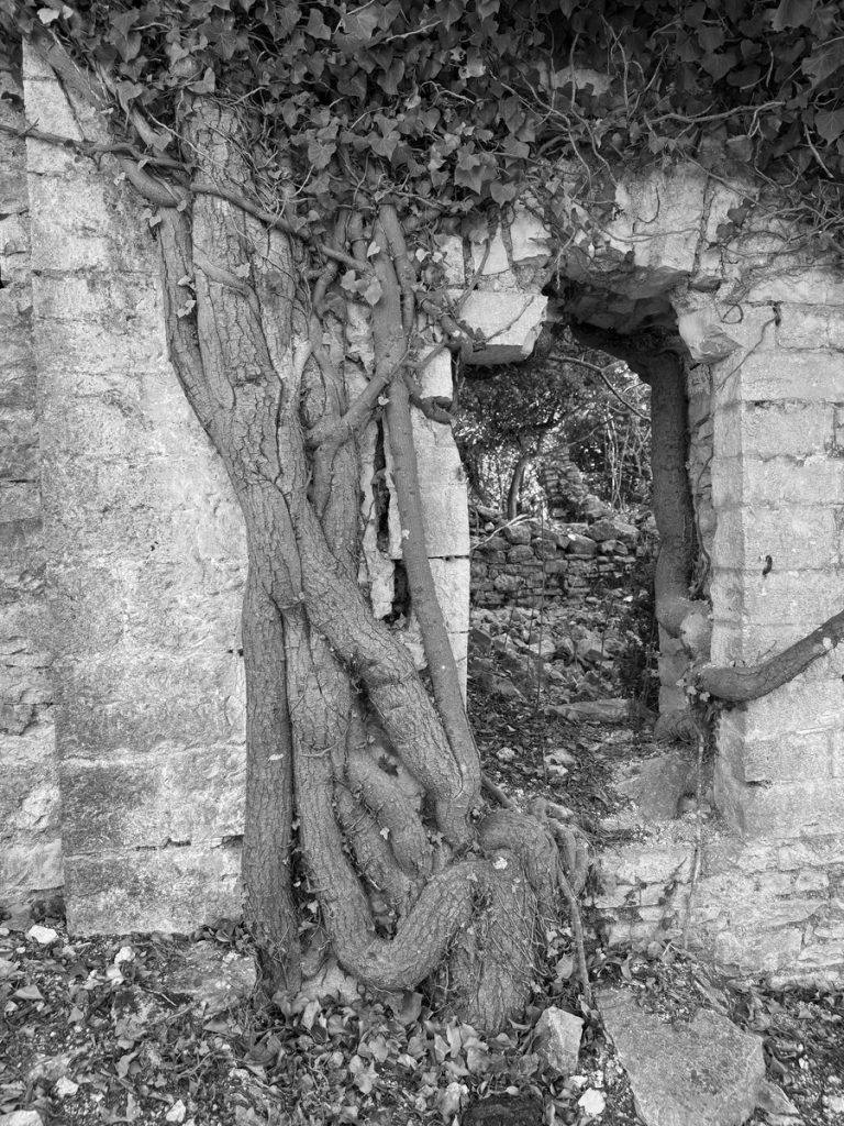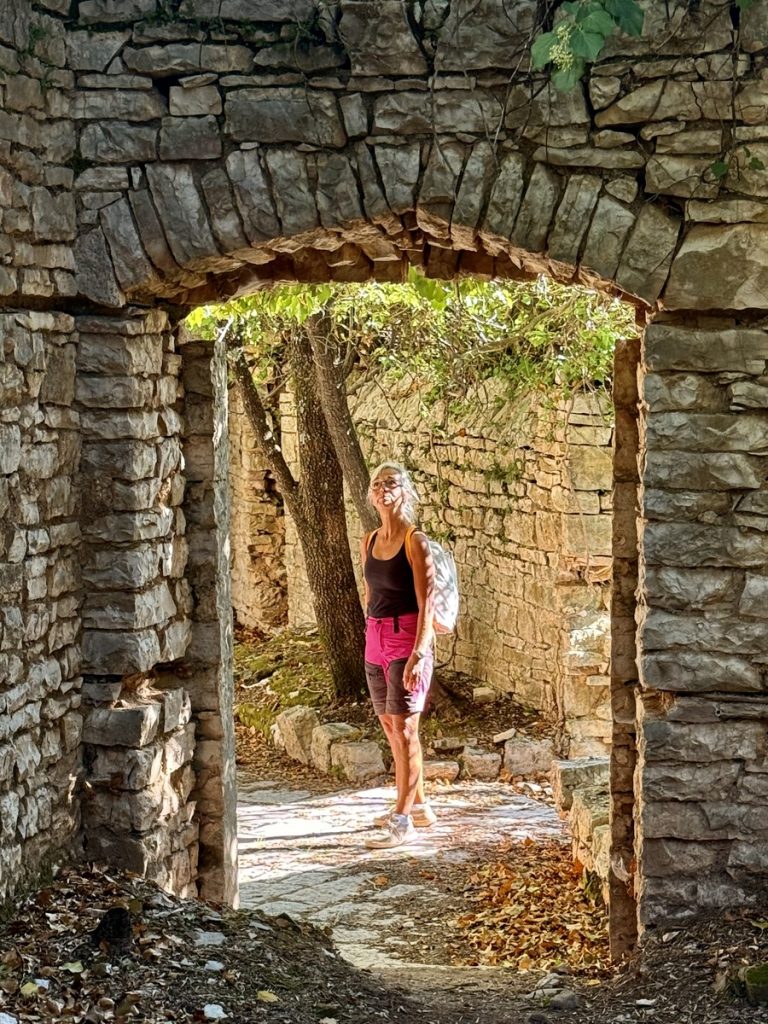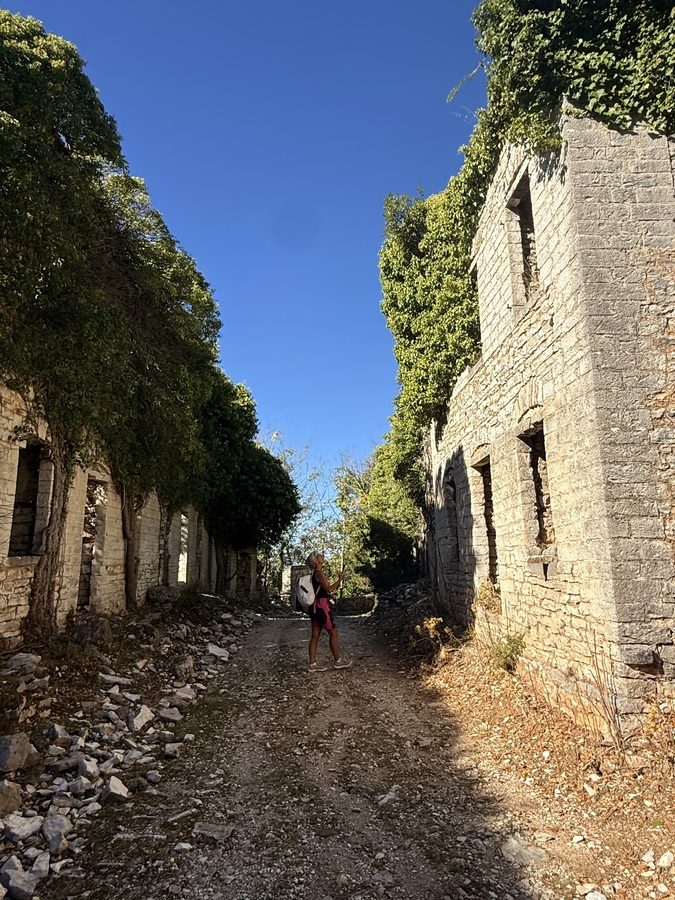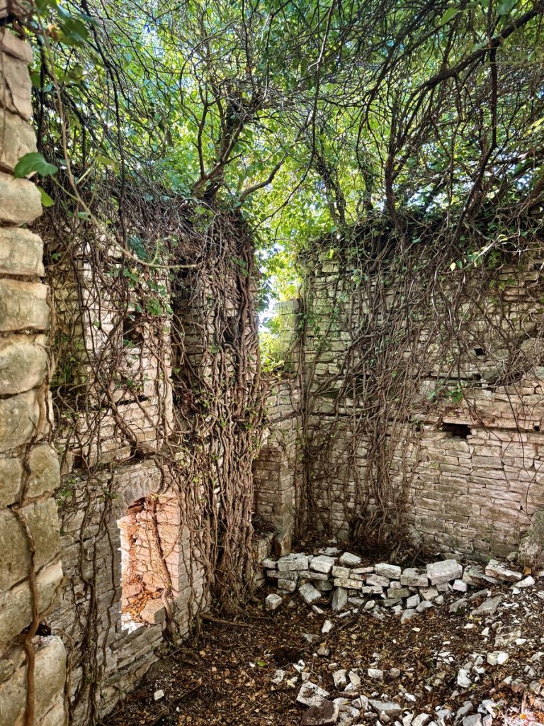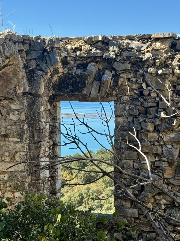 Wir kommen vorbei an grasenden Kühen, die uns kaum beachten und nach einer Wegbiegung können wir vor uns im Wald die Überreste der verlassenen Häuser entdecken. Im allwissenden Internet haben wir Informationen zum Ort gesucht und gefunden: Es handelt sich um den Ort „Palia (=Alt) – Sagiada, der am 23.08.1943 von den deutschen Gebirgsjägern der Division Edelweiß unter dem Kommando von Siegfried Dodel mit Unterstützung albanischer Milizen zerstört wurde. Aufgabe der Division war es, Partisanen aufzuspüren und auszuschalten. Mit Maschinengewehren zogen sie auf das Dorf zu und vertrieben alle Bewohner – nur ein Toter und drei Verletzte waren zu beklagen. Wenig später folgten die albanischen Milizen, plünderten den Ort und zündeten ihn anschließend an. Die Divison hat insgesamt 207 Orte in Westgriechenland zerstört. Glück im Unglück für die Bewohner von Palia Sagiada, denn in anderen Orten Westgriechenlands und auf Kefalonia richtet die Truppe regelrechte Massaker an. Aber auch hier verloren die Bewohner alles und flohen nach Korfu oder in umliegende Orte, bevor der griechische Staat nach dem Krieg beim Wiederaufbau unterstützte – jedoch weiter unten am Berg in Wassernähe, wo das neue Sagiada entstand. Von der ehemaligen Pracht ist hier im neuen Ort nichts mehr zu spüren.