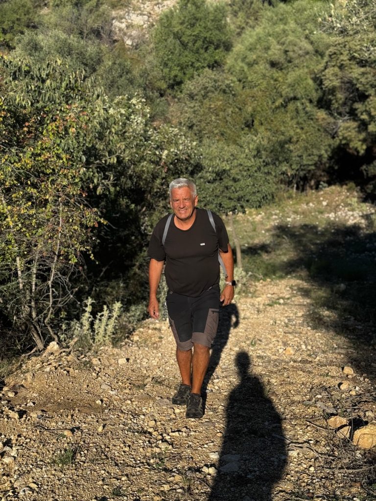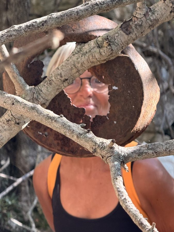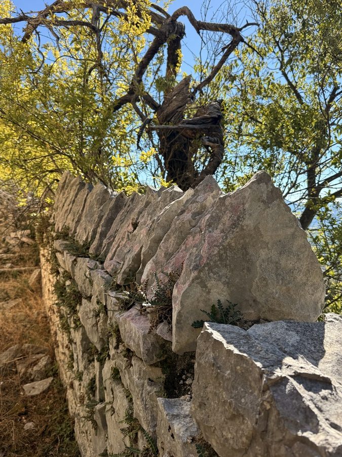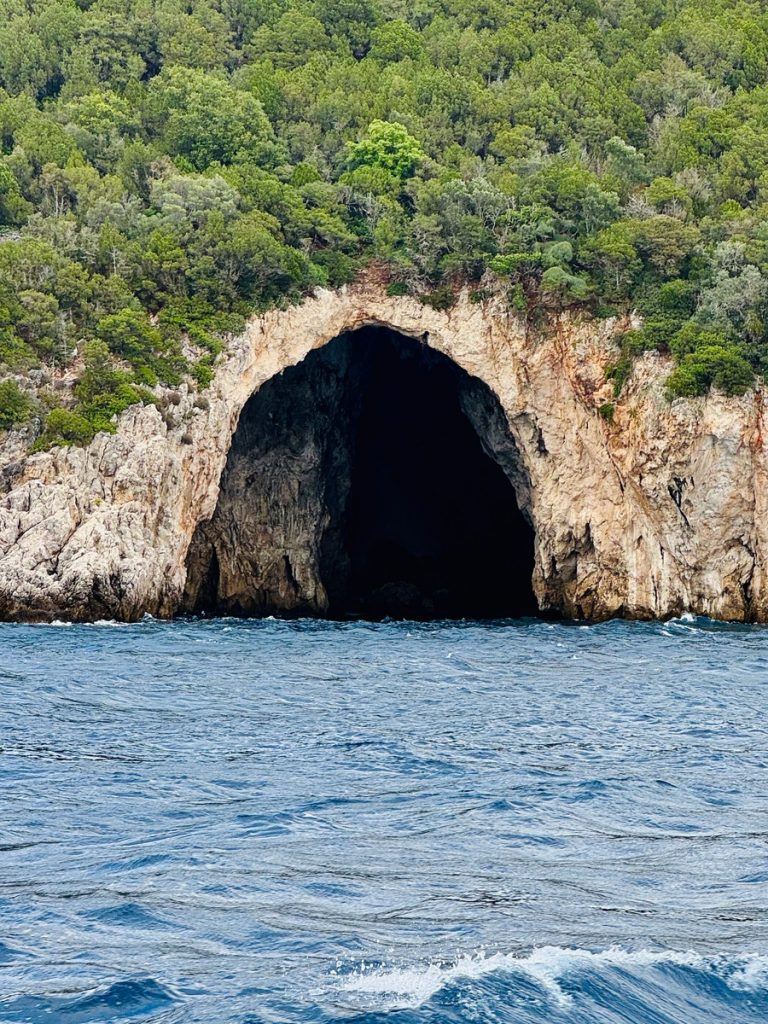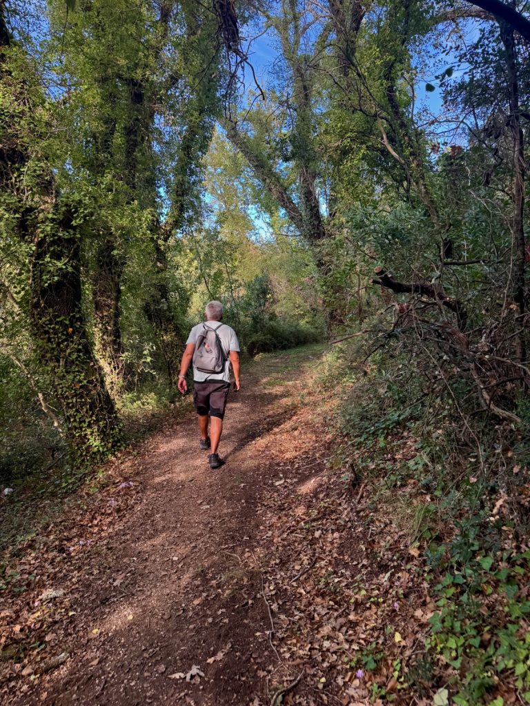 Hier nehmen wir einen gut bezeichneten schmalen Wanderweg, der uns unter einem grünen Blätterdach in eine Schlucht hinab und auf der anderen Seite wieder hinaufführt. Nachdem wir eine kleine Straße queren, tauchen wir wieder ein in einen grünen Urwald. Große, alte und von Efeu überwachsene Olivenbäume flankieren den Weg. Es sieht aus wie ein Feenwald und wir sind vollkommen allein unterwegs. Das war auf dem Küstenwanderweg noch anders. Wir sind begeistert! Nach einigen Kilometern erreichen wir unsere Ausgangsbucht, die sich unterdessen mit einigen weiteren Segelbooten gut gefüllt hat. Unser Dinghi liegt noch an Ort und Stelle. Da es bis zum Ufer nur ca. 100m waren, haben wir auf den Außenborder verzichtet und sind gepaddelt. Freundlicherweise hat der Wind gedreht, so dass wir auch auf dem Rückweg Rückenwind haben. Bevor es an die Sichtung der Fotos geht, schwimmen wir erstmal unsere Runden um das Boot und genießen die anschließende warme Dusche.
