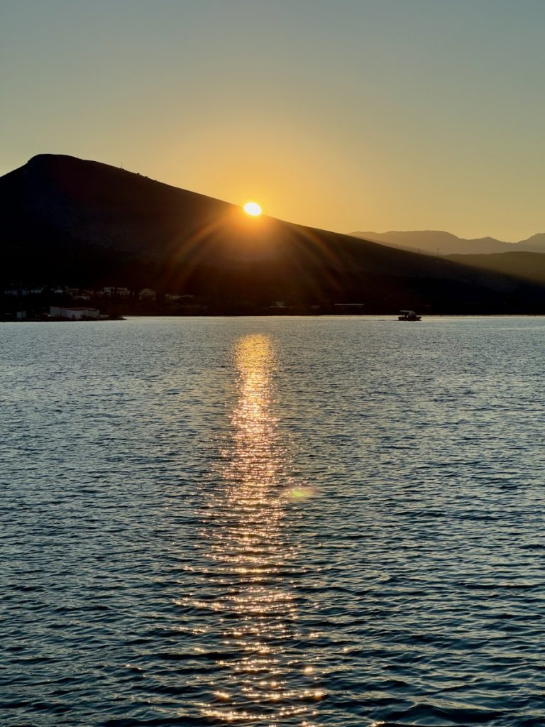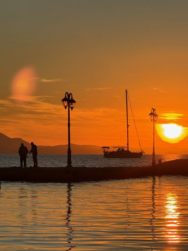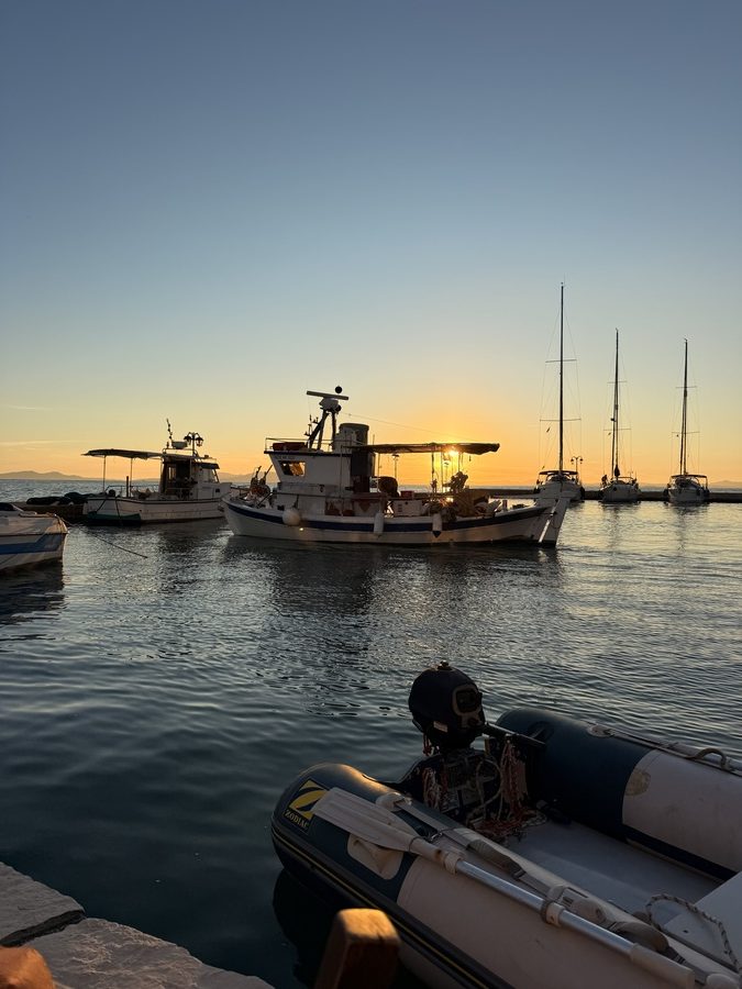 Am frühen Abend kehren wir zurück zum Hafen und genießen ein leckeres Abendessen bei untergehender Sonne in einer Fischtaverne. Der Wirt bittet uns in die Küche, wo er uns den frischen Fisch und die Meerestiere zeigt. Auf dem Herd steht eine lecker duftende Fischsuppe, die wir uns als Vorspeise bestellen. Danach gibt es gebratene Scampi, gegrillte Dorade und griechischen Salat. Zum Dessert spendiert das Haus selbstgemachtes Eis a la Cookie Dough – ein Genuss, der an Bord mit Ouzo begossen werden muss!