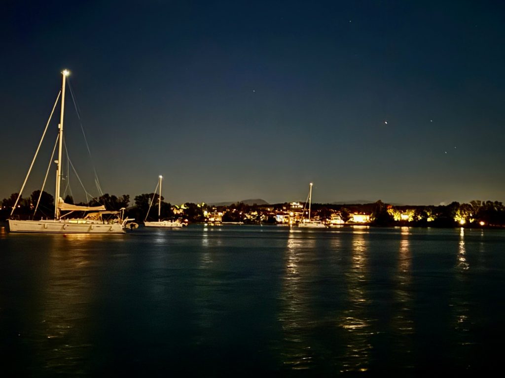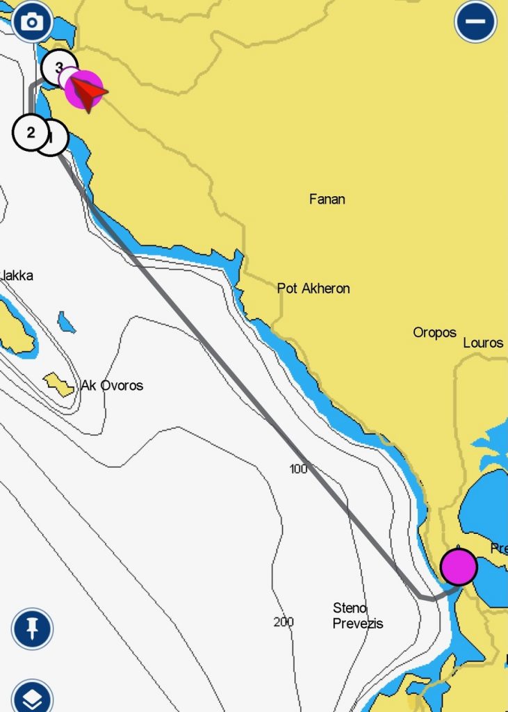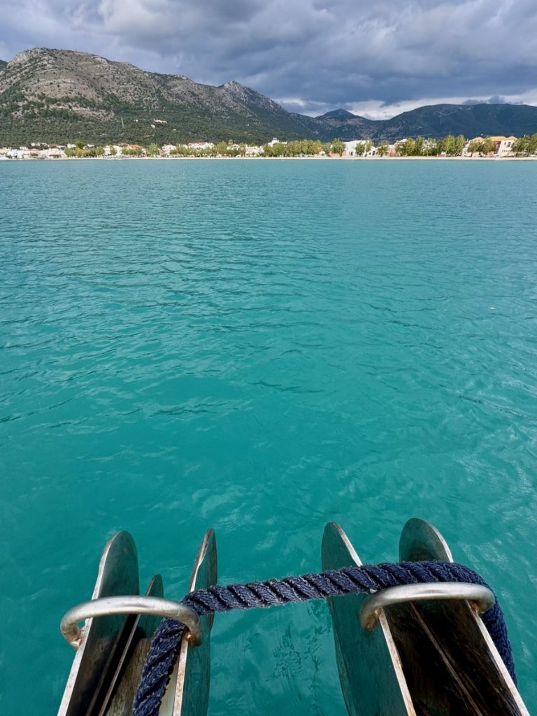 Nach einer abermals entspannten Nacht, wollen wir nun weiter: Korfu ruft immer lauter! Aber ist noch ein Stop in einer weiteren Bucht am Festland vorgesehen, die zwar nicht ganz so geschützt wie die von Igoumenitsa ist, bei Navily aber für die nächsten zwei Tage gute Ankerbedingungen bescheinigt bekommt. Der Wind weht leider nur sehr schwach und das erstmal direkt von vorn. So laufen wir unter Maschine durch das Fahrwasser hinaus aus der Bucht und folgen den Fähren Richtung Korfu. Hinter der kleinen Insel Nisi Prasoudi kommt etwas Wind auf und wir setzen die Segel. Bei 5-8 Knoten versuchen wir aufzukreuzen. Leider liefert uns der Wind Winddreher um 90 Grad gepaart mit einer sehr unbeständigen Brise. Mal sackt der Wind auf 3 Knoten weg, dann wechselt er die Richtung, zwingt uns abzufallen und bläst mit 10 Knoten. Beeindruckend ist hier wieder die Wasserfarbe. Wir kommen an den beiden Mündungsdeltas des Flusses Kalamas vorbei, der sich einige Kilometer im Inland teilt und hier ins Meer mündet. Er bringt seit ewigen Zeiten Sediment mit, dass das Meer hier milchig türkis färbt. Dabei scheint das Meerwasser das zufließende Süßwasser wie einen Schirm zu umspannen. Wir durchfahren die Trennlinie zwischen azurblau und türkis auf unseren Kreuzschlägen mehrmals.