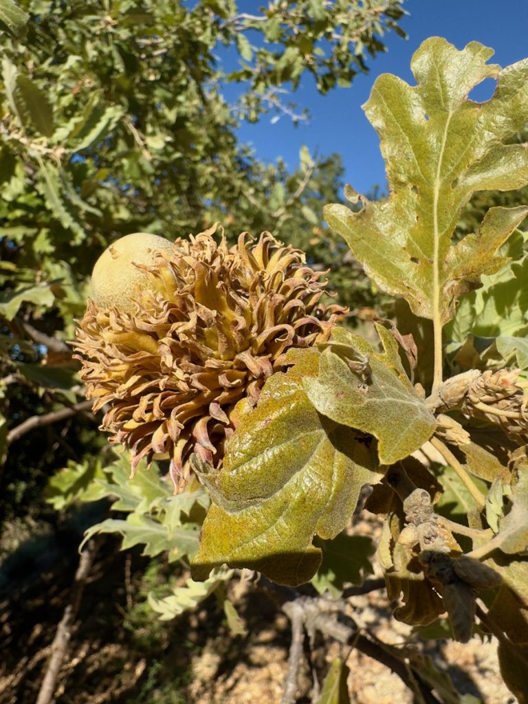 Mit dem Dinghi setzen wir zum Hafen über und entsorgen bei der Gelegenheit gleich mal unseren Müll. Dann führt uns der Weg durch das neue Sagiada und beständig bergan. Anfangs geht es durch dichtes Grün und Mücken jagen uns. Aber bald kommen wir höher, es wird trockener und wir werden mit tollen Ausblicken über den Hafen und das Delta des Kalamas belohnt. Der Weg ist auf weiten Strecken von einer besonderen Eichenart flankiert, der Kastanieneiche. Die Frucht sieht im frühen Stadium einer Kastanie sehr ähnlich, je reifer sie wird, desto deutlicher kann man in ihrer Mitte die Eichel erkennen.