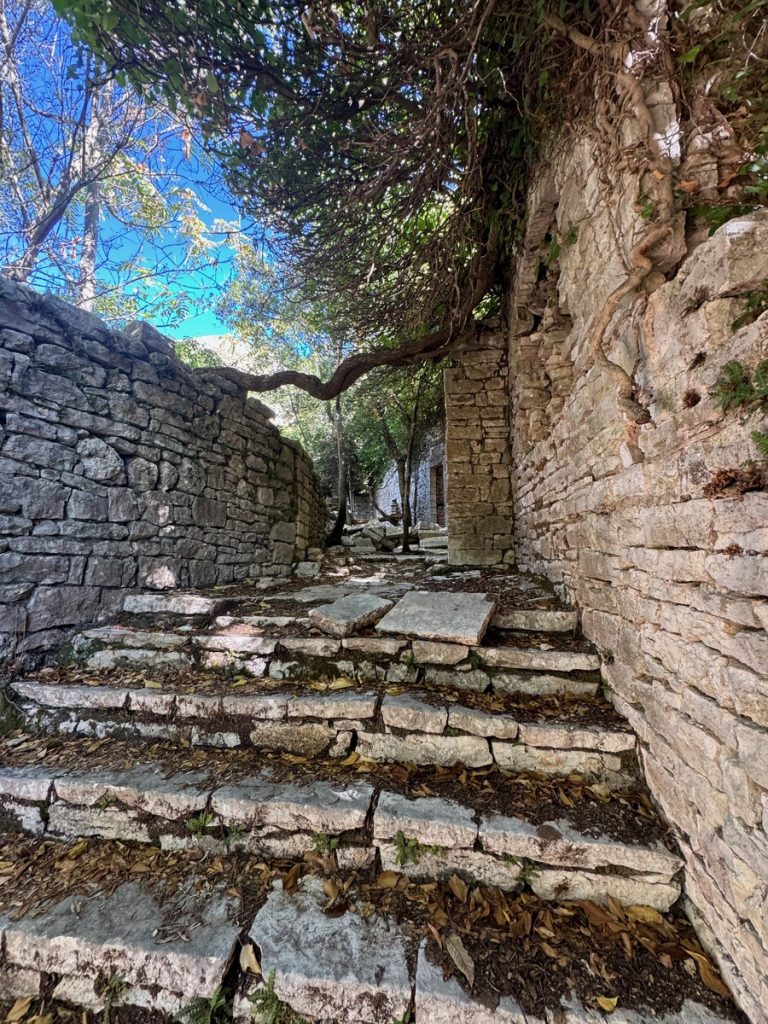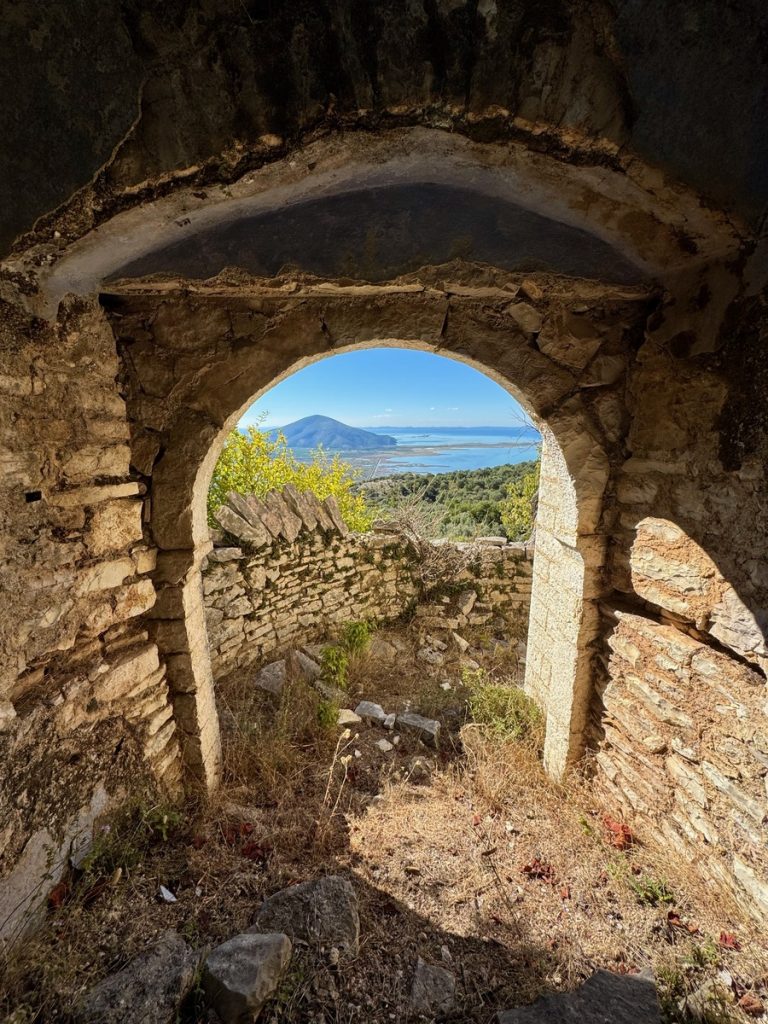 Trotz der Zerstörung gibt es im alten Dorf noch bemerkenswerte Beispiele traditioneller Architektur zu bestaunen. Mit Kopfsteinpflaster gepflasterte Straßen, alte Kirchen und halb verfallene Herrenhäuser, viele davon halb von Efeu überwuchert, erinnern den Besucher an die Vergangenheit. Der Salzhandel hatte die Gegend bereits in venizianischer Zeit zu einiger Bedeutung verholfen – davon zeugen die herrschaftlich wirkenden Gebäudereste. Im 19. Jahrhundert wurde der Ort durch Erdbeben zweimal stark beschädigt, aber wieder aufgebaut. Bis auf ein beeindruckendes Summen von Unmengen an Bienen im blühenden Efeu, herrscht heute absolute Ruhe. Auf dem zentralen Platz des Dorfes stößt man auf den alten Brunnen „Piadi” und die Kirche Agios Georgios mit ihren einzigartigen Fresken. Der Blick von diesem Punkt aus auf das Delta des Kalamas, das neue Dorf Sagiada samt Hafen und Booten ist atemberaubend und lädt uns zu einer kleinen Pause ein.