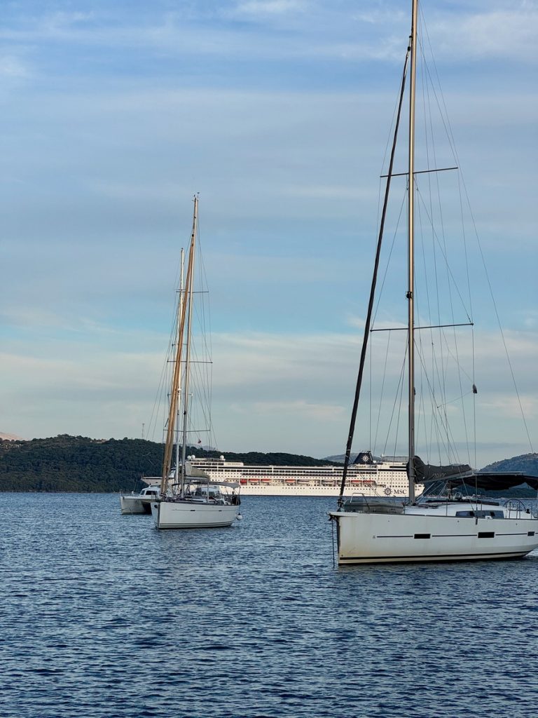 Die Bucht ist groß und fast leer. Etwas Sorge haben wir, dass die ein- und ausfahrenden Fähren nach Korfu, Sizilien und Paxos für Schwell sorgen, aber diese Sorge ist unbegründet. Die Fähren produzieren zwar etwas Welle, aber sie verlieren an Kraft, bis sie das Ankerfeld erreichen.
