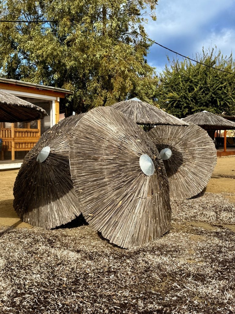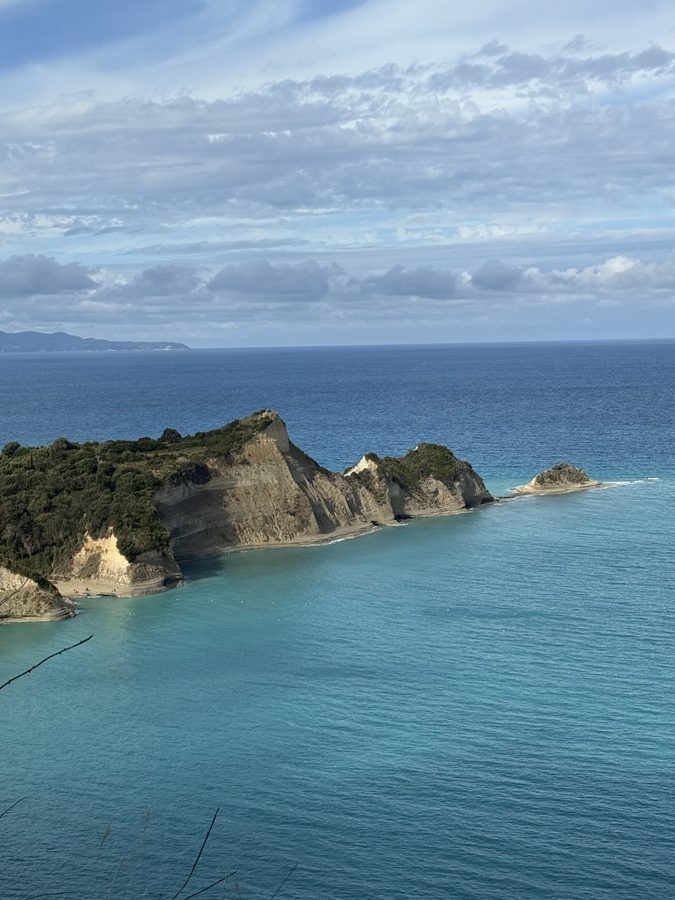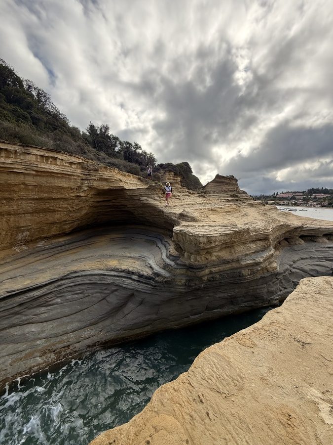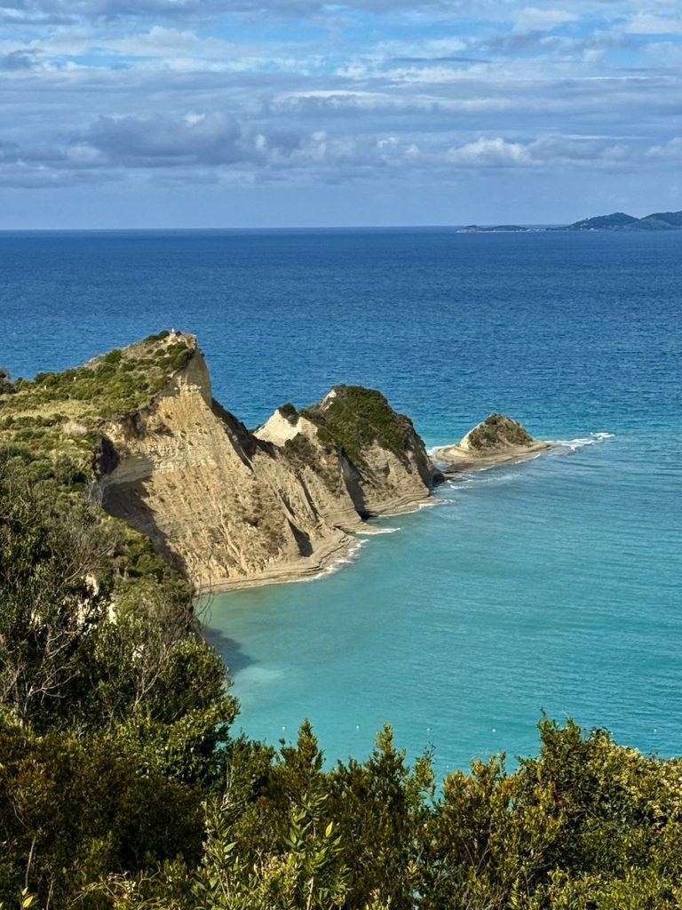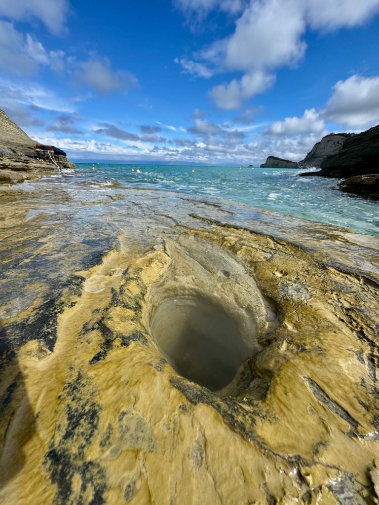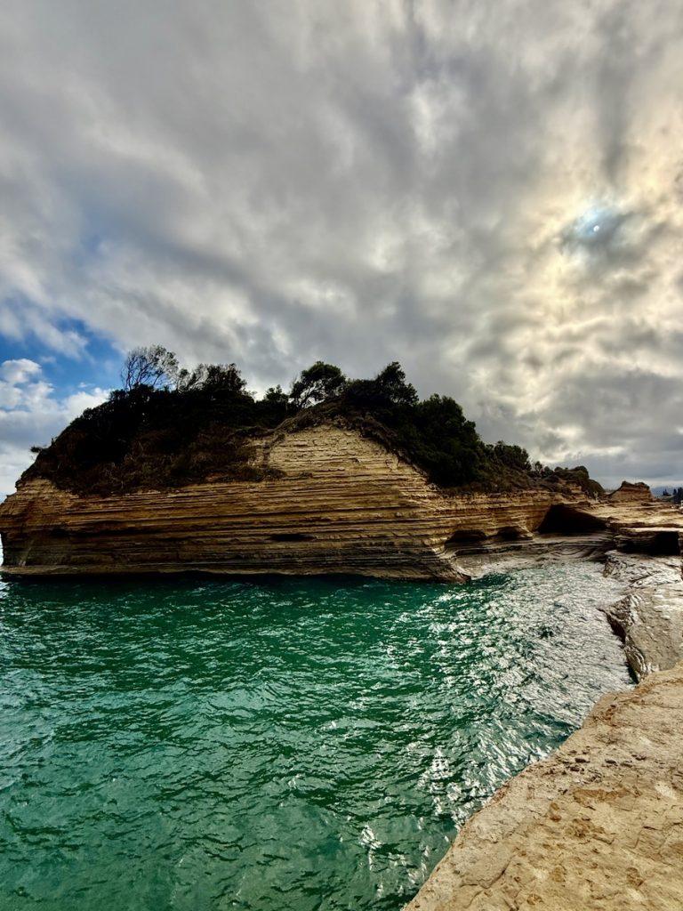 Nachts gab es nochmals kräftigen Regen – Venga! wurde gewaschen! Aber morgens ist es trocken und im Laufe des Tages soll auch die Sonne wieder herauskommen. Für unseren letzten Tag buchen wir Strom und Wasser in der Marina und Werner kümmert sich um das Befüllen unseres 700 Liter Frischwassertanks, damit wir die nächste Zeit genug süßes Nass für drei Personen an Bord haben. Heute steht ein Ausflug zur Nord-West-Spitze Korfus, zum Cap Drastis, auf dem Programm. Auf dem Weg dorthin, legen wir einen Zwischenstopp in Sitari ein und besuchen den bekannten „Kanal der Liebe“. Wir parken das Auto an der Strandbucht des Ortes und laufen die kurze Strecke zum Ziel am Strand entlang. Hier sieht es eindeutig nach Saisonende aus. Viele Tavernen und Cafes sind bereits geschlossen und haben nur ihre wenig einladend aussehenden defekten Sonnenschirme und wild gestapelten Sonnenliegen zurückgelassen.