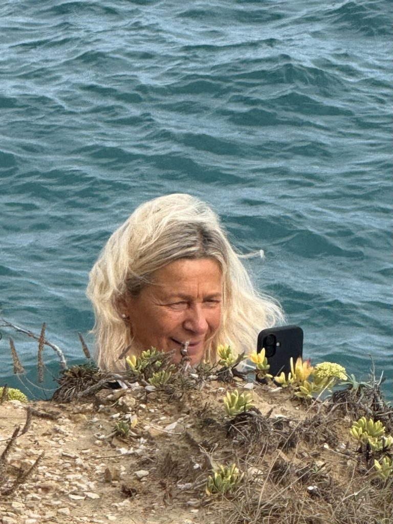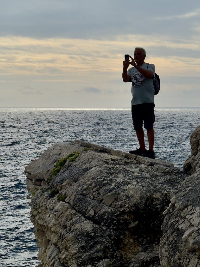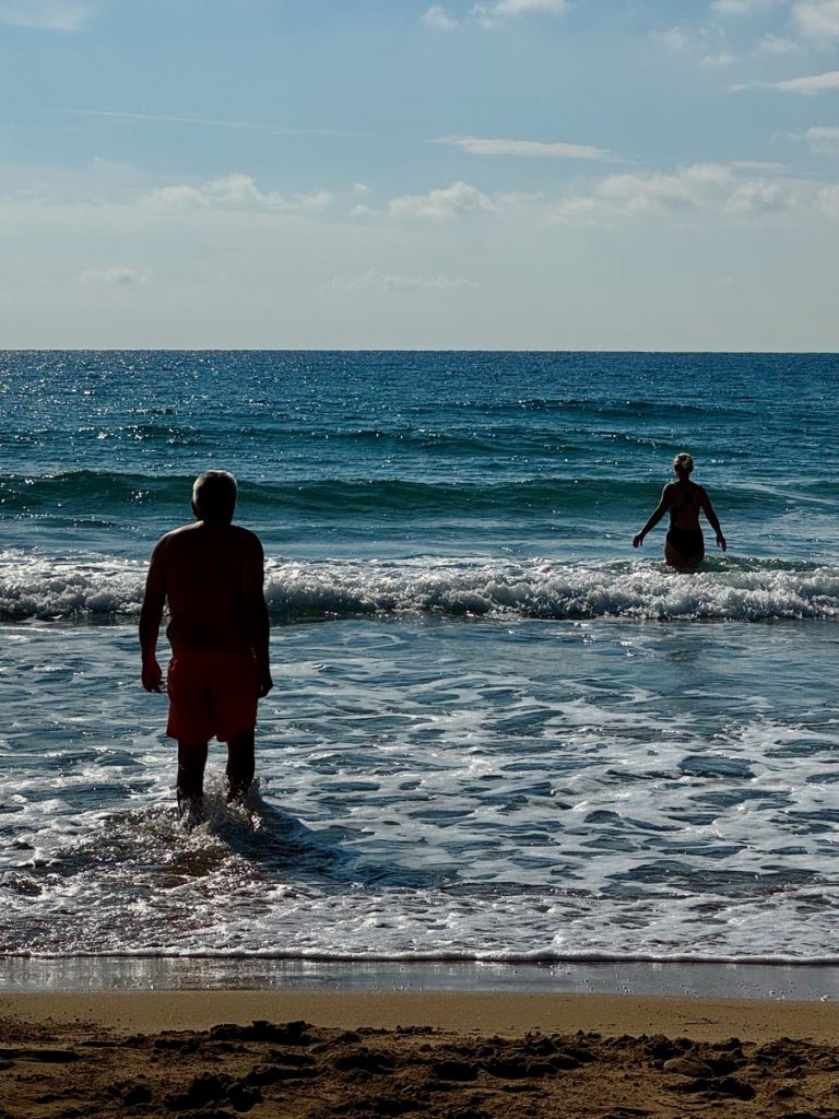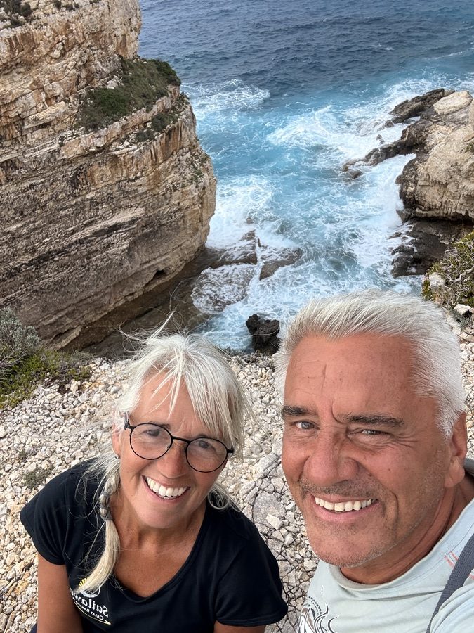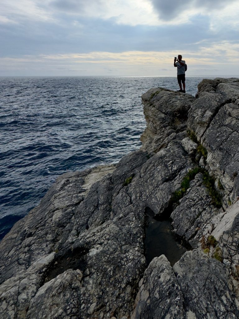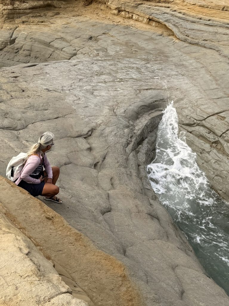 Der Kanal der Liebe ist eine schmale Bucht, die das Meer über Jahrtausende hier aus dem Kalksandstein gewaschen hat. „Eigentlich“ ist das Wasser wunderbar türkis und still. Heute steht die Welle direkt hinein und an Schwimmen ist überhaupt nicht zu denken. Trotzdem ist der Ort wunderschön mit seinen verschiedenfarbigen Gesteinsschichten und dem brodelnden Wasser. Wir erleben ihn zudem relativ leer, weil das Wetter nicht so einladend scheint und wegen des Saisonendes. Wir mögen uns gar nicht vorstellen, wie es hier im Sommer zugeht! Monika lässt es sich nicht nehmen, am benachbarten geschützten Strand, eine kleine Strecke zu Schwimmen.