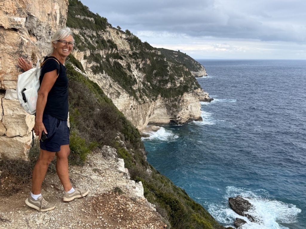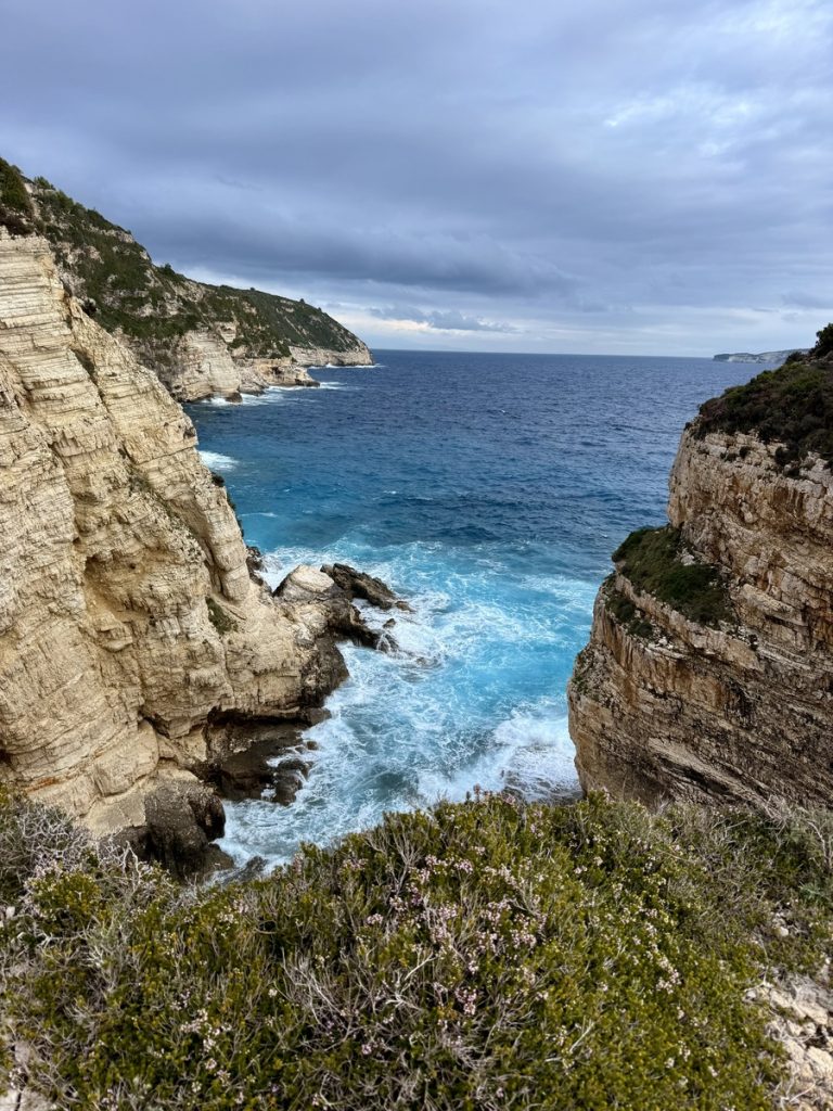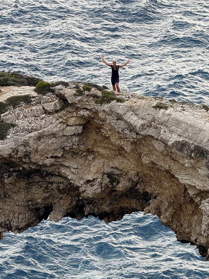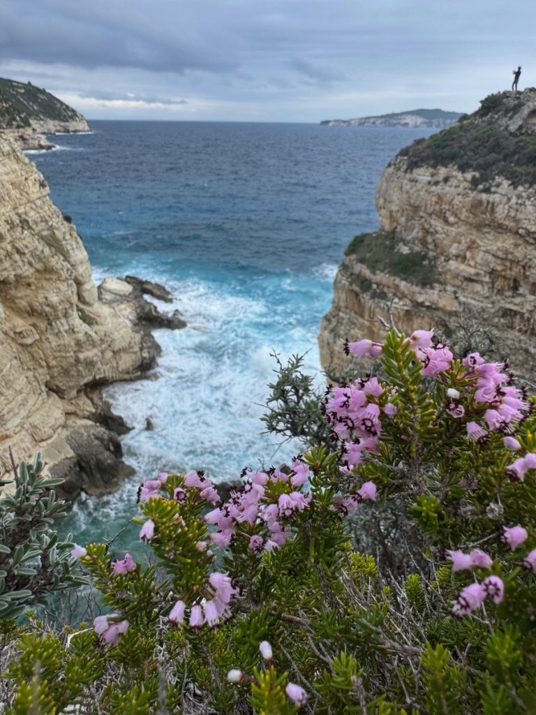 Nachmittags brechen wir zu einer Wanderung entlang der Westküste auf. Es geht auf Wirtschaftswegen, kleinen Straßen und malerischen Eselswegen erst Richtung Norden, bevor wir zur Küste nach Westen abbiegen. Der gewählte Weg führt uns zum imposanten, 20 Meter hohen Tripitos-Bogen. Er ist der Überrest einer eingestürzten Meereshöhle. Der Abstieg ist steil und es bedarf neben festem Schuhwerk sowohl Trittsicherheit, als auch Schwindelfreiheit, ihn zu erreichen und auf einem schmalen Pfad zu überqueren. Aber das lassen wir uns natürlich nicht entgehen. Unter uns kocht das türkisfarbene Meer, denn auch hier stehen nach dem kräftigen nächtlichen Winden ordentliche Wellen. Oben trägt der Bogen eine Kappe aus Maccia und Heide – sehr hübsch!