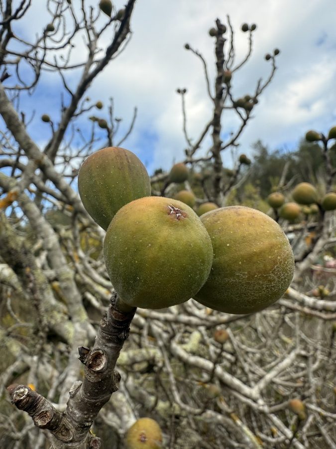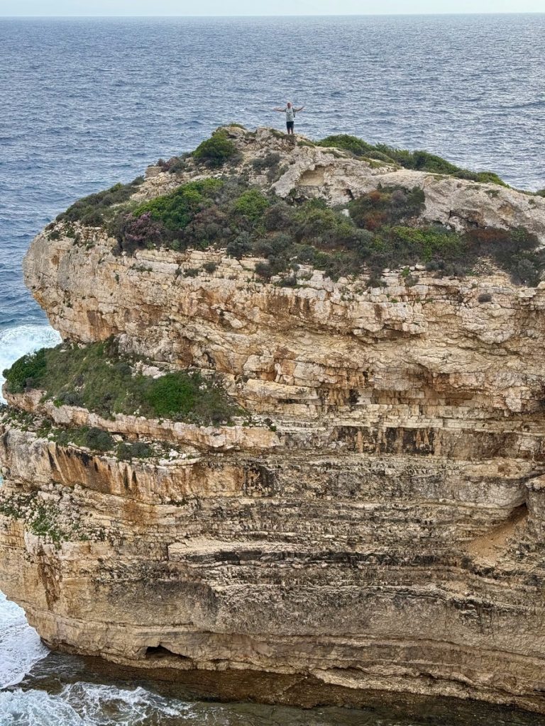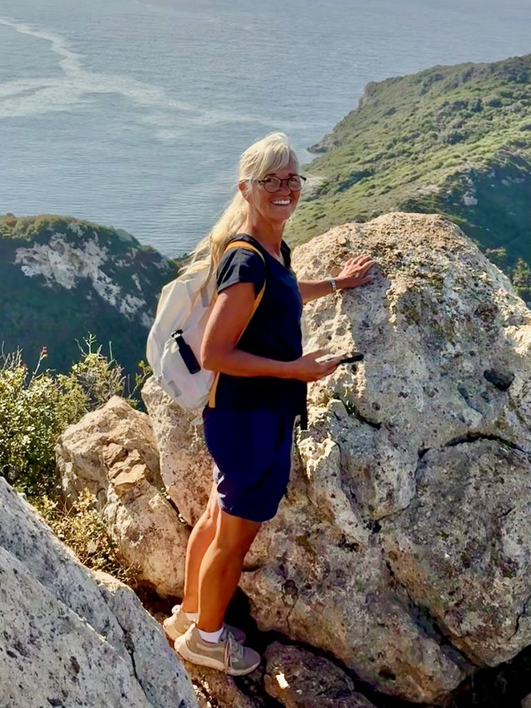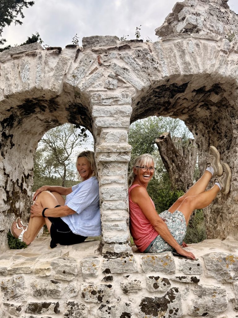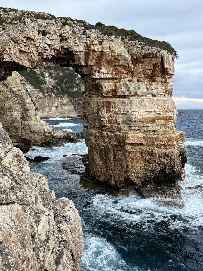 Nachmittags brechen wir zu einer Wanderung entlang der Westküste auf. Es geht auf Wirtschaftswegen, kleinen Straßen und malerischen Eselswegen erst Richtung Norden, bevor wir zur Küste nach Westen abbiegen. Der gewählte Weg führt uns zum imposanten, 20 Meter hohen Tripitos-Bogen. Er ist der Überrest einer eingestürzten Meereshöhle. Der Abstieg ist steil und es bedarf neben festem Schuhwerk sowohl Trittsicherheit, als auch Schwindelfreiheit, ihn zu erreichen und auf einem schmalen Pfad zu überqueren. Aber das lassen wir uns natürlich nicht entgehen. Unter uns kocht das türkisfarbene Meer, denn auch hier stehen nach dem kräftigen nächtlichen Winden ordentliche Wellen. Oben trägt der Bogen eine Kappe aus Maccia und Heide – sehr hübsch!