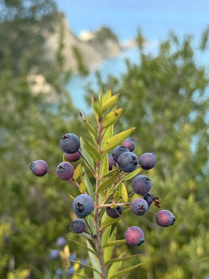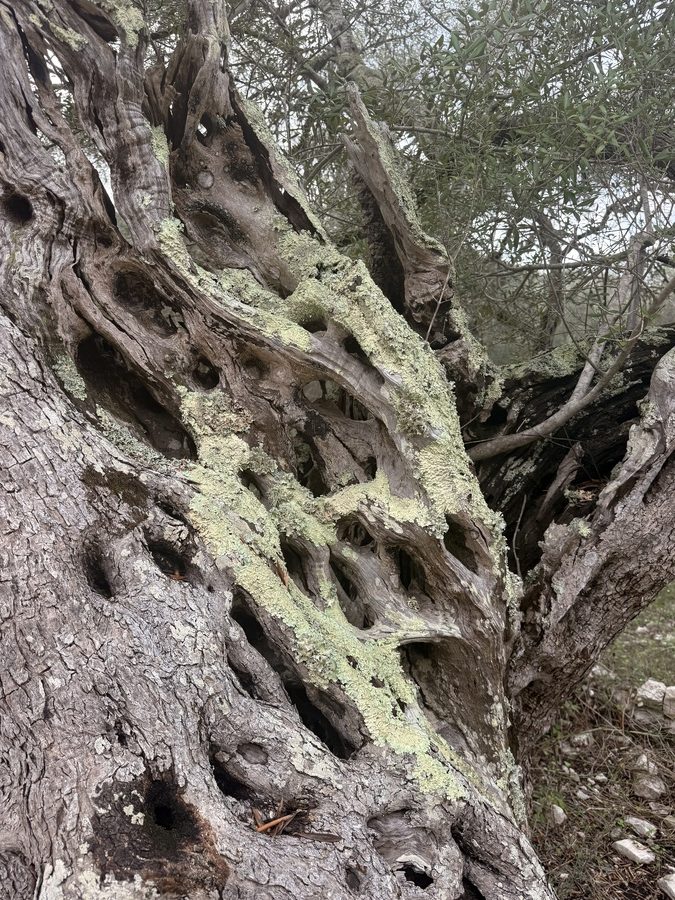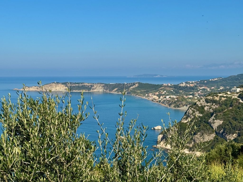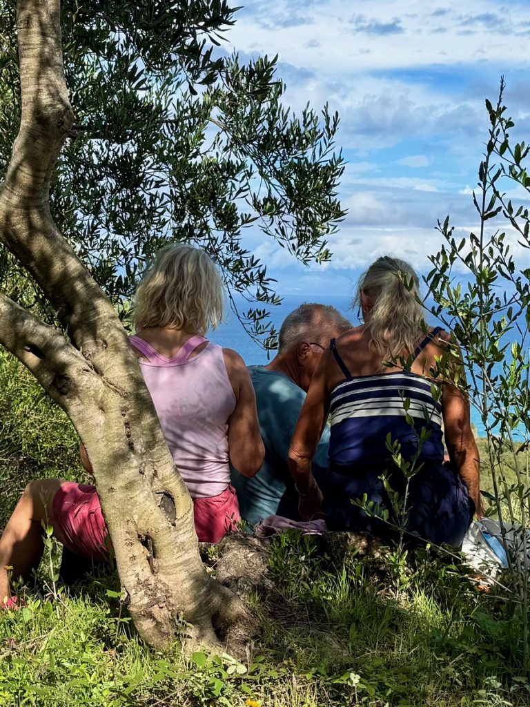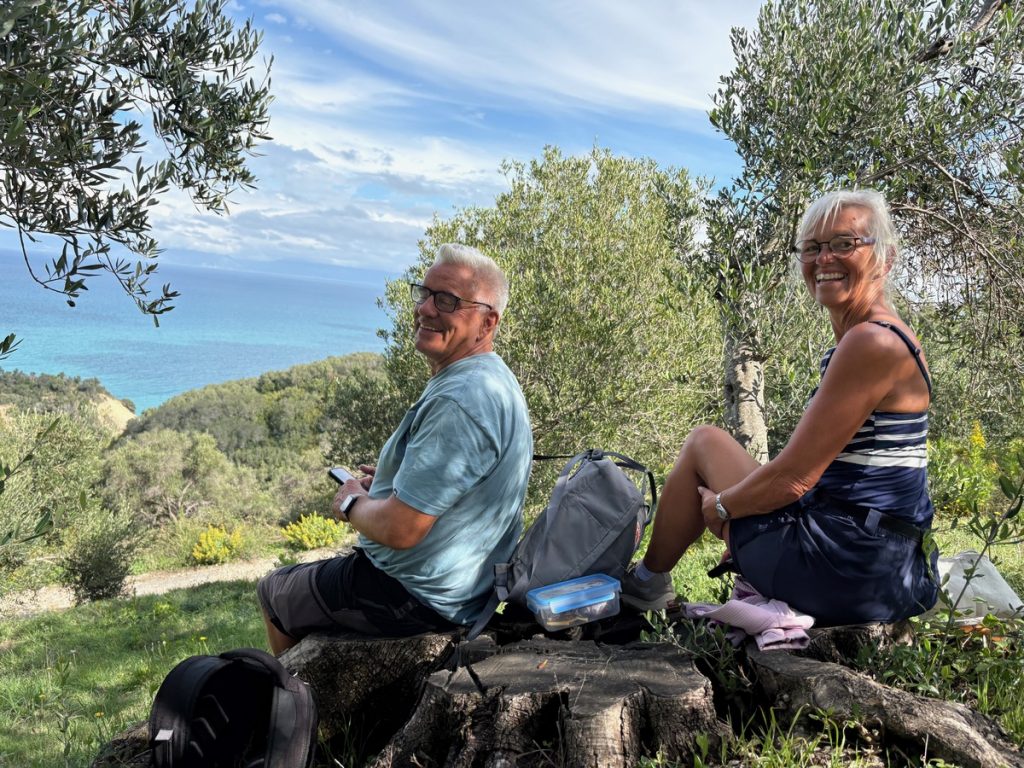 Nur wenige Kilometer weiter parken wir das Auto erneut und beginnen eine Wanderung durch Olivenhaine bis zum Cap Drastis. Wir finden einen schönen Picknickplatz auf dem Stumpf eines abgesägten Olivenbaumes mit fantastischer Aussicht.