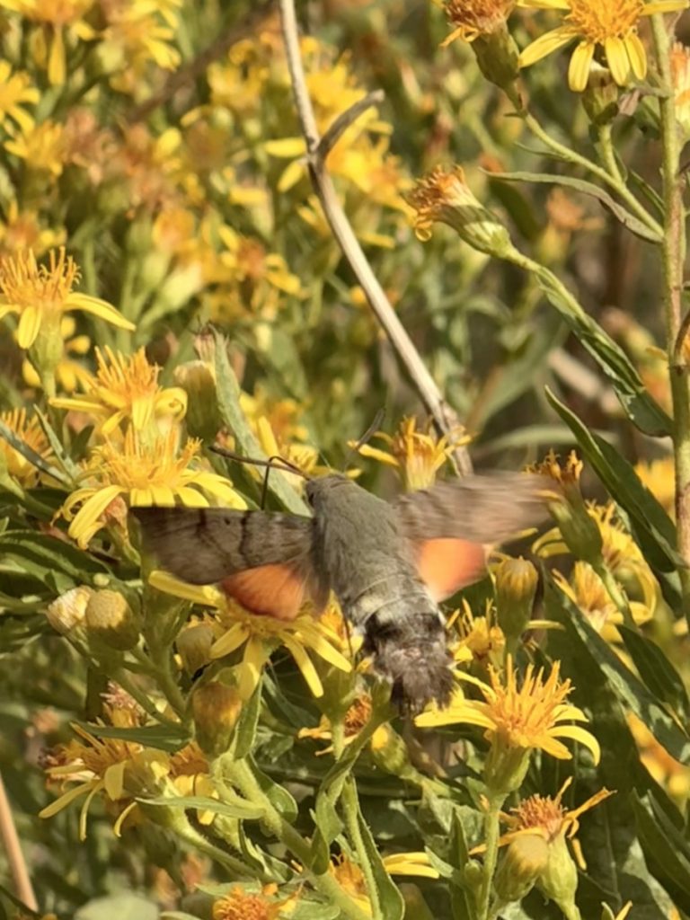 Gestärkt geht es weiter zu einem kleinen Strand am Fuße des im Privatbesitz befindlichen Caps. Leider steht auch hier zu viel See für ein Bad. Trotzdem nehmen wir uns ausgiebig Zeit, um die besondere Stimmung dieses Ortes in uns aufzunehmen. Anschließend heißt es wieder bergauf stiefeln zu den Aussichtspunkten und dann den Rückweg zum Auto antreten. Sobald wir uns vom Besucherparkplatz entfernen, treffen wir kaum noch auf andere Touristen und haben die Natur für uns allein. Unterwegs beobachten wir Schmetterlinge und ein putziges Insekt, dass durch seinen schnellen Flügelschlag auffällt. Es handelt sich um ein Taubenschwänzchen, auch Kolibrischwärmer genannt. Dieser tagaktive Nachtfalter fliegt mit bis zu 80 Flügelschlägen pro Sekunde im Schwirrflug und kann so kurze Zeit in der Luft stehen bleiben, um Nektar zu saugen. Im Vergleich zu den entspannten Kaisermantel Schmetterlingen, ist es eine echte Herausforderung dieses „hektische“ Tierchen zu fotografieren.