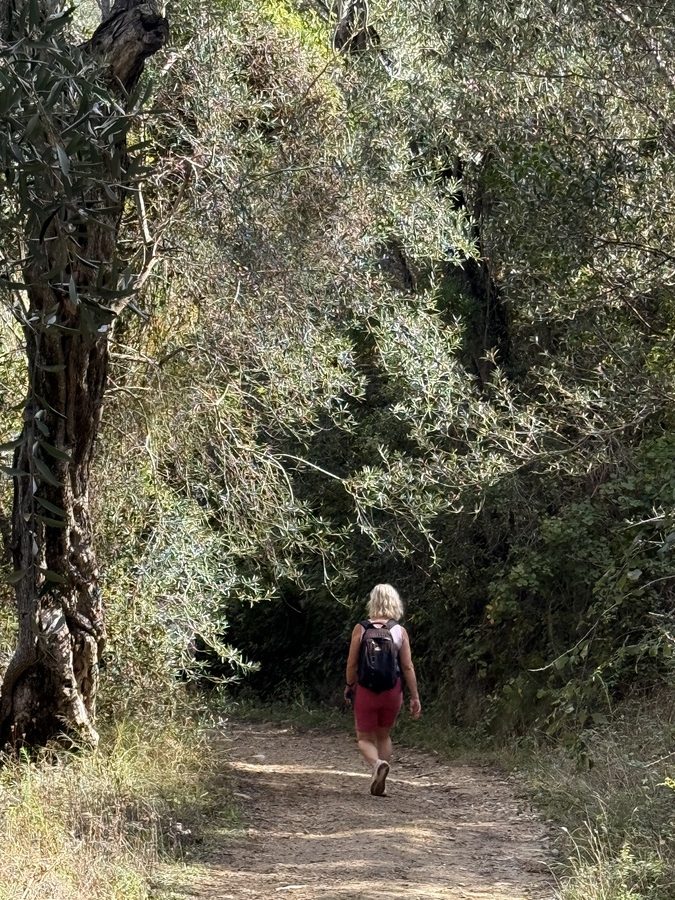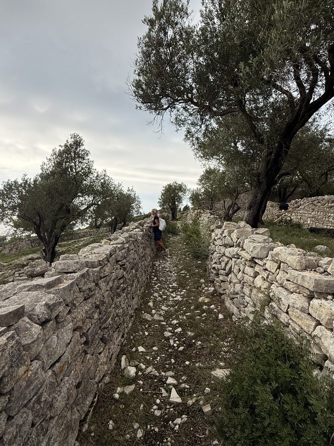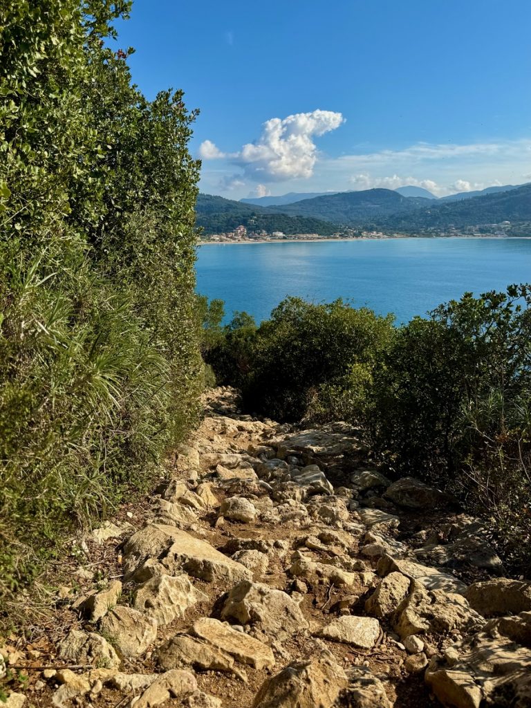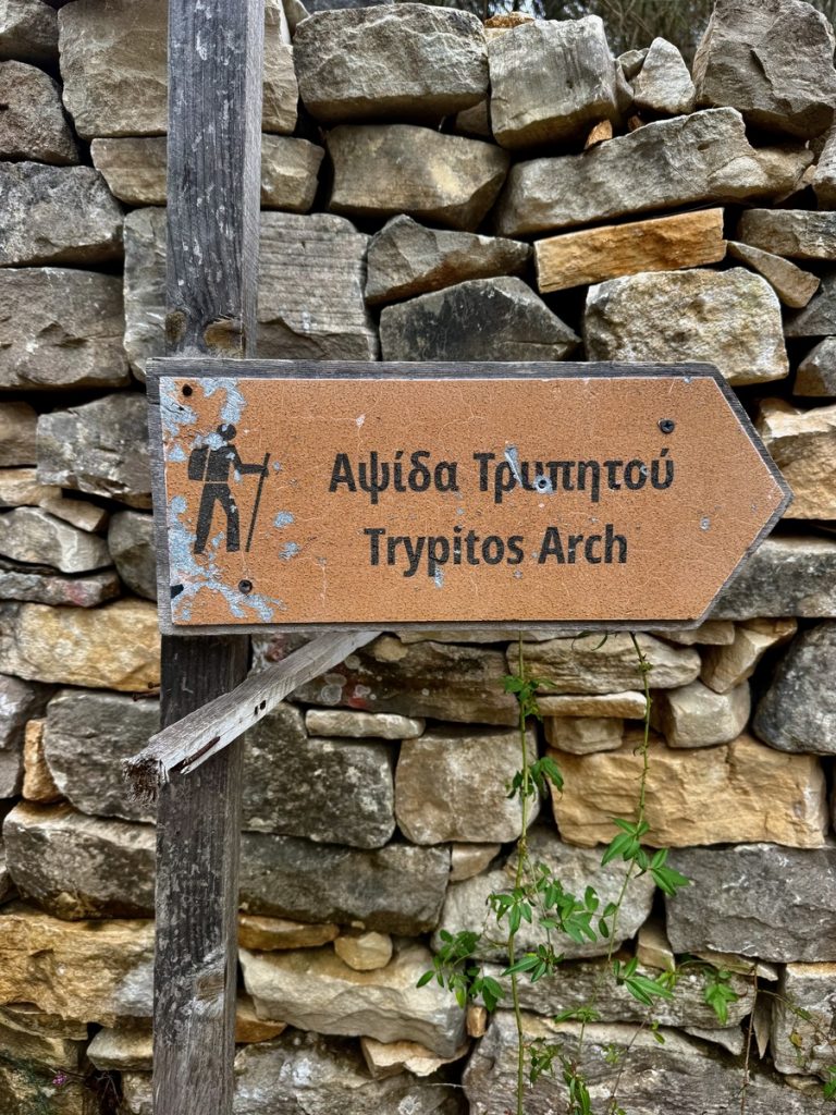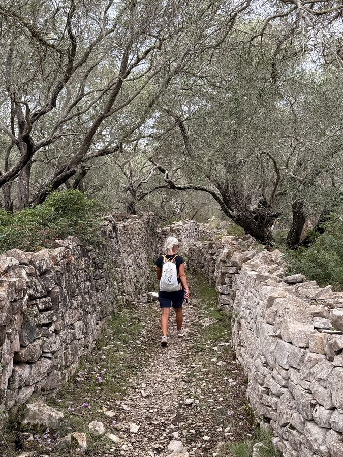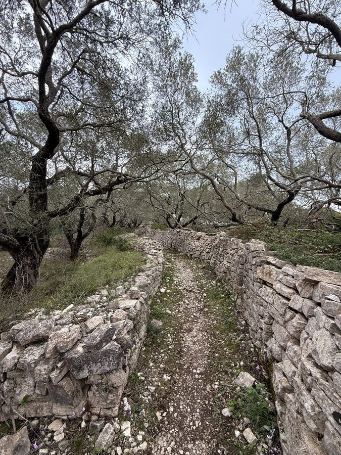 Wir folgen dem Pfad weiter in Richtung Norden und können so auch noch ein paar schöne Fotos von der anderen Seite des Bogens machen. Auch auf dem Rückweg geht es wieder über schmale Eselspfade, die zu beiden Seiten von Natursteinmauern begrenzt sind. Der verwitterte graue Stein zusammen mit den verdrehten Stämmen der alten Olivenbäume, ihren graugrünen Blättern und Flechten sieht wie ein verwunschener Feenwald aus. Paxos gefällt uns immer besser und das war sicherlich noch nicht unser letzter Besuch. Hier gibt es noch so viele Wanderwege für uns zu entdecken!