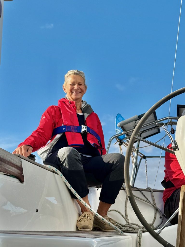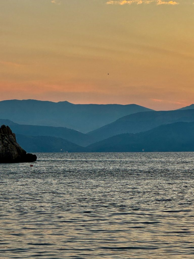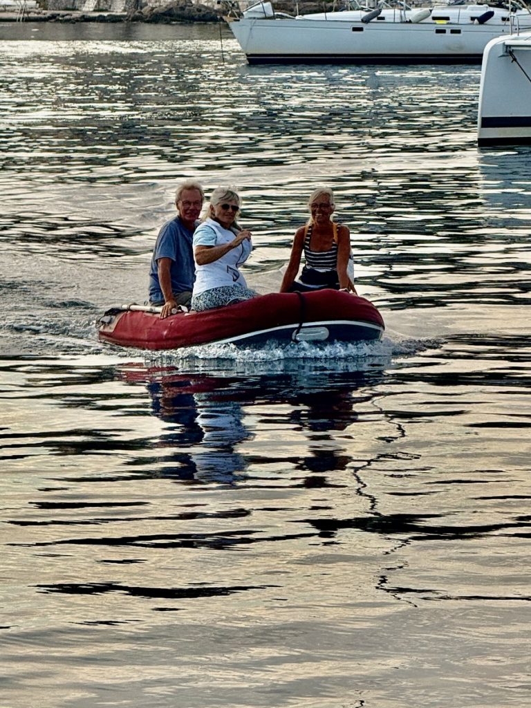 Nach einer Wohneinheit, brechen wir zum Landgang auf. Zum Ufer ist es nicht weit, Werner rudert die Damen an den Strand. Dort beginnt ein kleiner Pfad, der in den idyllische kleinen Ort führt – auch hier ist Saisonende, aber einzelne Tavernen und Cafés haben noch geöffnet. Nach einem kurzen Rundgang nehmen wir am Hafen ein Getränk und schauen Hafenkino bis die Sonne hinter dem Höhenzug versinkt. Nun wird es Zeit zurückzukehren. Wir haben Hunger und ohne Sonne wird es schnell frisch. Die Bucht hat sich ordentlich gefüllt – mit etwas Abstand wirkt es, als liege Boot an Boot. Nach dem Abendessen ist es stockdunkel und wir bringen nur noch die Ankerkralle an – zu einem Heckankermanöver hat niemand mehr Lust und das Rollen ist erträglich, wiegt uns vielleicht sogar in den Schlaf. Wir leuchten noch der (angetrunkenen) deutschen Jugend-Crew des Nachbarbootes, die vom Abendessen zurückkommen und ihr Boot nicht finden, weil sie jegliche Beleuchtung vergessen haben – und auch die Orientierung an Land ordentlich gelitten hat. Dann geht es nach einem abschließenden Schlaftrunk zufrieden in die Koje.