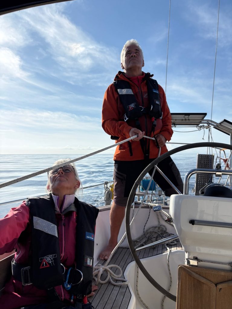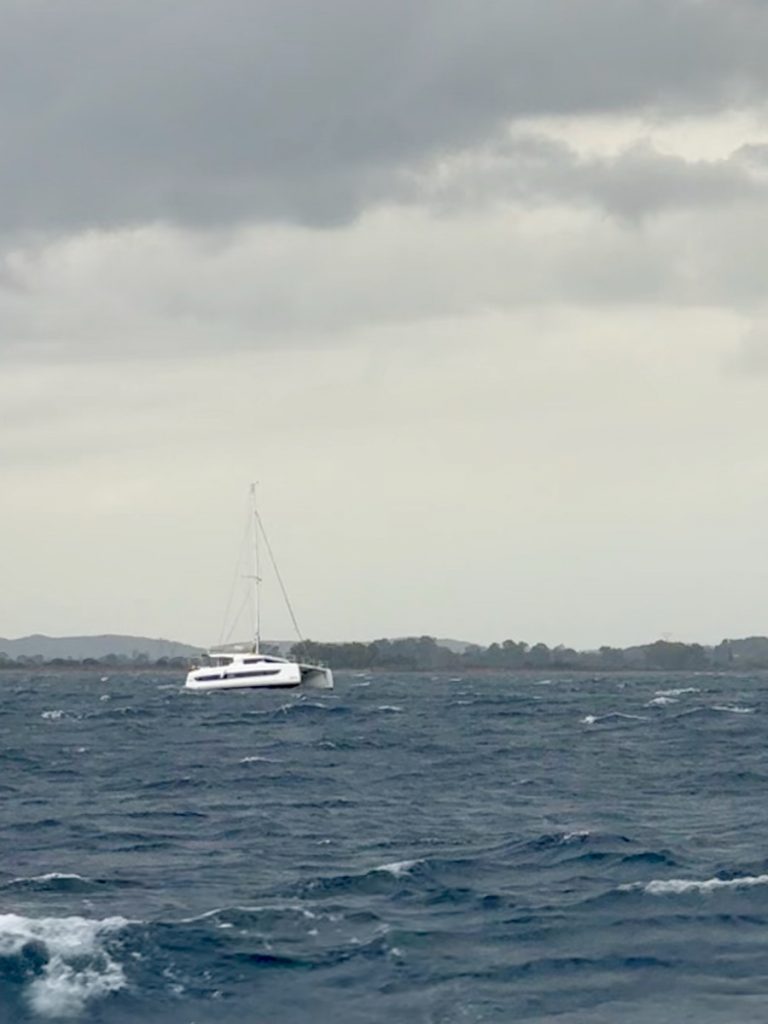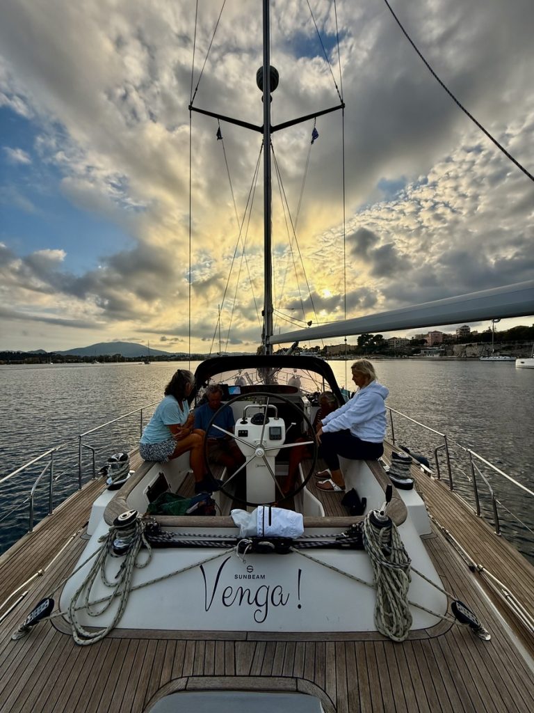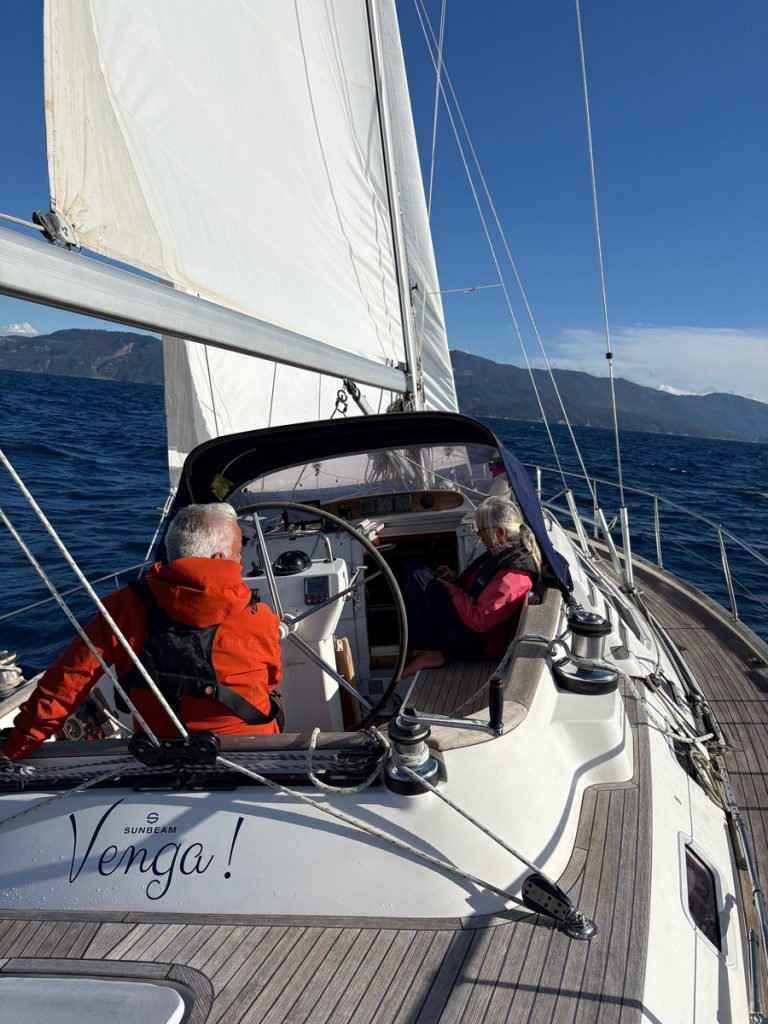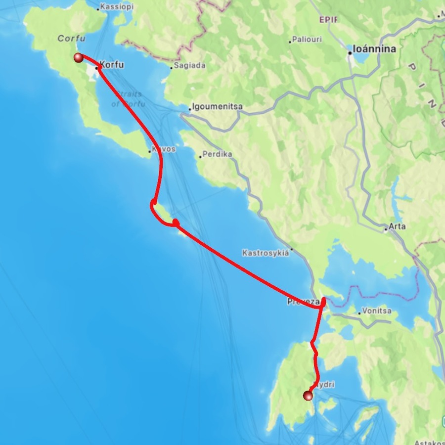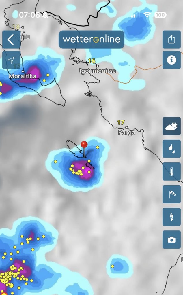 Regen und Gewitter wecken uns nach einer erholsamen Nacht. Ein Blick in das Regenradar von WetterOnline zeigt uns, dass es gegen 10:00 aufreißen soll. Also können wir ganz in Ruhe unseren Morgenkaffee genießen und die Zeit nutzten, alles an Bord wetterfest zu verstauen. Hier in der Bucht merken wir wenig vom Wind und gar nichts von der Welle, die draußen steht. Wir wollen – oder müssen (Werner hat einen Flug am Samstag ab Preveza) – heute deutlich Meilen Richtung Südosten machen. Wir haben ab morgen einen Liegeplatz im Vlycho Segelclub auf Lefkas gebucht. Die Brückenöffnungen im Kanal von Lefkada passen für uns heute nicht. Es gibt eine Öffnung mittags um 14:00 Uhr, aber wir haben 30 Meilen Luftlinie bis dort. Die letzte Öffnung ist um 19:00 Uhr und damit bei Sonnenuntergang. Bis zum nächsten Ankerplatz hinter der Brücke wären es noch 10 Seemeilen. Das wollen wir nicht, weil wir dann erst bei Dunkelheit am nächsten geschützten Ankerplatz ankämen. Also setzen wir das Ziel auf Preveza. Als wir unsere geschützte Bucht verlassen, begrüßen uns knapp 20 Knoten Wind und eine respektable Welle von 1,50 bis 1,80m. Wir setzen beide Segel im ersten Reff und segeln erstmal auf die Küste zu, hoffend, dass dort weniger Welle steht. Die Hoffnung erfüllt sich zwar, aber leider schläft auch der Wind zusehends ein. Wir reffen erstmal aus, geben aber bei 5 Knoten Wind auf und starten die Maschine. Das Groß lassen wir stehen und motor-segeln so entlang der Küste auf leichten Kreuzkursen, immer so, dass das Segel noch steht. Über dem Festland stehen dunkle Wolken, die sich aber im Laufe des Nachmittags verziehen und der Sonne auch hier Platz machen. Das Wellenbild ändert sich nachdem wir den Schutz der Inseln Paxos und Antipaxos verlassen haben. Nun kommt zur Windwelle aus Südost der Mittelmeerschwell aus Westen hinzu. Dieser zeigt sich in langgezogenen Wellen, die Venga! sanft anheben und wieder absenken. Die Windwelle lässt zum Glück nach, so dass die Fahrt unter Motor recht entspannt verläuft. Trotz teilweise bedecktem Himmel und dem Gegenwind von 12 Knoten, reicht eine leichte Windjacke. Die Damen an Bord tragen zwar dünne lange Hosen, aber barfuß sind wir alle. Es hat über 20 Grad Ende Oktober auf See!
