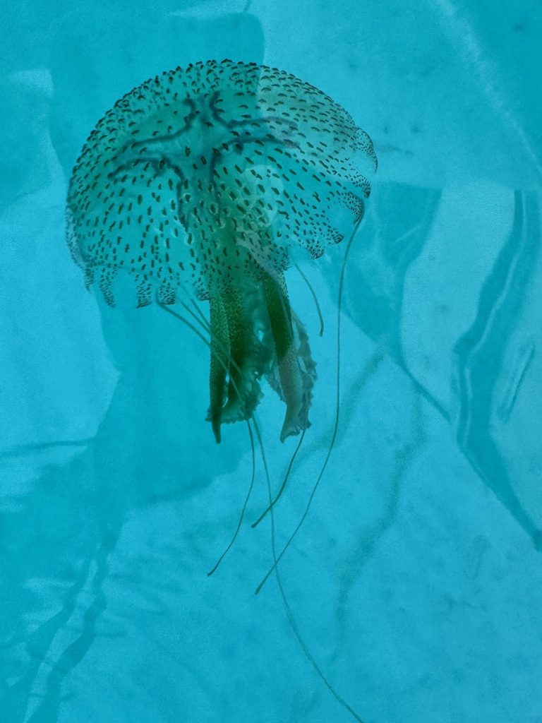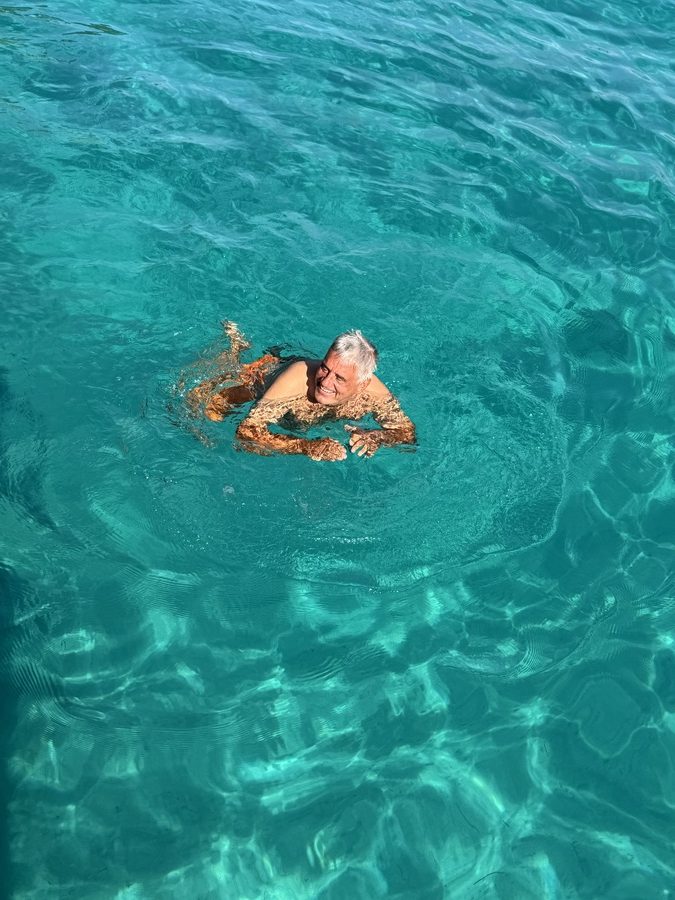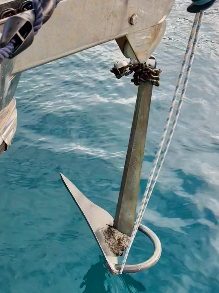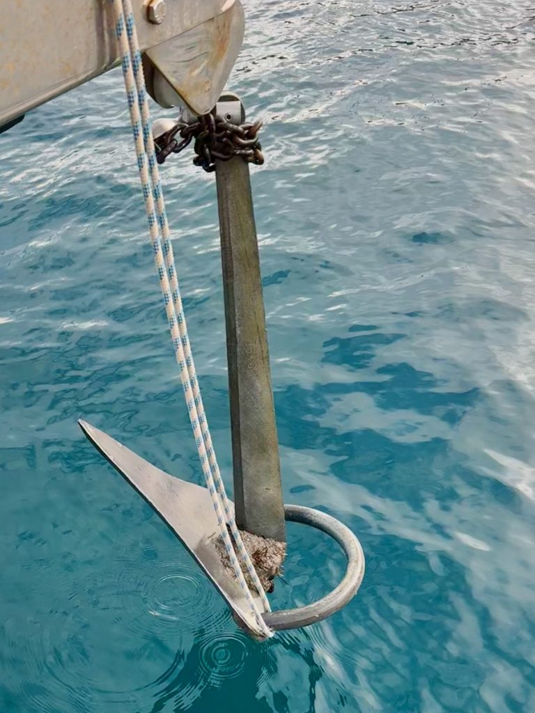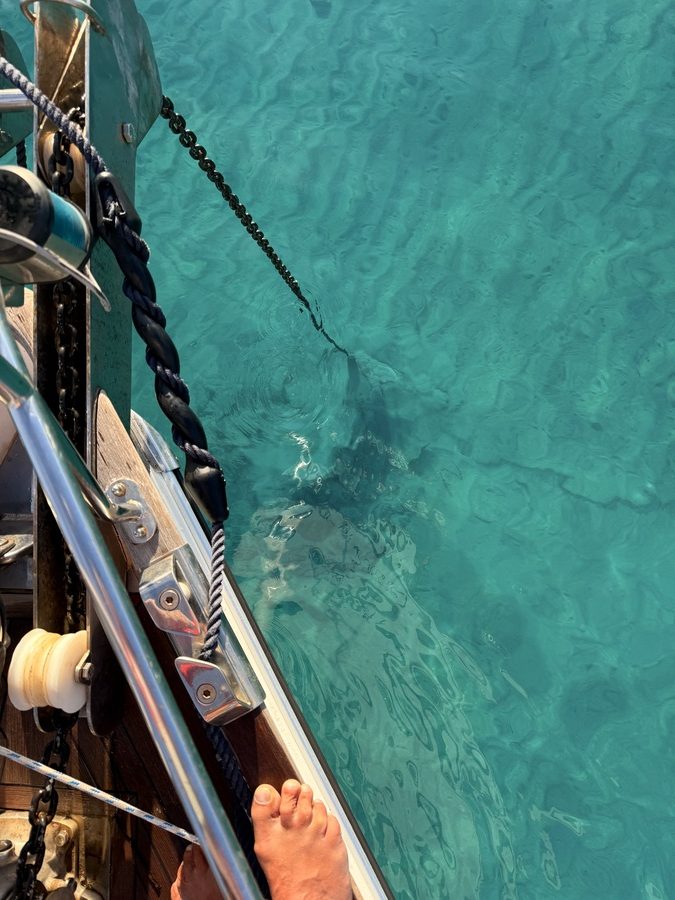 Die ausgewählte Bucht empfängt uns gegen Mittag mit karibischem Wasser. Der Anker fällt am Eingang zur Bucht auf 3m Tiefe. Wir springen direkt ins 21 Grad warme Wasser. Das Wasser ist kristallklar und man kann am Grund genau sehen, wo unsere Kette liegt und wo sich der Anker eingegraben hat. Wir sehen eine einzelne kleine Qualle und versuchen herauszufinden, ob es sich um eine harmlose oder eine giftige handelt. Leider hilft uns Google diesmal nicht weiter, also halten wir sicherheitshalber Abstand!