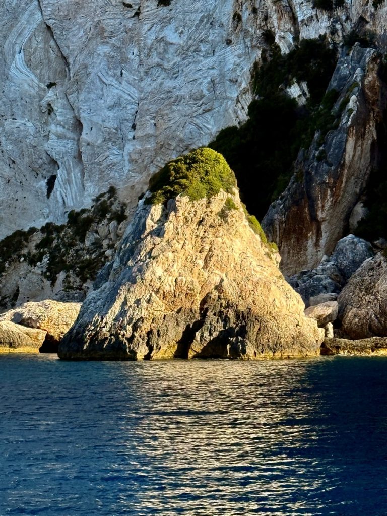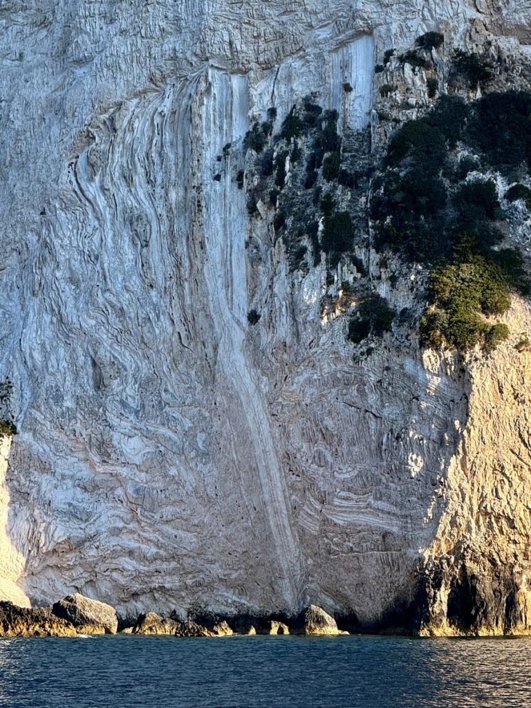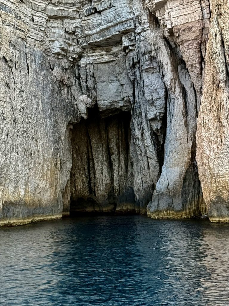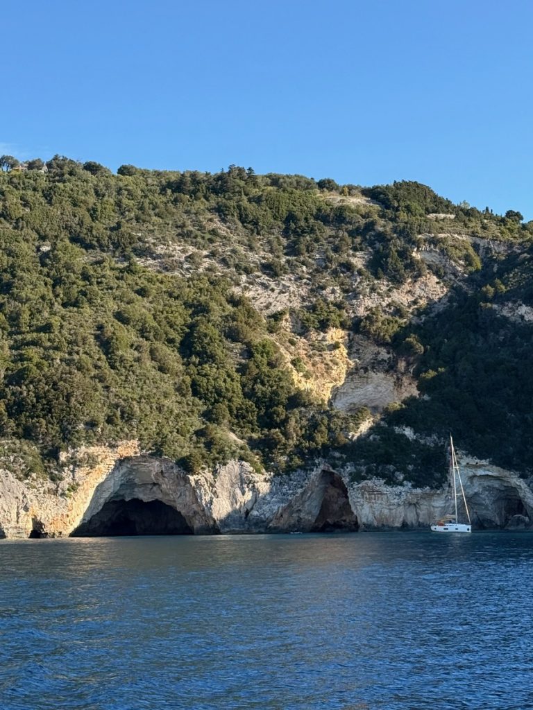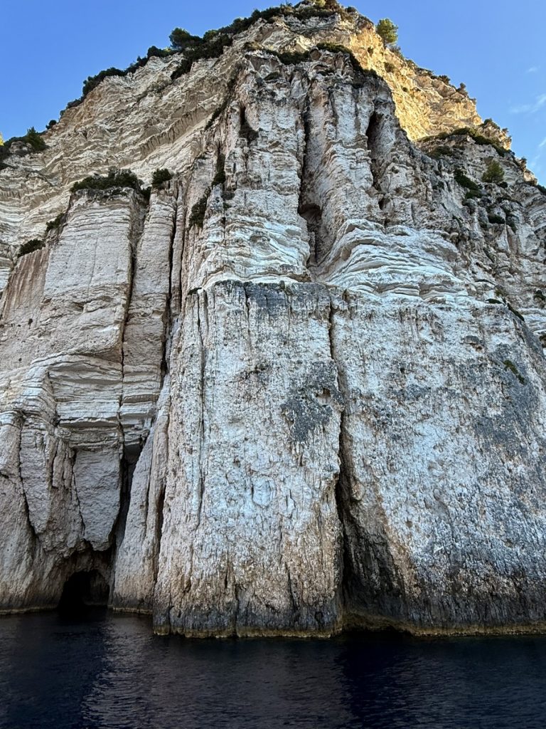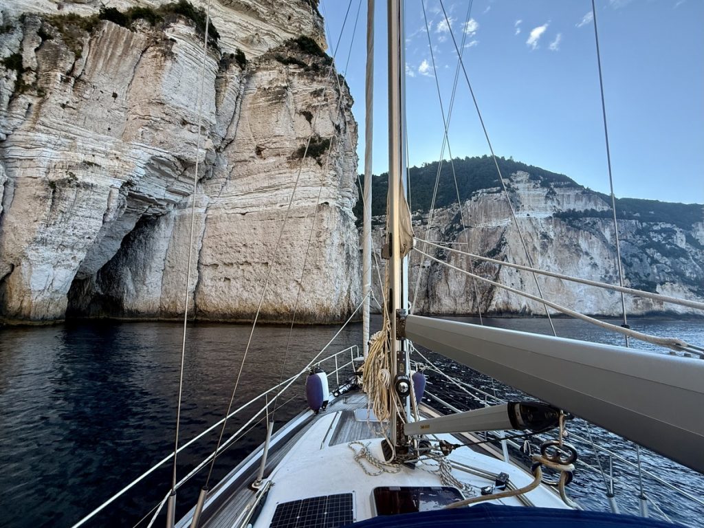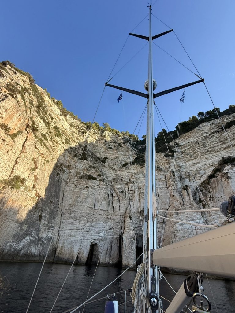 Heute kommt es uns ganz gelegen, dass es keinen Wind gibt, so können wir in Schleichfahrt an der imposanten Westküste von Paxos entlangfahren und die Felsformationen und Höhlen bewundern. Es wird ganz still an Bord, so werden wir von diesem Naturschauspiel gefangen genommen. So steil, wie sich die Klippen neben uns erheben, so steil fallen sie auch unter Wasser noch ab. Daher können wir uns auf zwei Bootslängen nähern und alles ganz aus der Nähe betrachten. Die Dimension ist auf Fotos nur schwer einzufangen. Lediglich als wir einen ankernden Segler in einer Bucht entdecken, deren Crew im Dinghi in eine der Höhlen fährt, wird auch auf den Fotos deutlich, wie hoch die Küste ist. Die Kalksteinküste erreicht an ihrem höchsten Punkt ca. 100 Meter. Unser Mast hat eine Höhe von 20 Metern. Uns beeindrucken die Schichtungen der Felsen, die mal waagerecht, mal diagonal bis senkrecht und manchmal sogar wie aufgerollt wirken. Zudem hat das Meer über Jahrtausende wahre Kunstwerke in die Felsen geschnitzt. Wir sehen meterhohe Säulen und Bögen, die an Kathedralen erinnern.