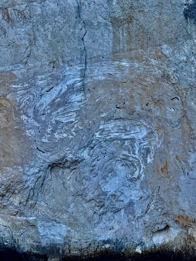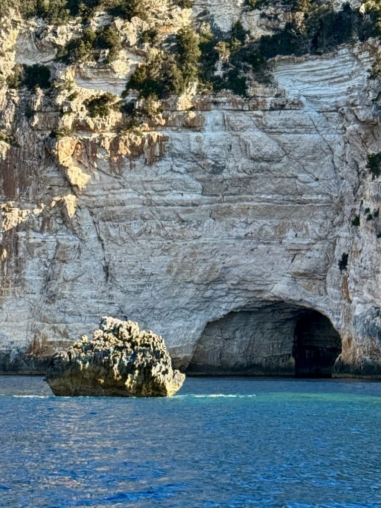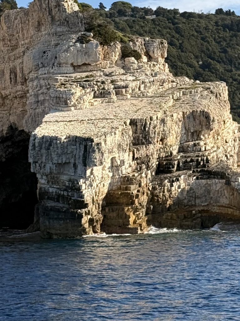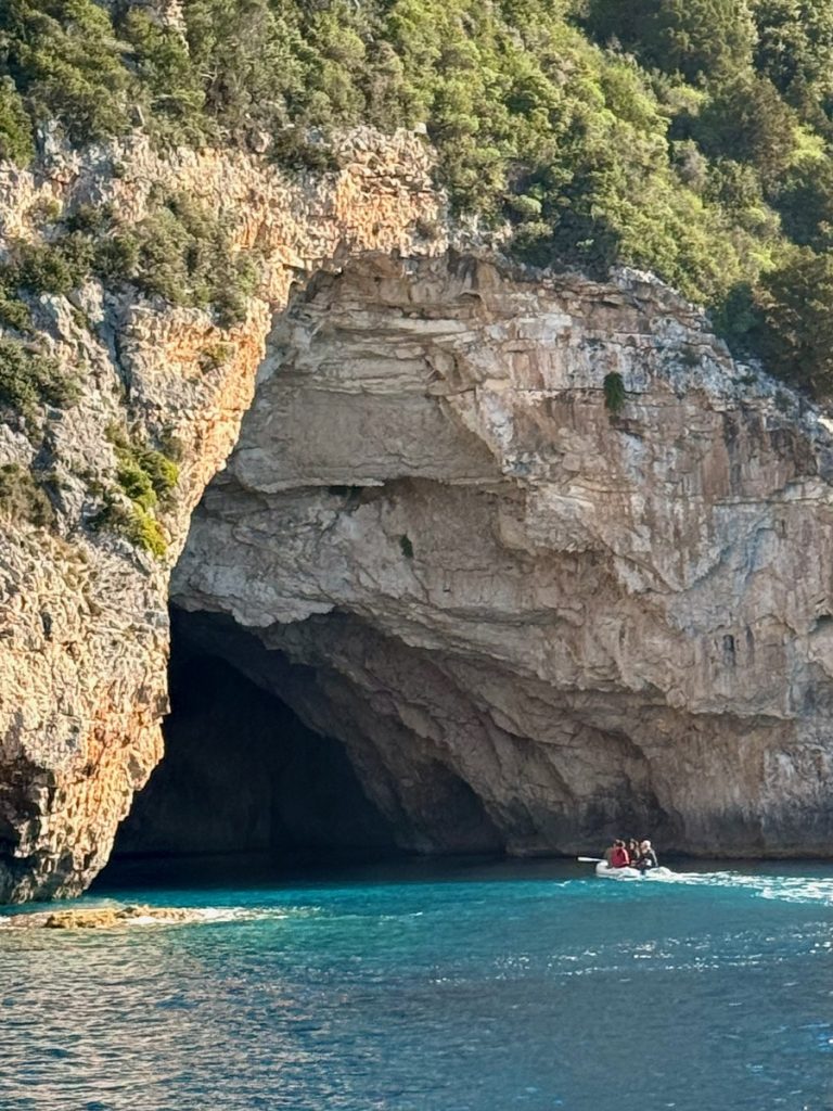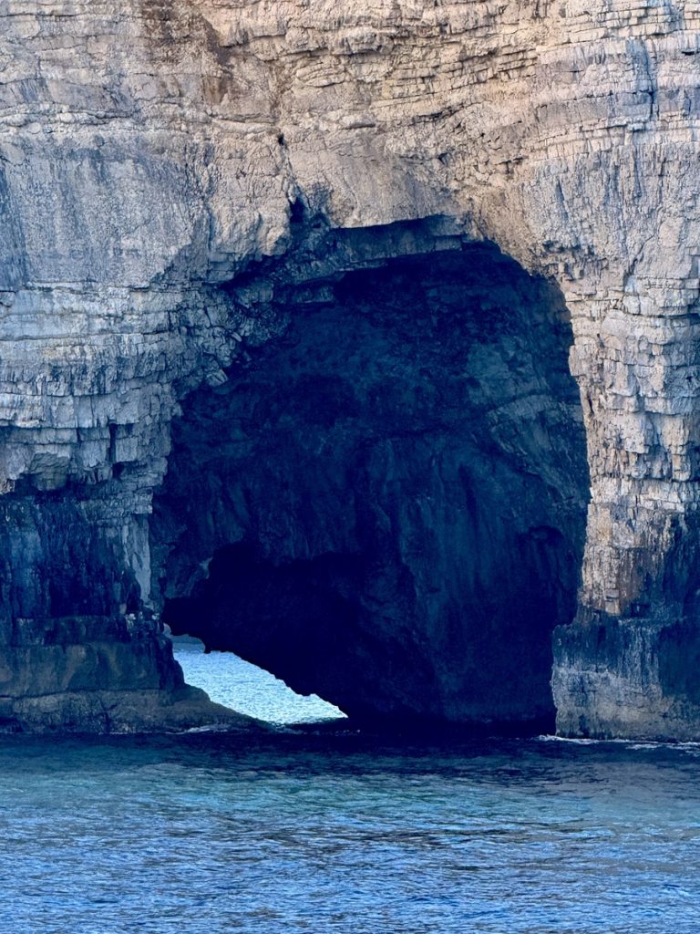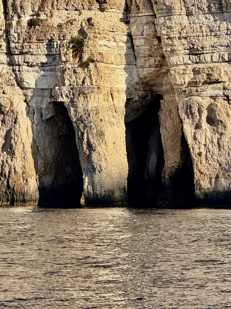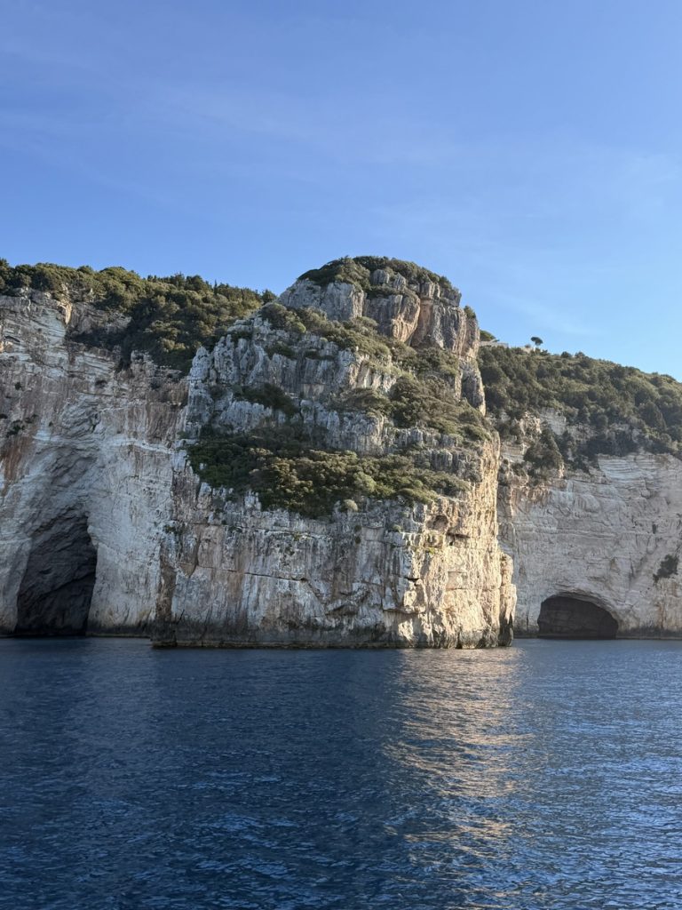 Heute kommt es uns ganz gelegen, dass es keinen Wind gibt, so können wir in Schleichfahrt an der imposanten Westküste von Paxos entlangfahren und die Felsformationen und Höhlen bewundern. Es wird ganz still an Bord, so werden wir von diesem Naturschauspiel gefangen genommen. So steil, wie sich die Klippen neben uns erheben, so steil fallen sie auch unter Wasser noch ab. Daher können wir uns auf zwei Bootslängen nähern und alles ganz aus der Nähe betrachten. Die Dimension ist auf Fotos nur schwer einzufangen. Lediglich als wir einen ankernden Segler in einer Bucht entdecken, deren Crew im Dinghi in eine der Höhlen fährt, wird auch auf den Fotos deutlich, wie hoch die Küste ist. Die Kalksteinküste erreicht an ihrem höchsten Punkt ca. 100 Meter. Unser Mast hat eine Höhe von 20 Metern. Uns beeindrucken die Schichtungen der Felsen, die mal waagerecht, mal diagonal bis senkrecht und manchmal sogar wie aufgerollt wirken. Zudem hat das Meer über Jahrtausende wahre Kunstwerke in die Felsen geschnitzt. Wir sehen meterhohe Säulen und Bögen, die an Kathedralen erinnern.