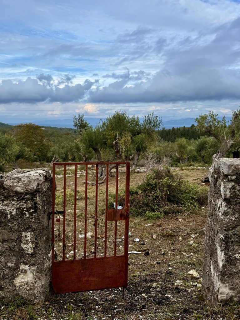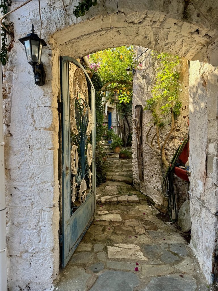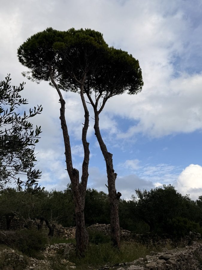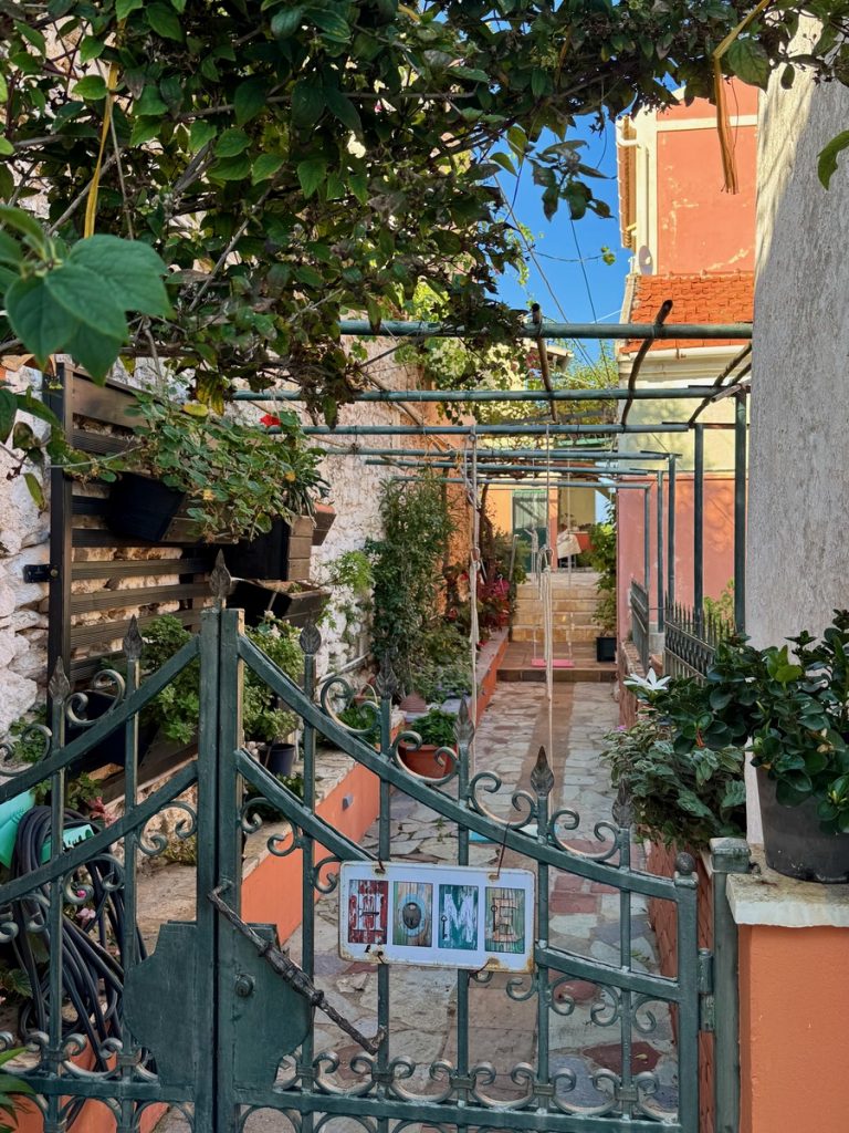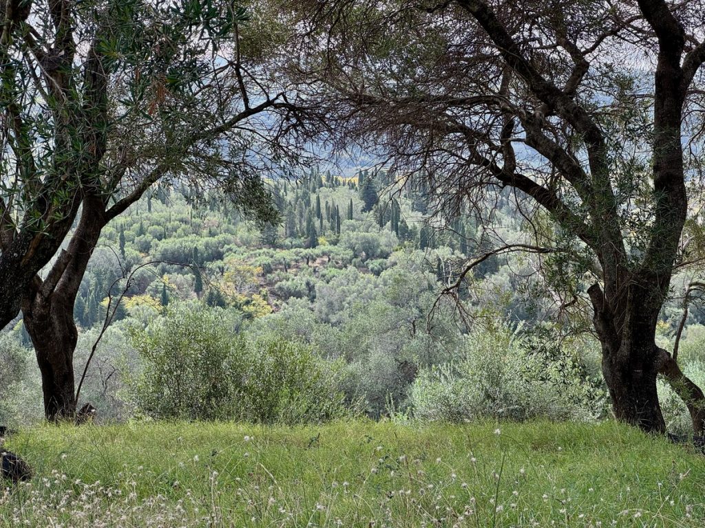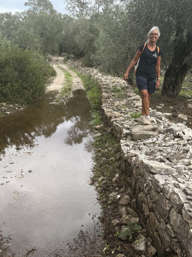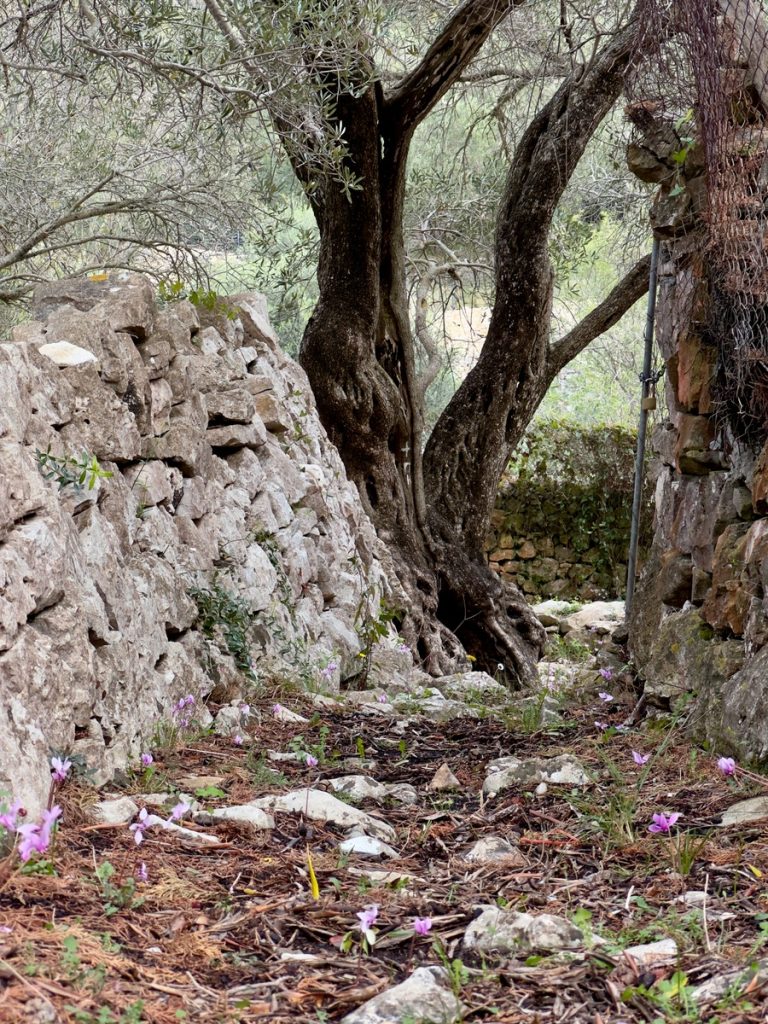 Nachdem wir die Insel im Süden umrundet haben, laufen wir noch eine Seemeile an der Ostküste „zurück“ Richtung Norden. Für morgen ist schlechtes Wetter mit Regen, Gewittern und Starkwind aus Süd vorhergesagt. Hier unten an der Südspitze der Insel gibt es eine tiefe Bucht, die nur nach Norden geöffnet ist und uns vor Anker daher perfekten Schutz bieten sollte. Als wir einlaufen, liegt nur ein weiteres Boot hier vor Anker. Wir legen uns mit genügend Abstand und frühstücken erstmal. Hinter unserem Heck ist eine Pier erkennbar, die mit Flatterband abgesperrt ist. Ein Blick in die Luftaufnahme bei Navily bestätigt unsere Vermutung: Hier legen Flottillen an. Sollte auch heute eine kommen, würden sie ihren Anker wohl unter unser Heck legen wollen. Wir holen den Anker nochmals auf und setzen ihn 20 Meter weiter entfernt. Zusätzlich hängen wir wieder das Reitgewicht ein, damit sich unser Schwoikreis etwas verkleinert. Mit 22 Metern Kette bei 6 Meter Wassertiefe fühlen wir uns auf diese Weise sicher. Mit dem Dinghi setzen wir über zu einer kleinen Pier. Im Sommer gibt es hier einige Gastronomie und einen Campingplatz. Jetzt liegt bereits alles im Winterschlaf und wirkt trotzdem idyllisch. Kein Vergleich mit den Touristenorten auf Korfu. Wir sind bereits verliebt in diese Insel! Auf kleinen Straßen und Feldwegen wandern wir durch Jahrhunderte alte Olivenhaine, vorbei an verfallenen Kirchen (auf Paxos soll es bei ca. 2.500 Einwohnern 64 Kirchen geben) und hübschen Ferienhäusern. Hier findet man keine Hotelburgen. Alles ist auf gehobenen Individualtourismus ausgerichtet. Überall sehen wir gepflegte Gärten und pittoreske Häuser, sogar die Katzen scheinen hübscher zu sein, als im sonstigen uns bekannten Griechenland. Die Insel ist zudem geprägt von zahllosen Steinmauern, die die Olivenhaine abgrenzen, die Terrassen stützen und selbst um die Grundstücke der Häuser in alter Tradition neu errichtet wurden. An Steinen scheint es hier nicht zu mangeln, die Felder bestehen quasi aus ihnen – es ist schon verwunderlich, wie die Olivenbäume da überhaupt Platz für ihre Wurzeln finden!