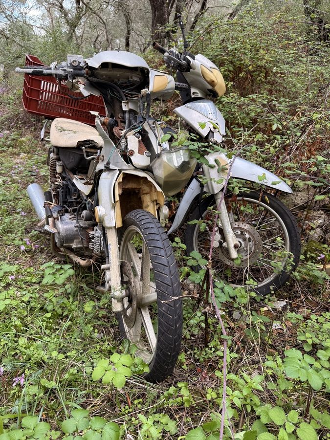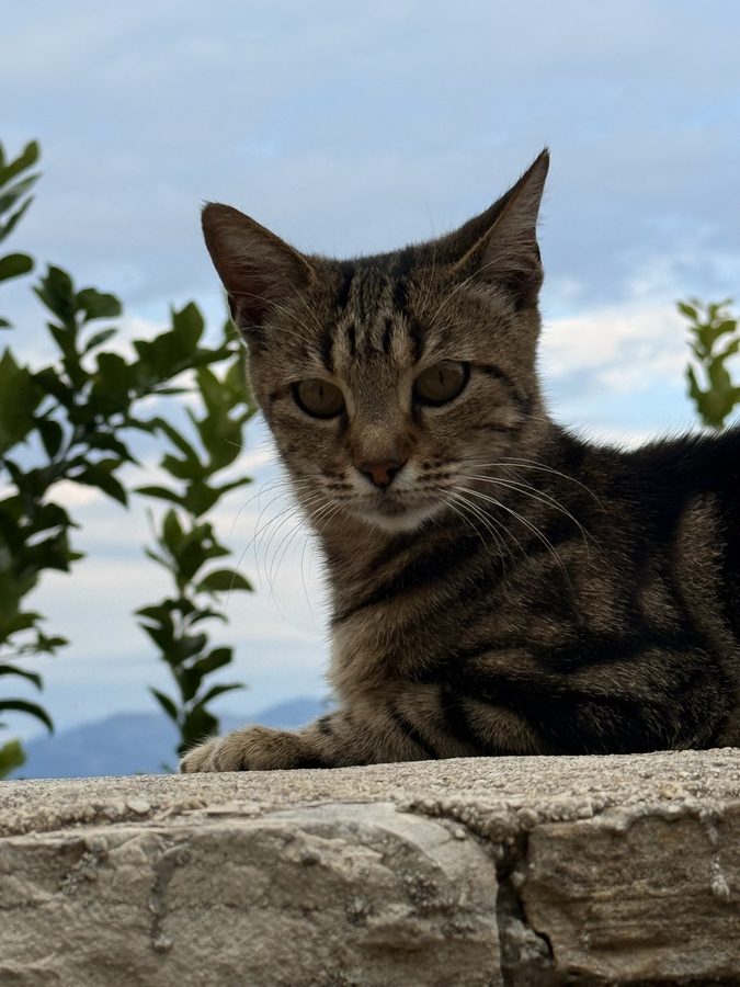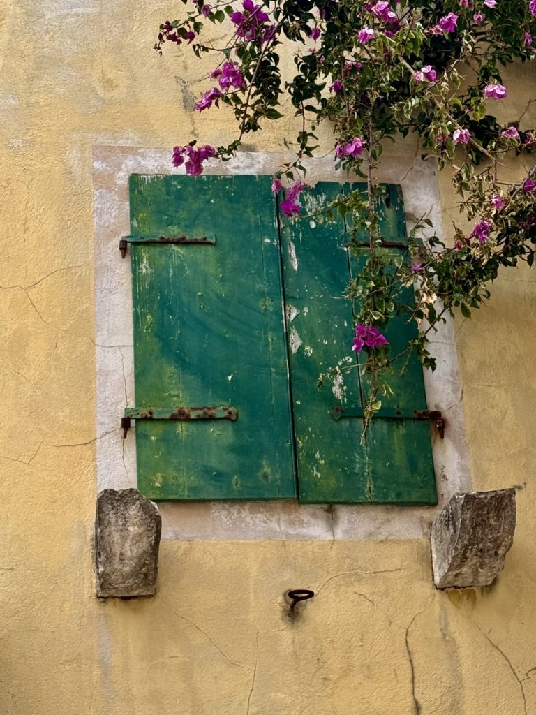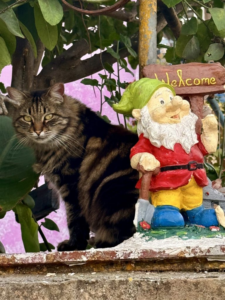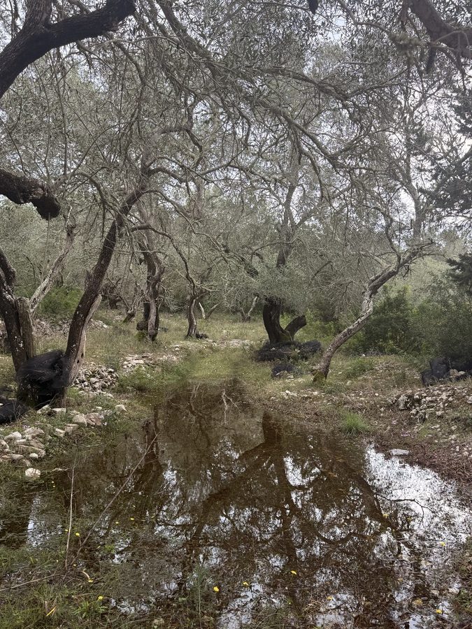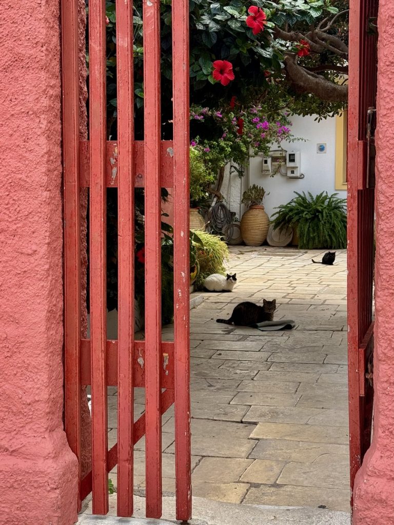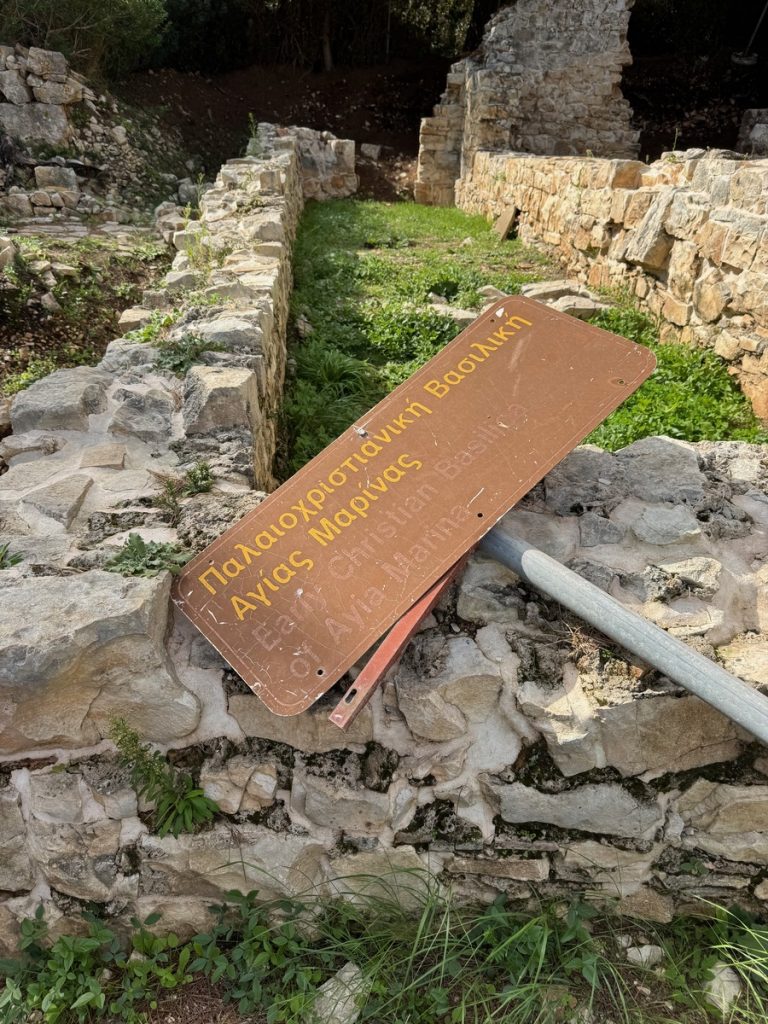 Nachdem wir die Insel im Süden umrundet haben, laufen wir noch eine Seemeile an der Ostküste „zurück“ Richtung Norden. Für morgen ist schlechtes Wetter mit Regen, Gewittern und Starkwind aus Süd vorhergesagt. Hier unten an der Südspitze der Insel gibt es eine tiefe Bucht, die nur nach Norden geöffnet ist und uns vor Anker daher perfekten Schutz bieten sollte. Als wir einlaufen, liegt nur ein weiteres Boot hier vor Anker. Wir legen uns mit genügend Abstand und frühstücken erstmal. Hinter unserem Heck ist eine Pier erkennbar, die mit Flatterband abgesperrt ist. Ein Blick in die Luftaufnahme bei Navily bestätigt unsere Vermutung: Hier legen Flottillen an. Sollte auch heute eine kommen, würden sie ihren Anker wohl unter unser Heck legen wollen. Wir holen den Anker nochmals auf und setzen ihn 20 Meter weiter entfernt. Zusätzlich hängen wir wieder das Reitgewicht ein, damit sich unser Schwoikreis etwas verkleinert. Mit 22 Metern Kette bei 6 Meter Wassertiefe fühlen wir uns auf diese Weise sicher. Mit dem Dinghi setzen wir über zu einer kleinen Pier. Im Sommer gibt es hier einige Gastronomie und einen Campingplatz. Jetzt liegt bereits alles im Winterschlaf und wirkt trotzdem idyllisch. Kein Vergleich mit den Touristenorten auf Korfu. Wir sind bereits verliebt in diese Insel! Auf kleinen Straßen und Feldwegen wandern wir durch Jahrhunderte alte Olivenhaine, vorbei an verfallenen Kirchen (auf Paxos soll es bei ca. 2.500 Einwohnern 64 Kirchen geben) und hübschen Ferienhäusern. Hier findet man keine Hotelburgen. Alles ist auf gehobenen Individualtourismus ausgerichtet. Überall sehen wir gepflegte Gärten und pittoreske Häuser, sogar die Katzen scheinen hübscher zu sein, als im sonstigen uns bekannten Griechenland. Die Insel ist zudem geprägt von zahllosen Steinmauern, die die Olivenhaine abgrenzen, die Terrassen stützen und selbst um die Grundstücke der Häuser in alter Tradition neu errichtet wurden. An Steinen scheint es hier nicht zu mangeln, die Felder bestehen quasi aus ihnen – es ist schon verwunderlich, wie die Olivenbäume da überhaupt Platz für ihre Wurzeln finden!